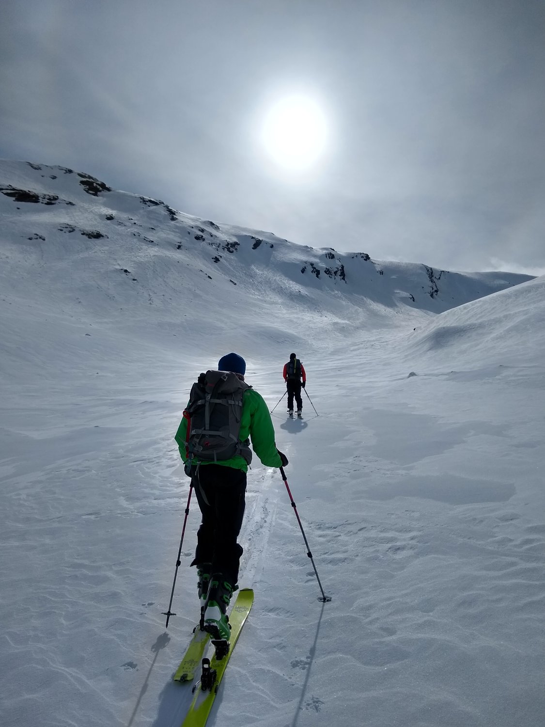 Ohne Sonne nicht aufgefirnt. Oberhal von Meiggeru die Ski ca. 10min tragen