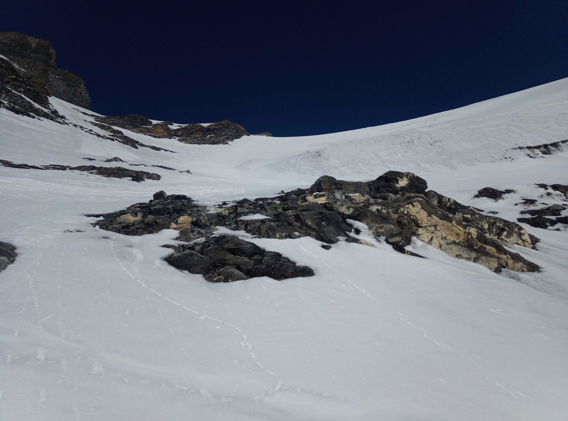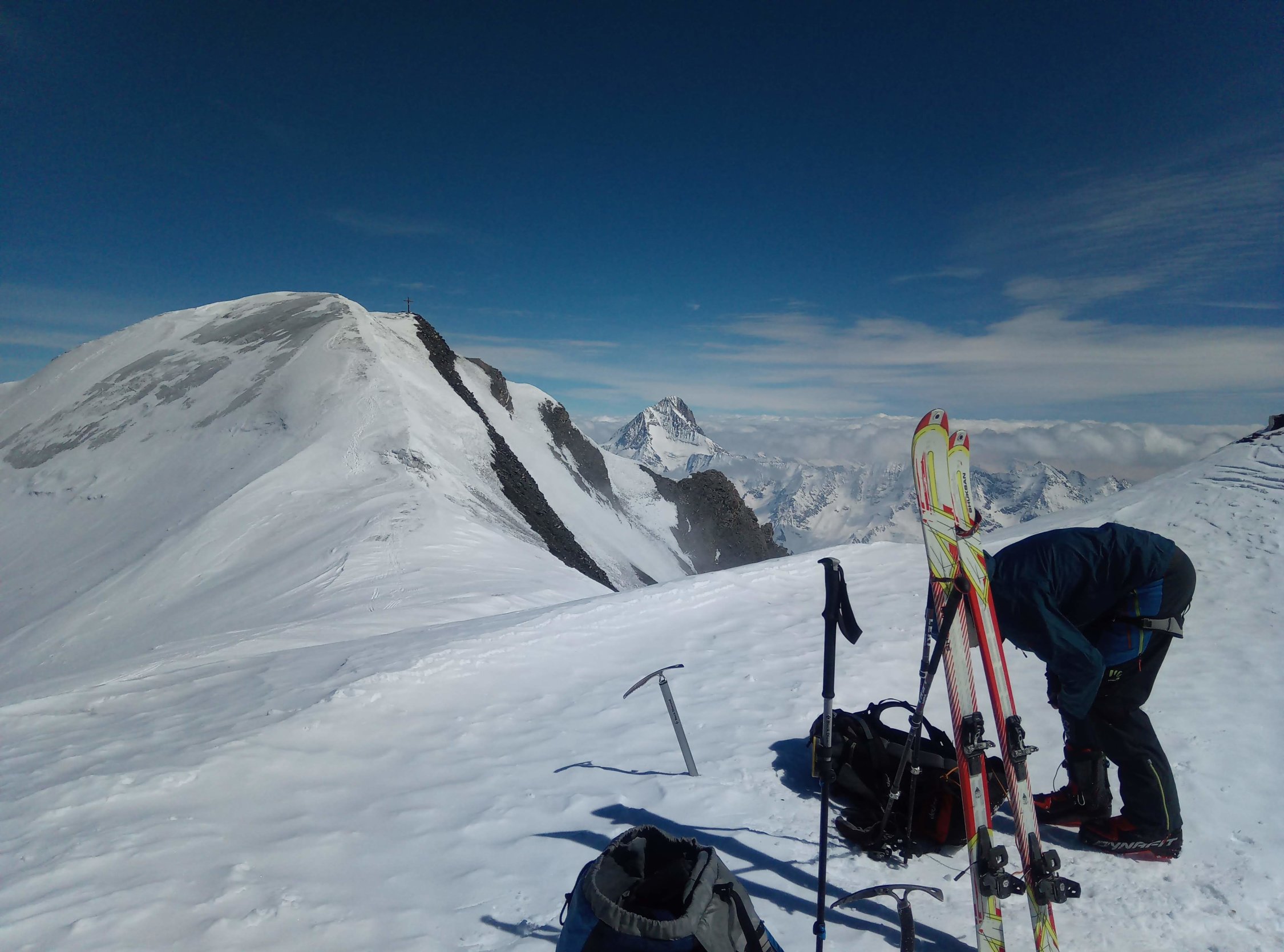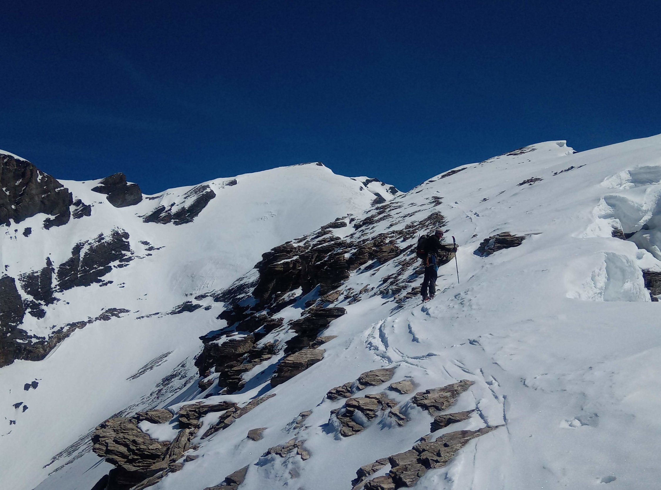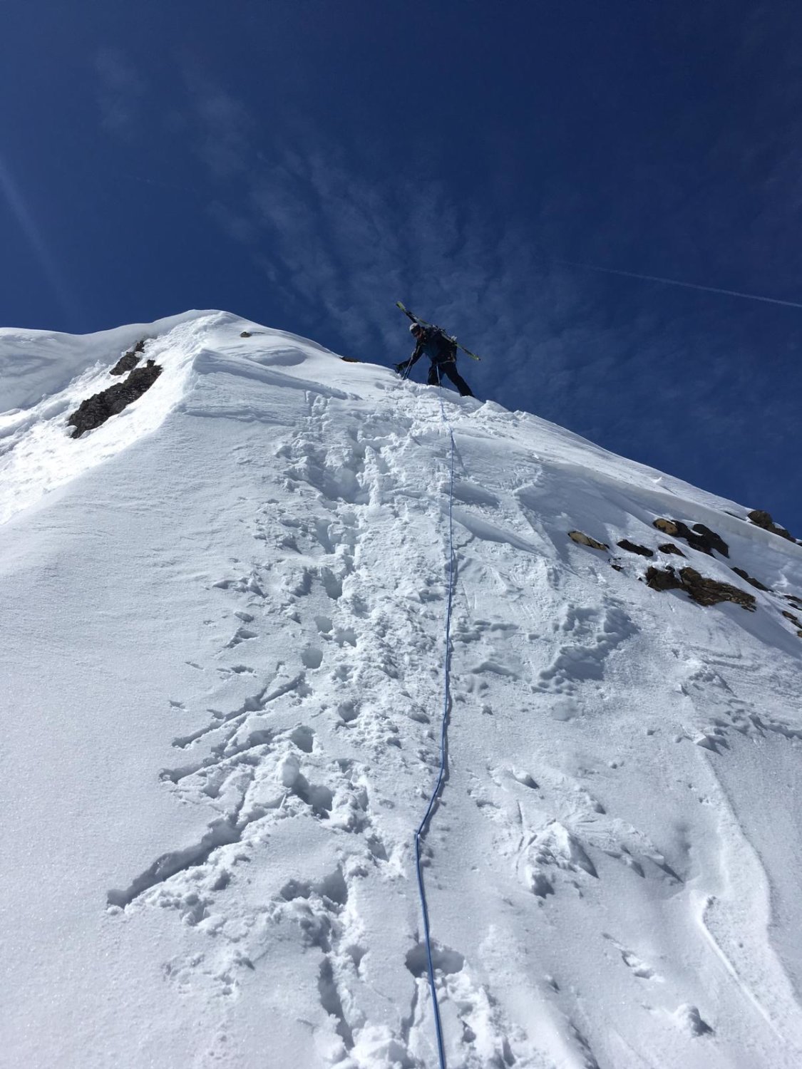 Die Gipfelflanke wir rasch wieder ausapern und mehr Blankeis hervorkommen. Darum Gipfelaufstieg wohl über Ostern nur mit Steigeisen sinnvoll und die Abfahrt nur im von oben gesehenen rechten Bereich der Westflanke gut. Über die Aufstiegsvariante mit Steigeisen wird die nächsten Tage eine Abfahrt kaum möglich sein.