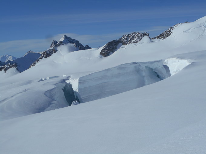 Hier eine interessante direkte Variante von der Konkordiahütte: Bei 3000m auf dem Grossen Aletschfirn rechts hoch zum Felssporn 3287m. Bei diesem links vorbei. Die Spaltenzone zwischen 3300m und 3600m sollte unbedingt am Seil gemacht werden. Siehe Fotos. Bei 3700m gelangt man auf die Aufstiegsroute von der Hollandiahütte her.