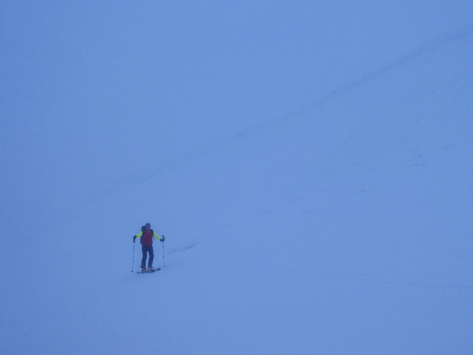 Whiteout (sprich Nebelsuppe) beim Start am frühen Morgen. Später zögerliche Aufhellung und weiter oben strahlender Sonnenschein. Sehr gute Verhältnisse auf der ganzen Strecke: tragende, durchgehende Schneedecke. Auch der Aufstieg von der Fuorcla Chamuotsch über den Südostgrat lässt sich mit Ausnahme einer kurzen Tragpassage mit Ski bewältigen. -6° C auf dem Gipfel. Abfahrt auf tragender Schneedecke direkt über die Südwestflanke von hart bis Sulz. Stimmungsvolle Aufhellung, schöner Rundblick. Weiter südlich hingen die Wolken und der Nebel bedeutend zäher an den Berggipfeln.