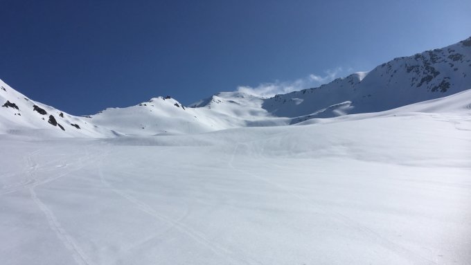Etwa in der Hälfte, beim Eisenkreuz, wechsel nach rechts über die Kuppe in ein Nebentälchen, das weiter unten in eine der steilen Bachrinnen mündet. Dort in 35 Grad steilem Gelände die kaum mit Lawinenaltschnee versehene Runse in bestem Sulz tragend bis zu unterst abfahren.