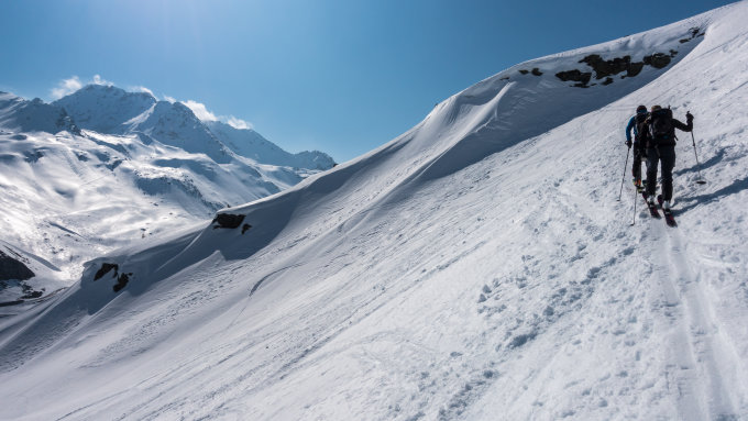 Start um 9 Uhr bei Tschuggen, Parkplatz übervoll. Sonnig, Richtung Süden Wolkenfelder. 4°, Schneedecke gefroren. Einfache Verhältnisse im Aufstieg, heute über den steilen Nordosthang. Verhältnisse in der Abfahrt: zuoberst pistenähnlich, zerfahrener Hartschnee, danach Pulver, meist windgepresst und nach dem Gipfelaufbau herrlicher Sulz bis zur Passstrasse.