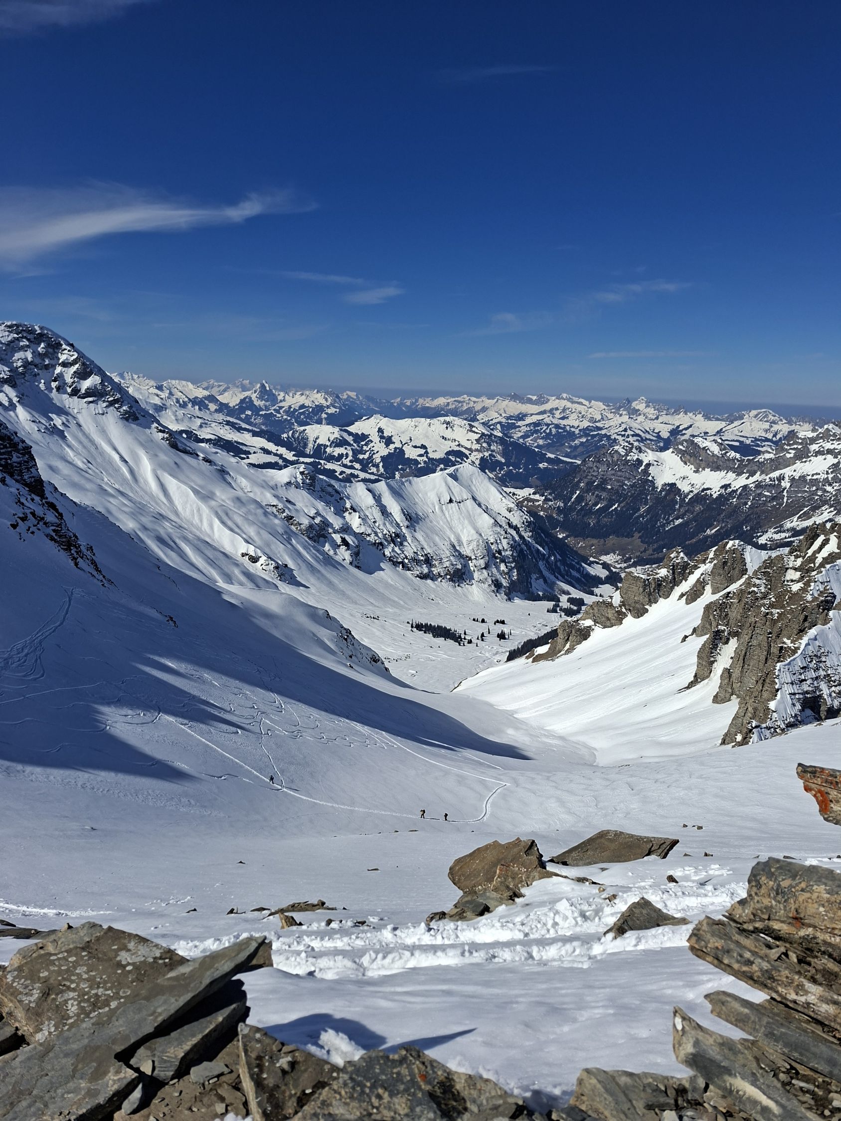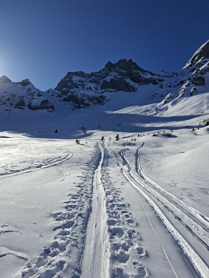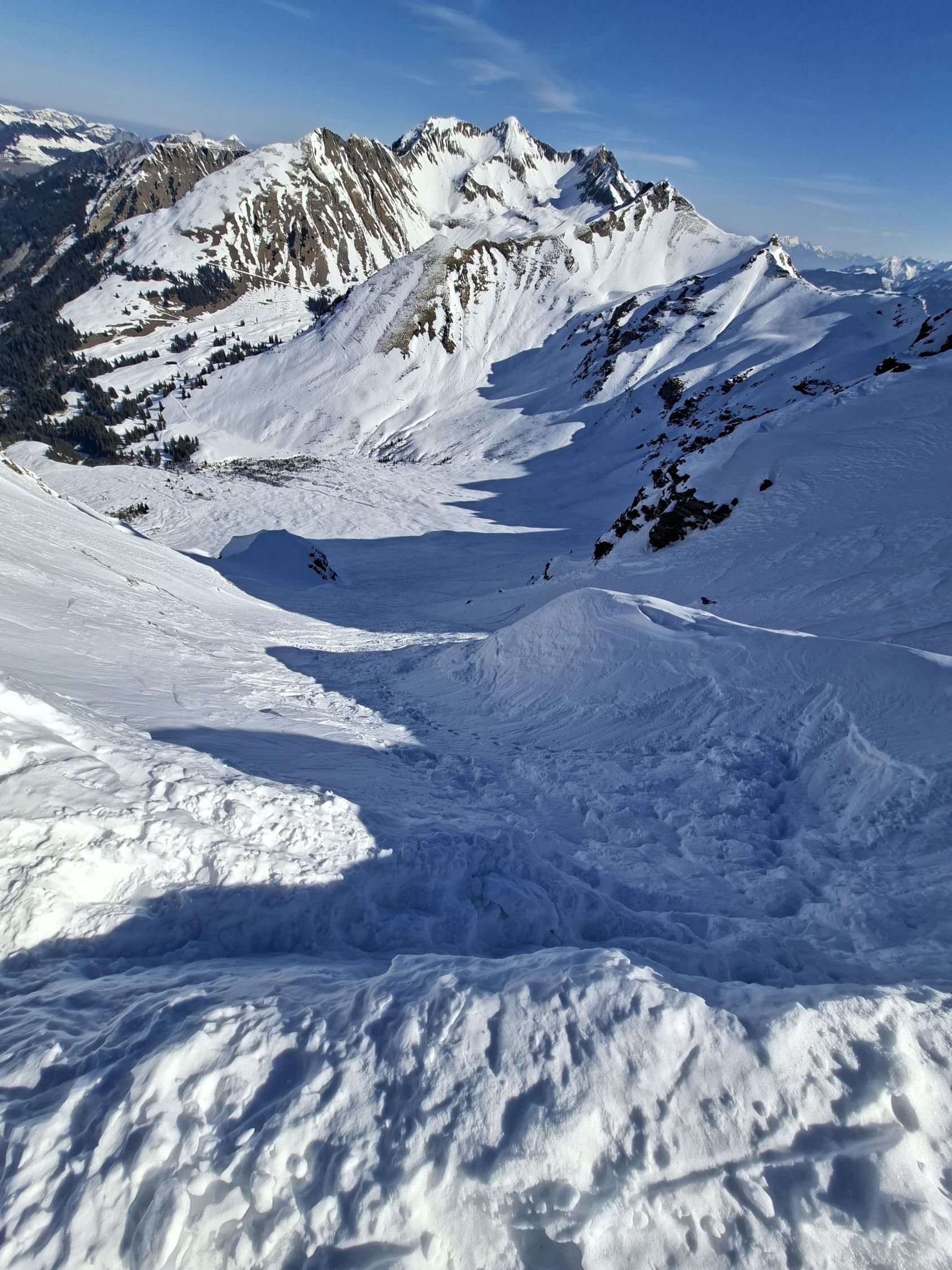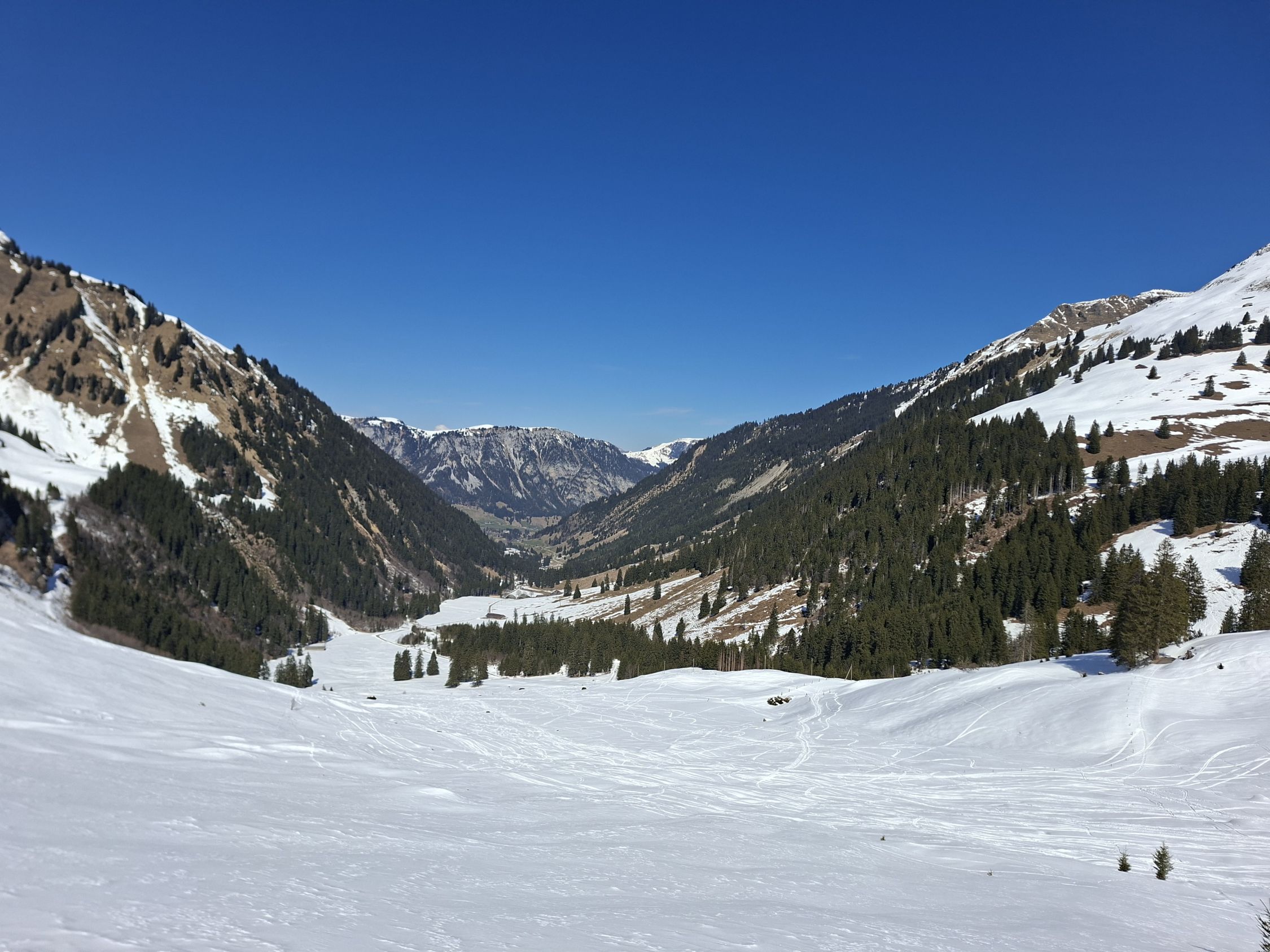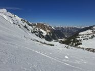 Abfahrt: Vom Landvogtehore bis zum Parkplatz ist der Schnee wechselhaft. Gipfelhang Pulver und Bruchharsch, Steilhang zum Steibode windbearbeiteter Pulver. Steibode meistens Bruchharsch.