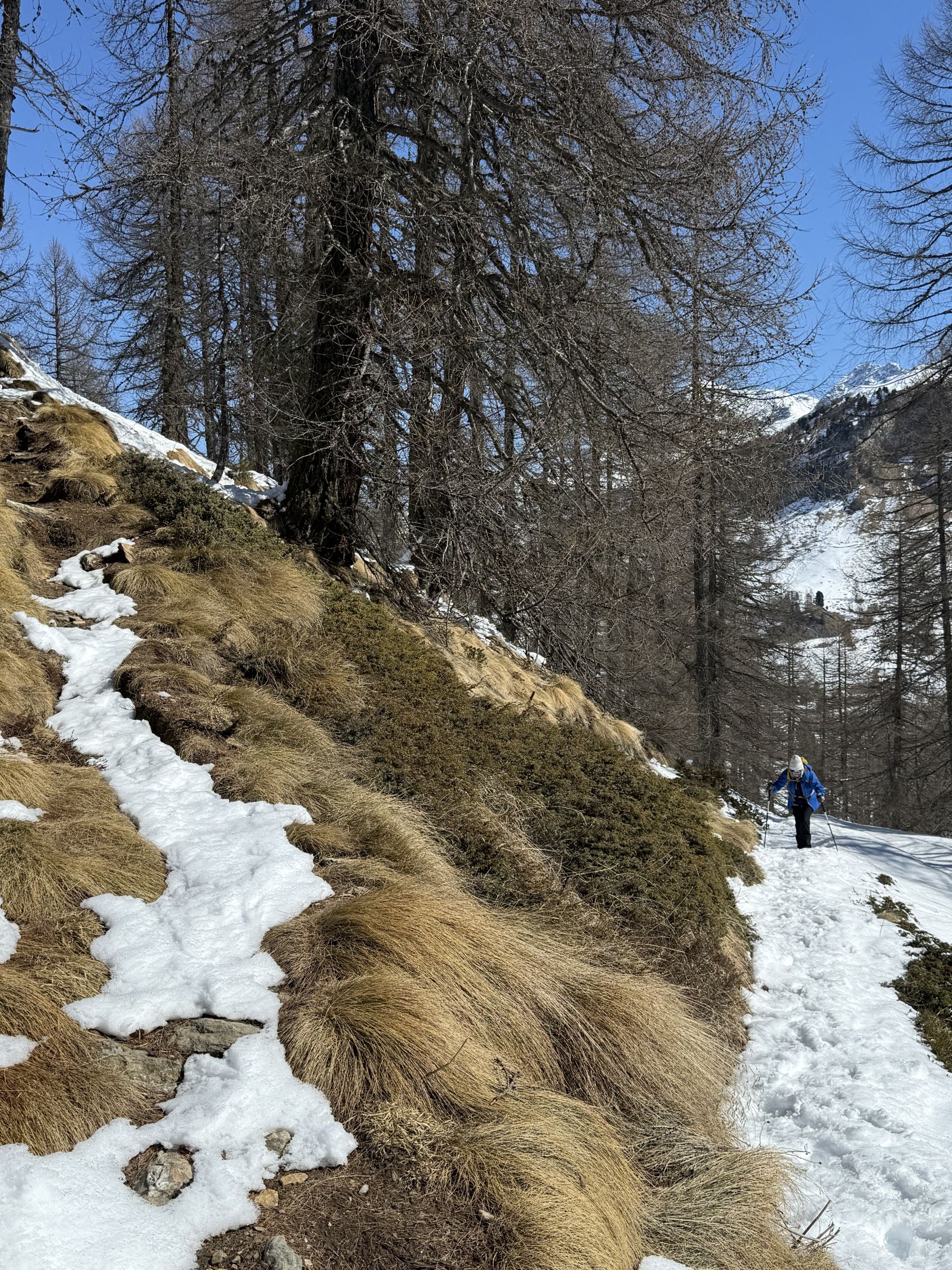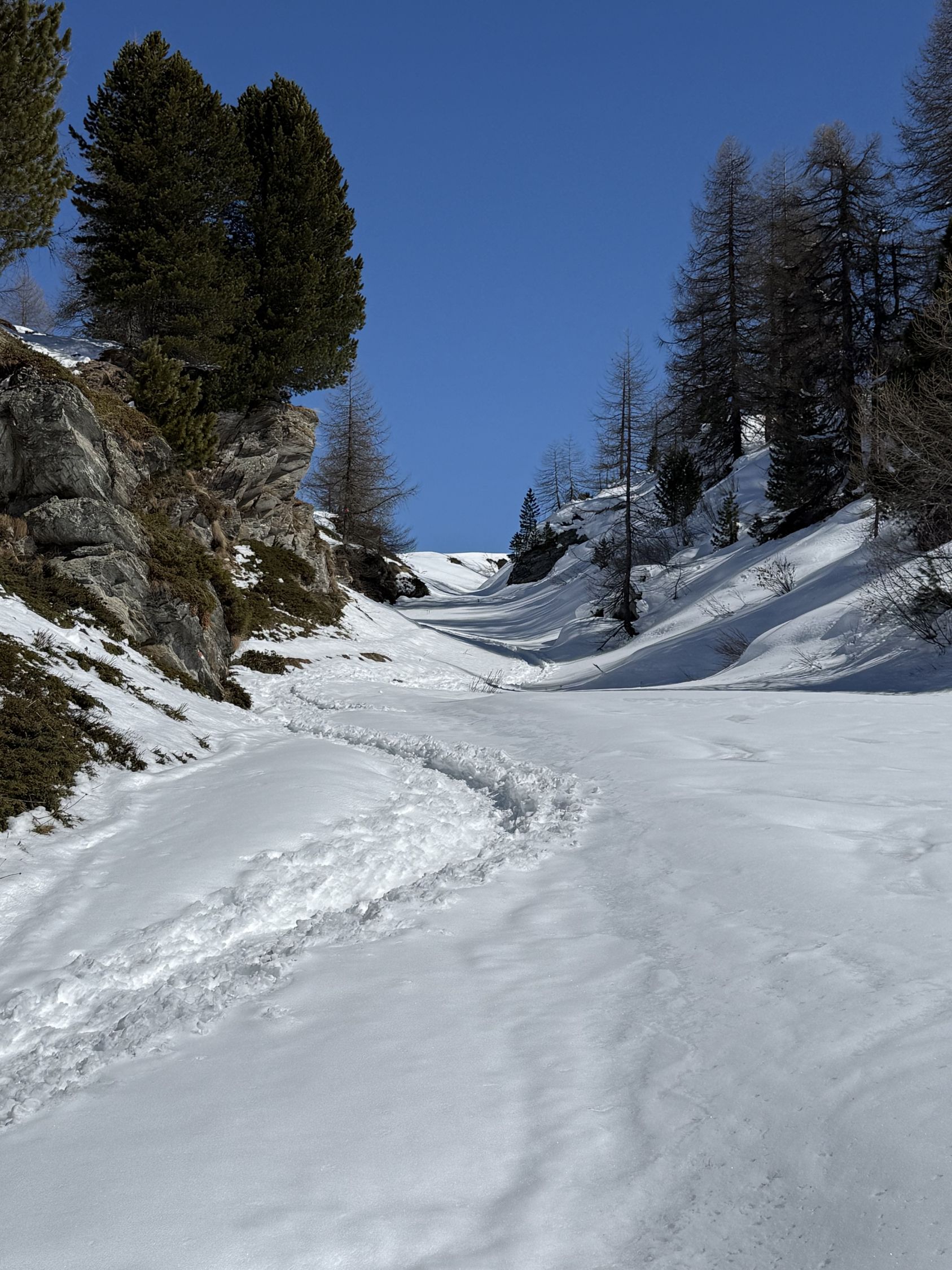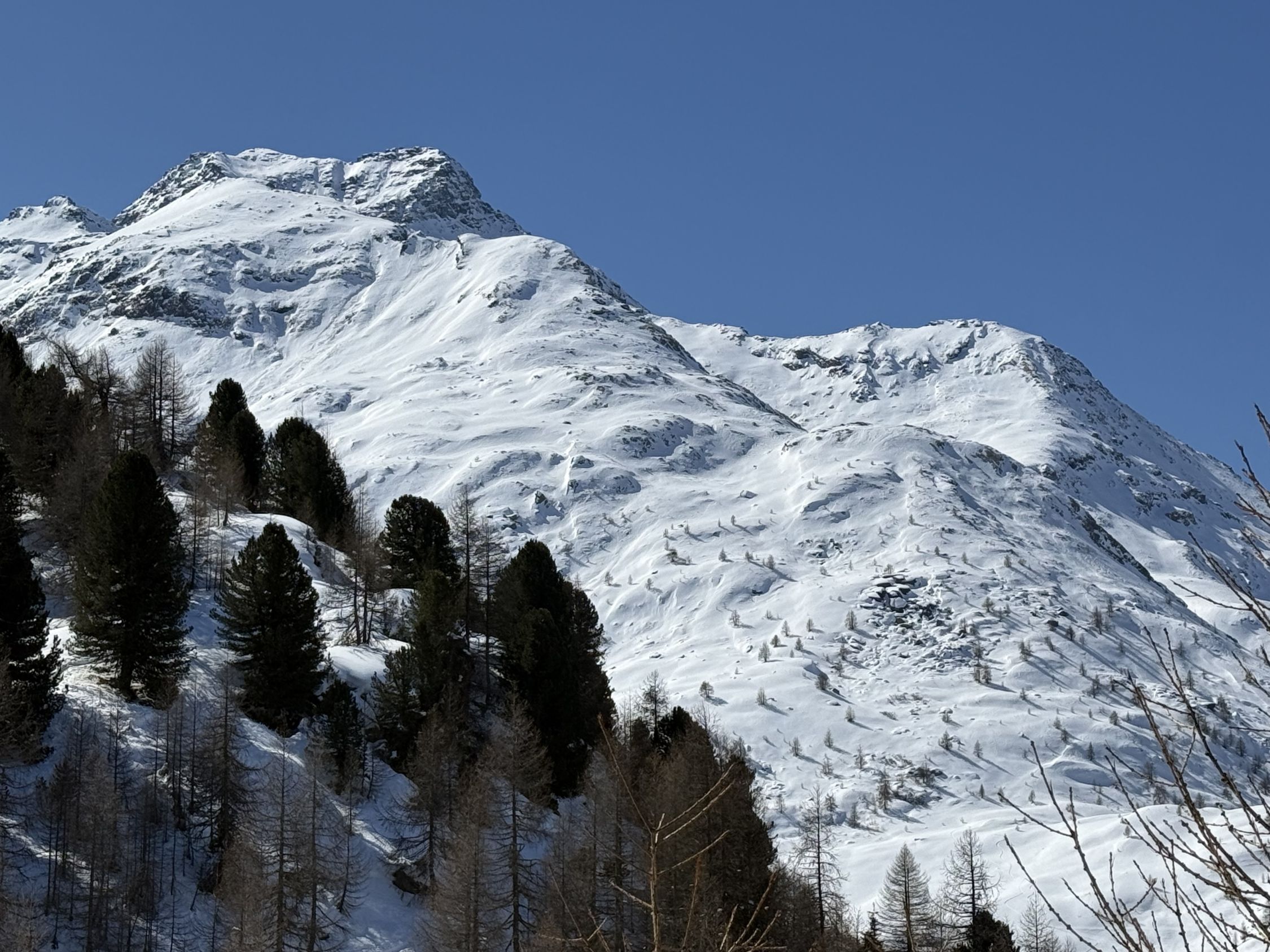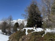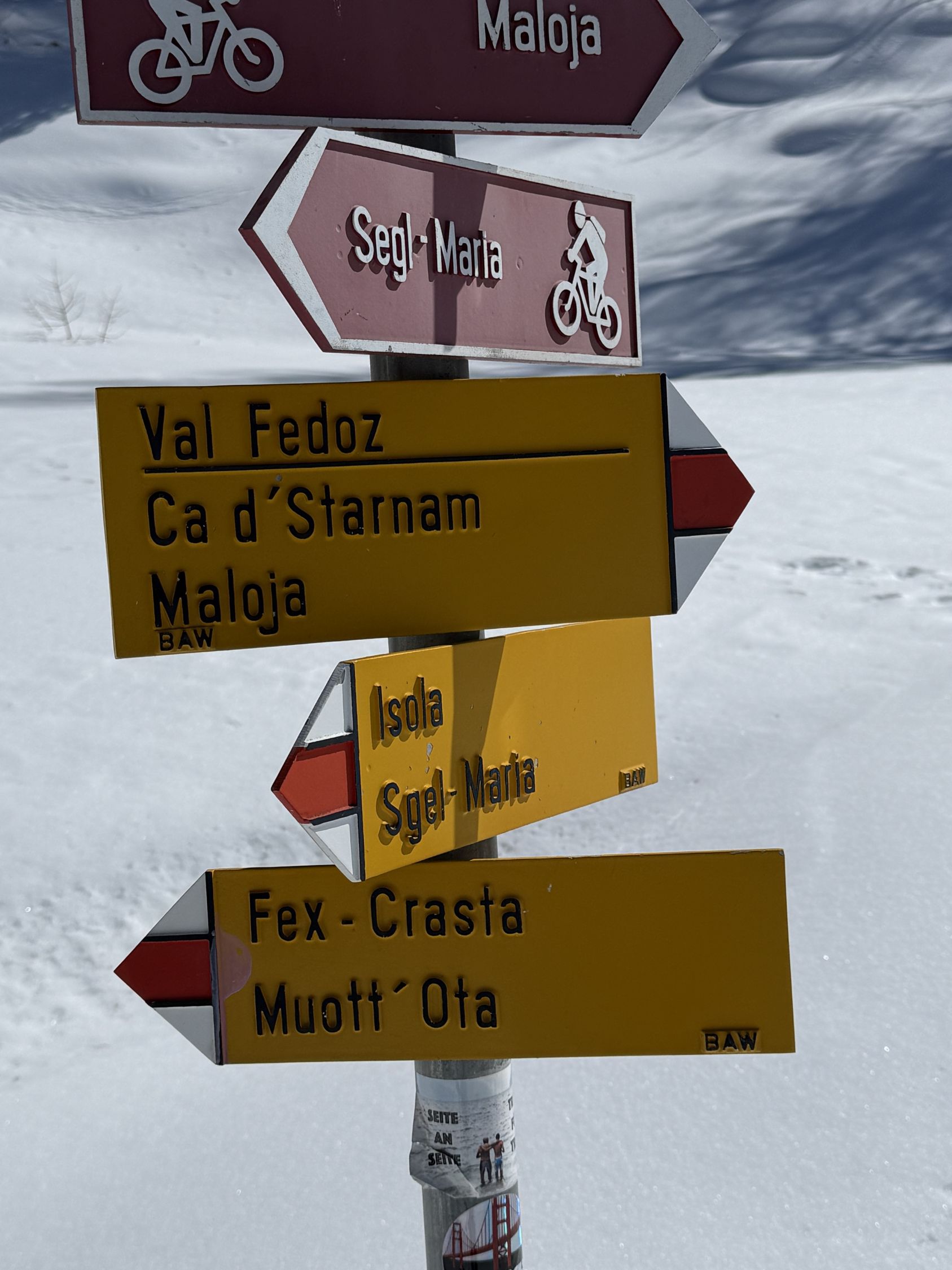 Rundtour über dem Silsersee Sils Maria - Muotta da Guvè - Crap da la Turba - Spuonda Laret, ÖV Tour, T3. Start Sils Maria Posta, 9.30, minus 3 Grad, windstill, blauer Himmel. Wir sind beim Hotel Waldhaus vorbei Richtung Vaüglia Fex und dann auf präpariertem Wanderweg bis Abzweigung Güvè Muotta da Güvè, Ab hier auf Schneeschuhspur bis Muotta da Güvè Punkt 2036. Nun in einem Bogen auf markierter Schneeschuhspur um den Muotta herum Richtung Crap da la Turba, am markanten felsigen Hügel vorbei und auf präparierter Piste bis Sils Maria. Alles ohne Schneeschuhe.