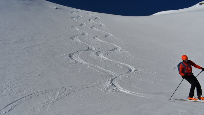 Die Obere Hälfte Pulverschnee ist leider nur noch 200 HM ab dem Gipfel