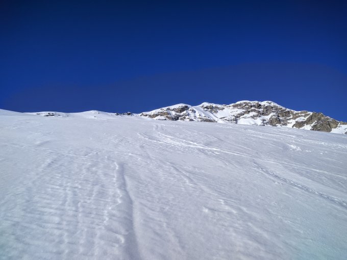 Anfellen direkt am Parkplatz Fermelberg, etwas feuchter Schnee ganz unten, ab ca. 1900 dann tragend gefroren. Schlüsselstelle am Sattel kann mit Ski begangen werden, ich persönlich ziehe tragen vor.