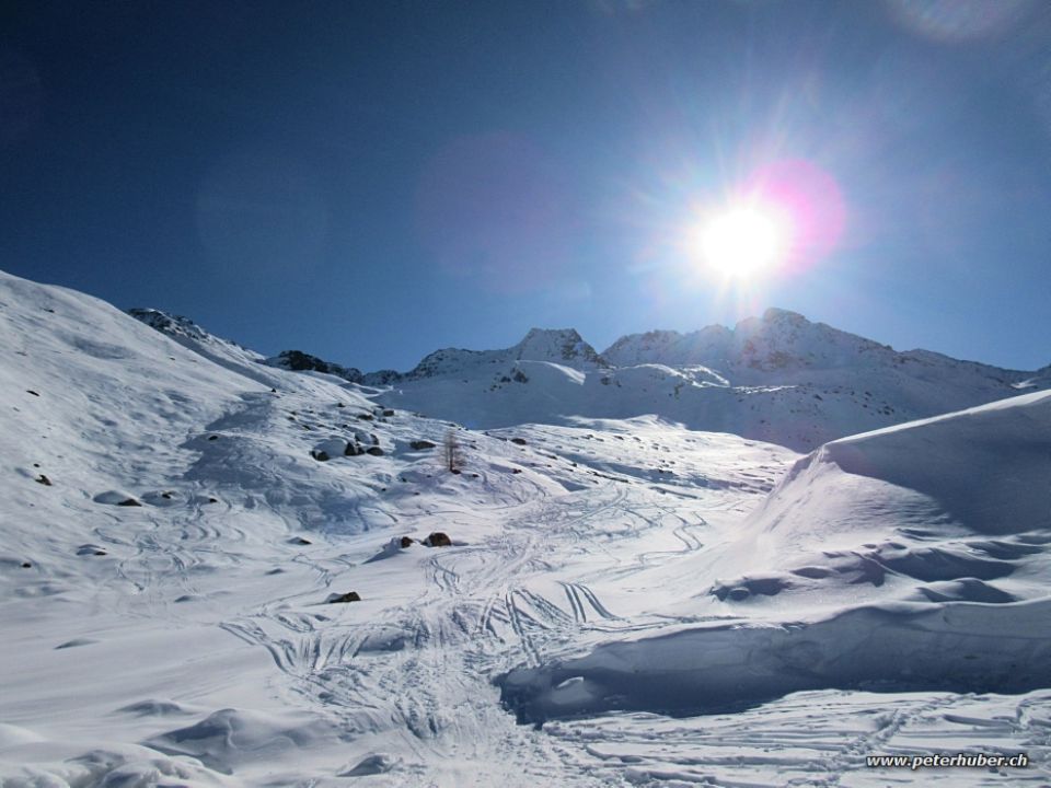 Abfahrt: Start Richtung Jöriseen. Der Bruchharsch war ziemlich übel. Alle paar Meter wechselte die Schneeart. Nach zirka 200 Hm Abfahrt entschieden wir uns, zurück zur Winterlücke aufzusteigen und über den Aufstieg abzufahren. Im oberen Teil erwischten wir in den Nordhängen schönen Pulverschnee. Ab 2400 m dann wieder Bruchharsch bis auf die Passstrasse hinunter.