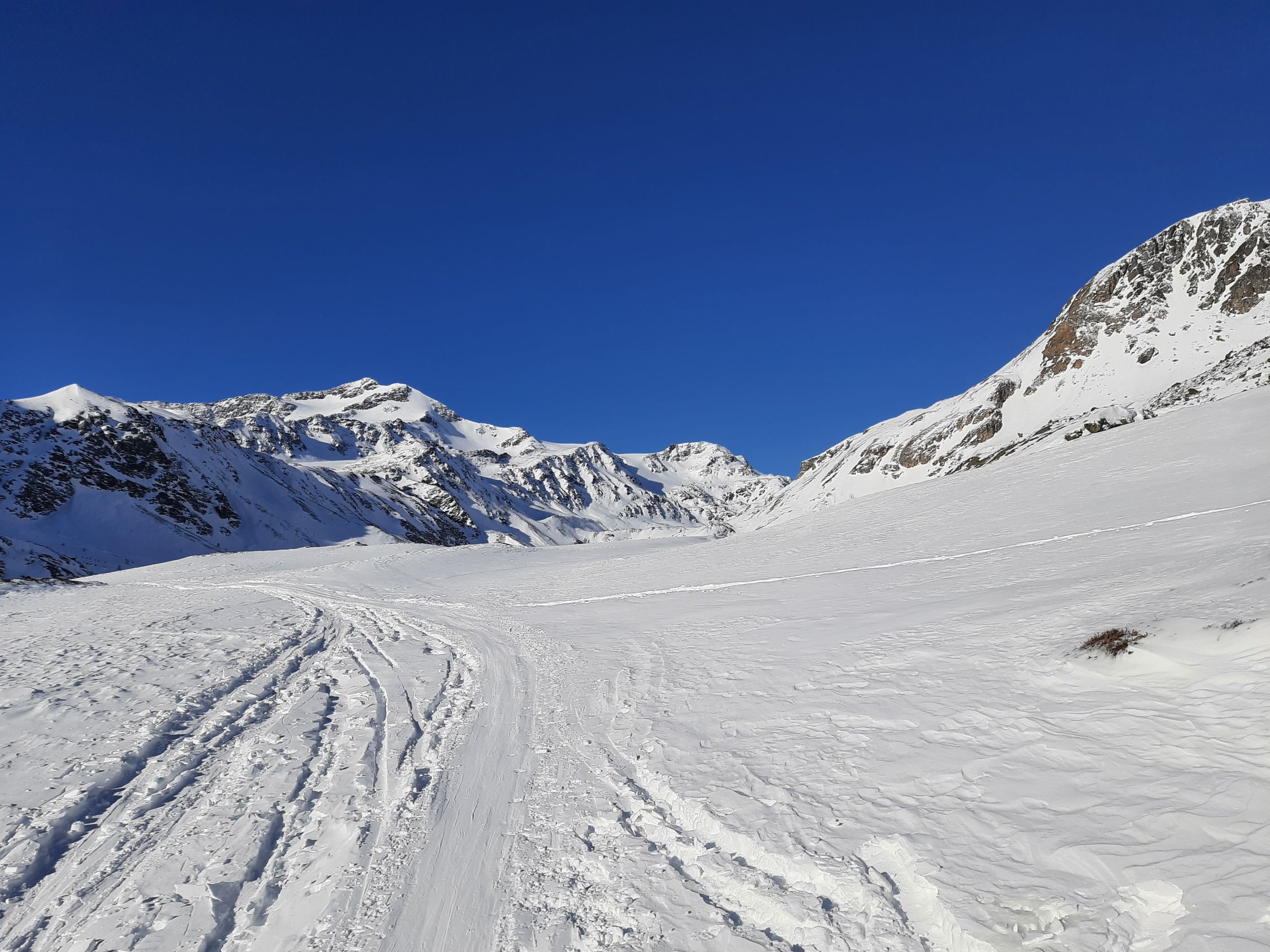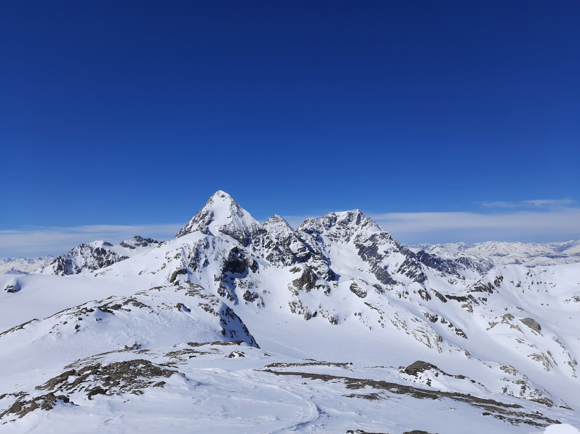 Langer Hatscher über den Zufallferner. Spur vorhanden. Der Schnee auf dem Gletscher war windgepresst mit Pulverflecken und Windgangeln. Toller Gipfeltag mit perfekter Fernsicht und kaum Wind. Im Tal schwerer Pulver teilweise mit Deckel. Insgesamt wenig Schnee im Gebiet.