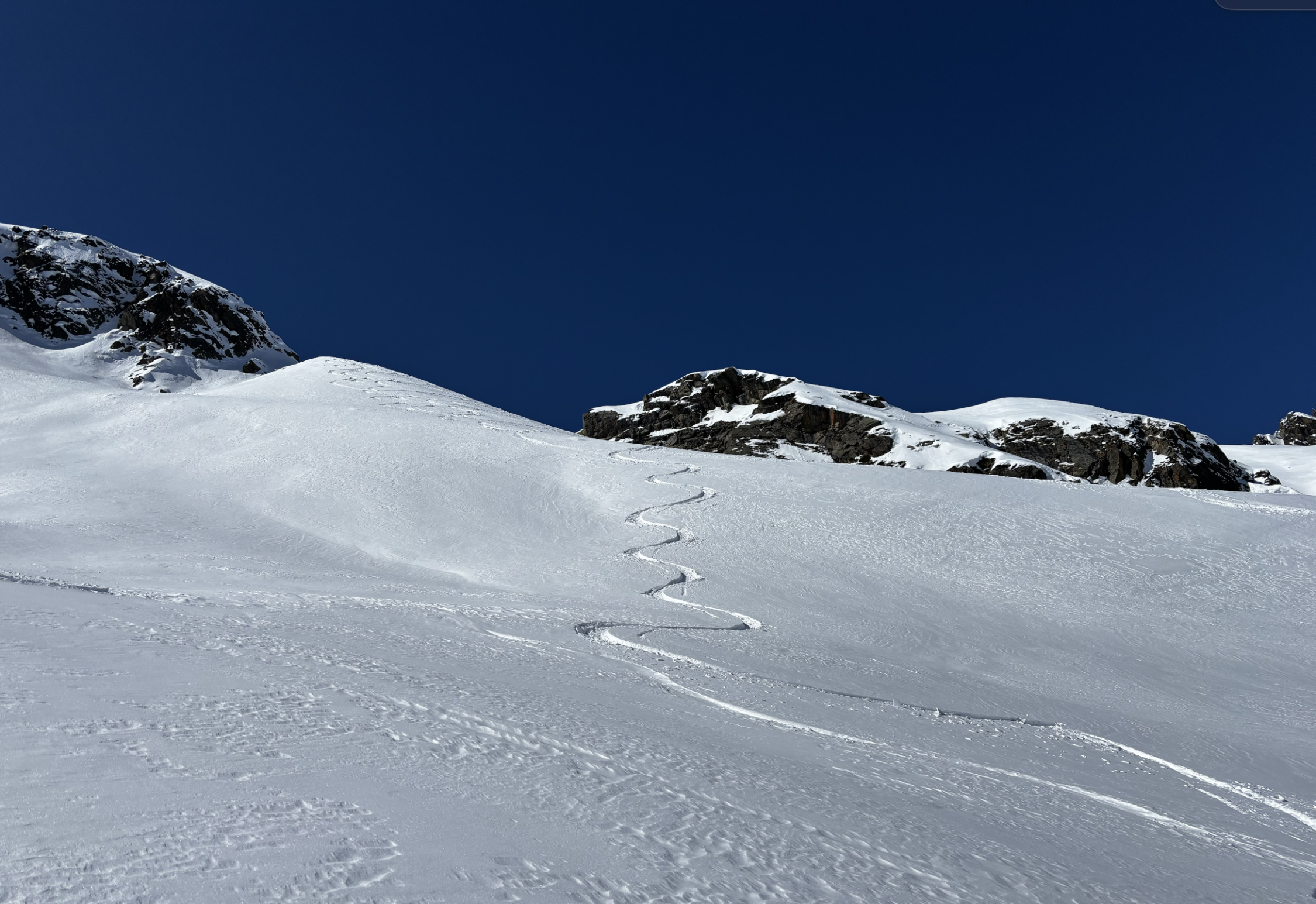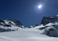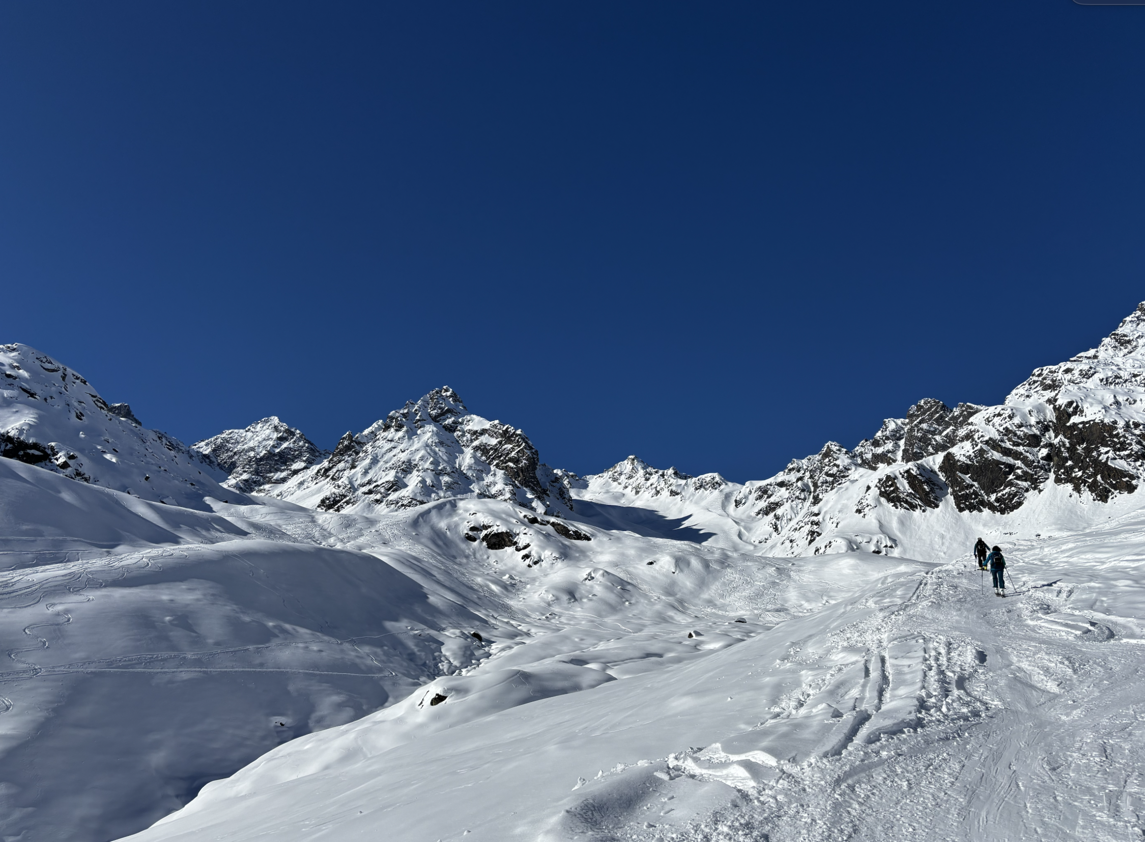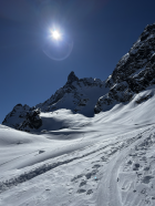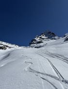 Mit der Vermuntbahn morgens um 8 Uhr los und ab Seespitz um 8:30 Uhr in einen herrlichen Wintertag gestartet. Die ersten Hänge zeigen schon an, dass die Tagestemperaturen dem Schnee etwas zusetzen - es ist hart und harschig. Die Abkürzung beim Kromerbach und links in Gehrichtung hinüber zu den moderat ansteigenden Schatthängen zahlt sich aus. Die Spur ist fein angelegt und nicht vereist. Der Übergang von der Seelücke auf den Gletscher ist gut mit guter Spur heute problemlos zu überwinden. Eine Dreiergruppe spurte die Flanke des Großen Seehorns bis fast in die Hälfte der Wand hinauf. Von der Seehornlücke bester Pulverschnee hinter bis zum Gegenanstieg auf die Schweizerlücke. Dort hat die Sonne die letzten 50 Hm die Spur recht vereisen lassen. Abfahrt Richtung Schweizergletscher und hinüber auf die Hänge vom Kromergletscher herab ebenfalls toll zu fahren, zumeist guter Pulverschnee und Platz für eigene Schwünge. Die letzten 200 Hm dann etwas durchwachsene Schneeverhältnisse zwischen aufweichendem Sulz, harschiger Schicht und Pulver in den sonnenabgeneigten Wellen und Hängen.