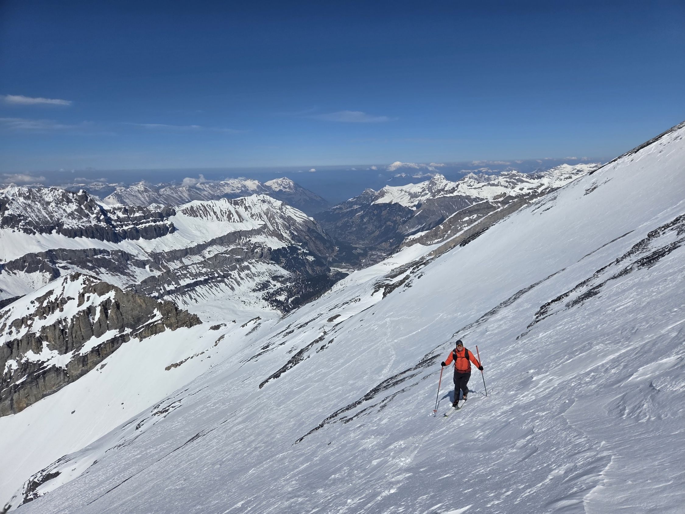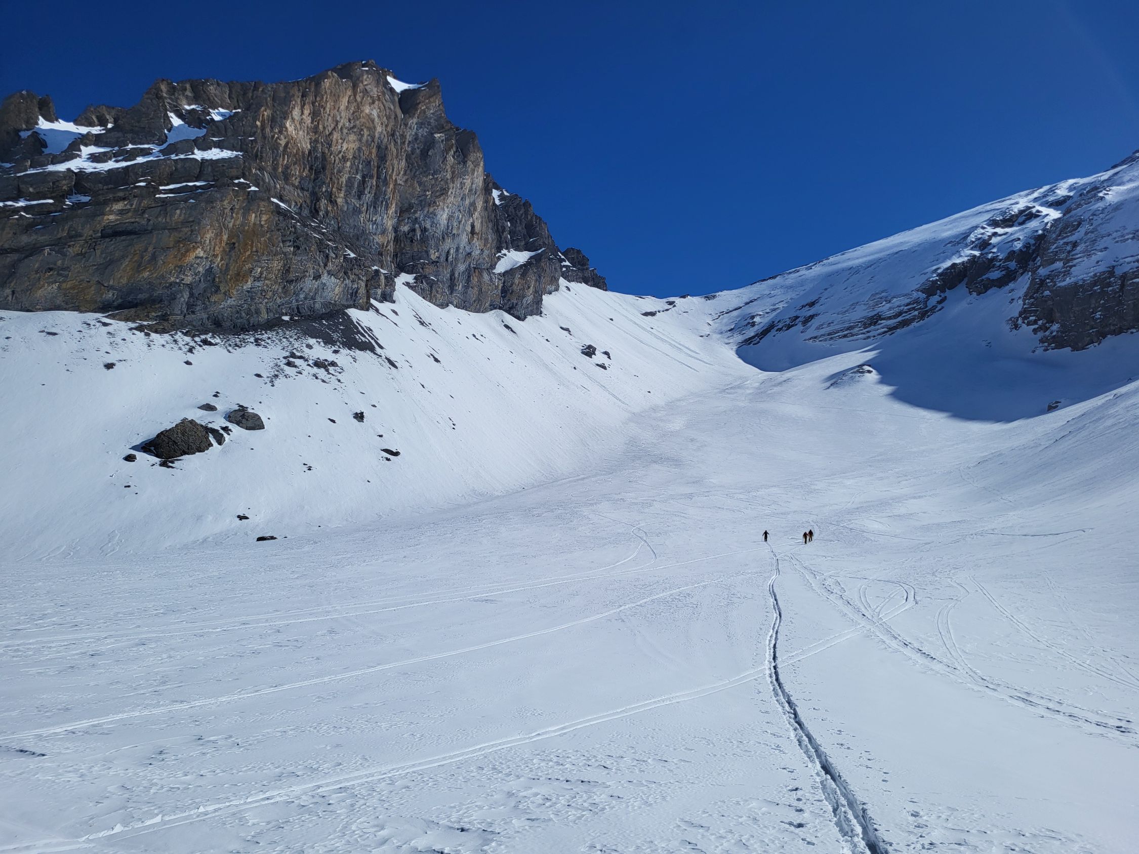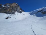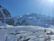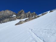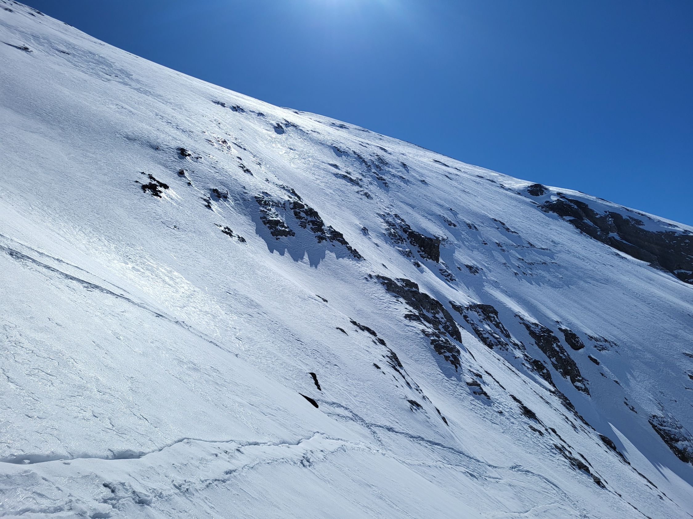 Der Schnee war sehr stark windbearbeitet und darum weder im Aufstieg als in der Abfahrt richtig gut. Wir konnten bis zum Skidepot unterhalb des Gipfels alles auf den Skis aufsteigen. Bereits im Aufstieg zum Rindersattel haben wir Harscheisen montiert, weil die Spur sehr rutschig war. Es war nirgends eisig, ober doch teilweise ziemlich hart. Ab dem Rindersattel war der Aufstieg anstregend, weil man immer aufpassen musste, dass man nicht wegrutscht (auch mit Harscheisen). In der Abfahrt sind wir wegen dem mühsamen Schnee wieder zum Rindersattel gequert, aber die Südhänge waren schon sehr nass.