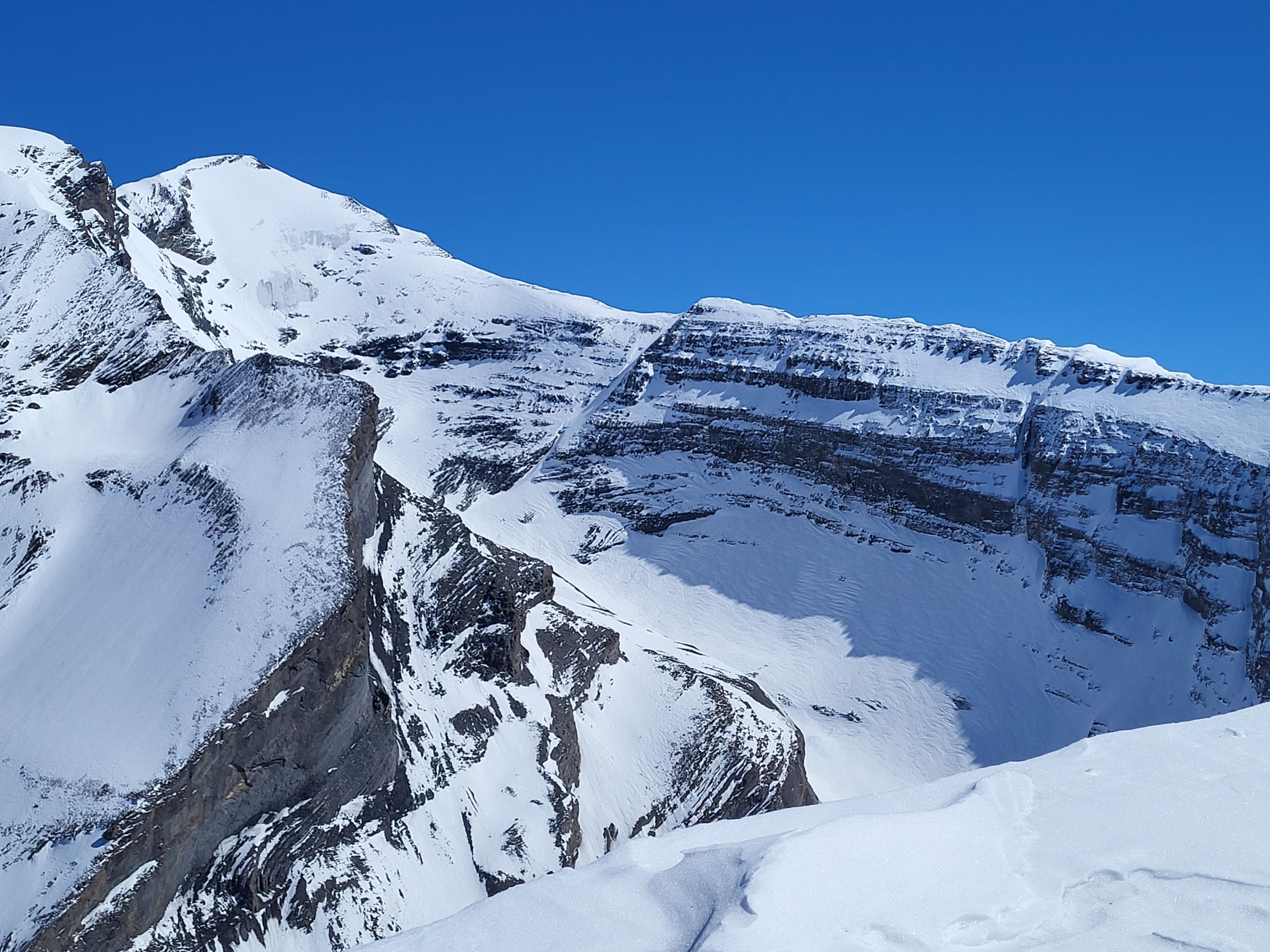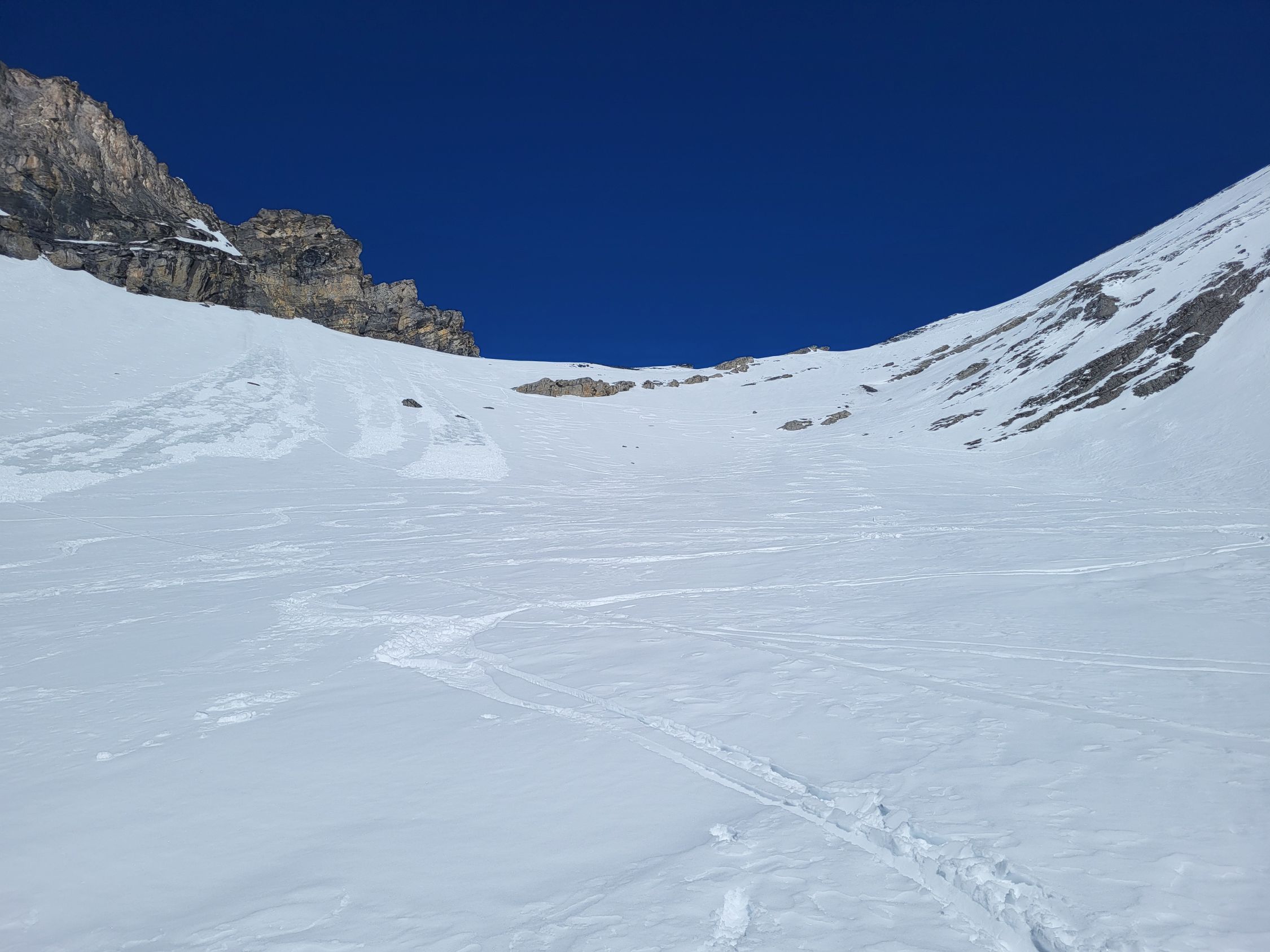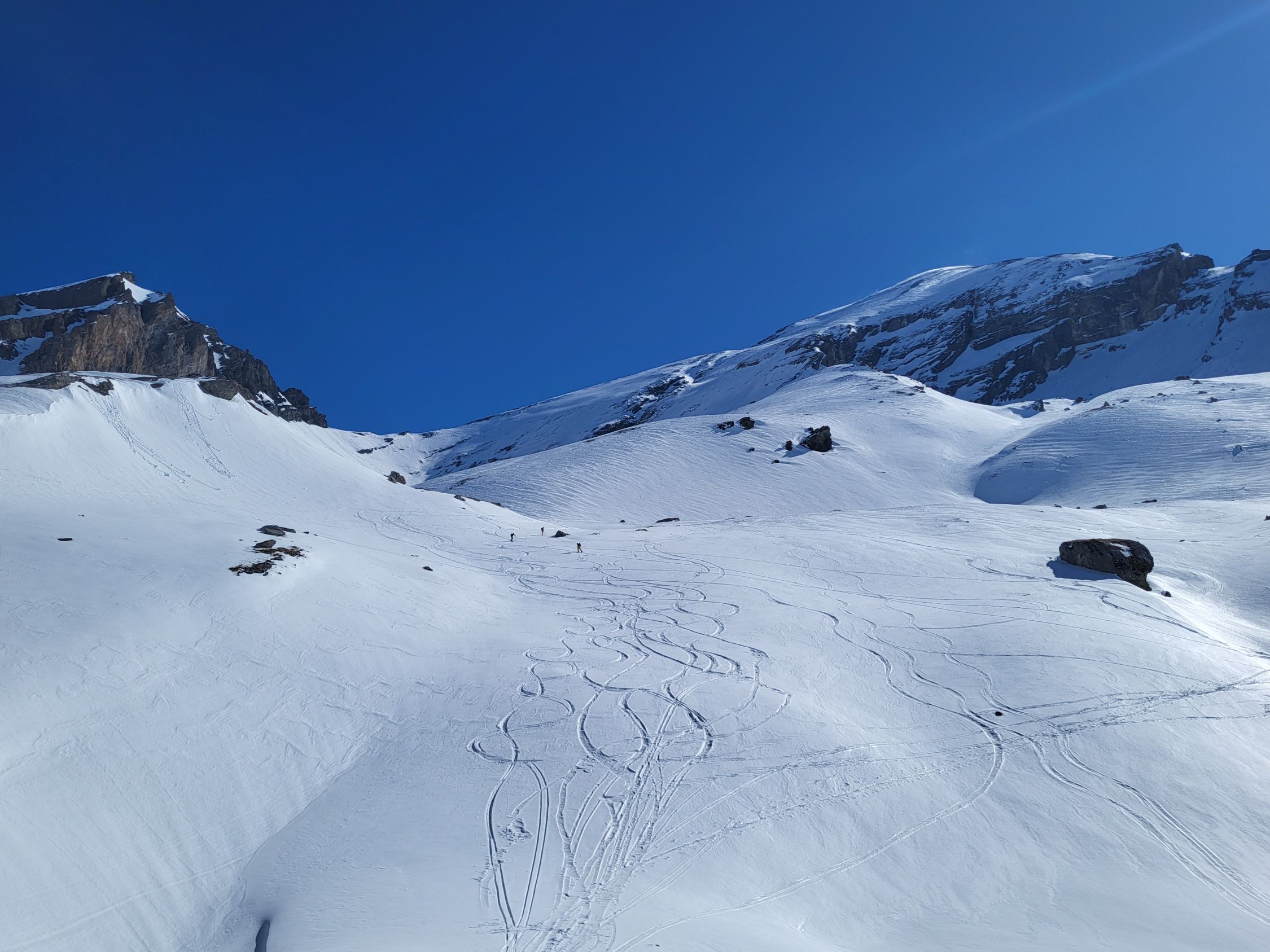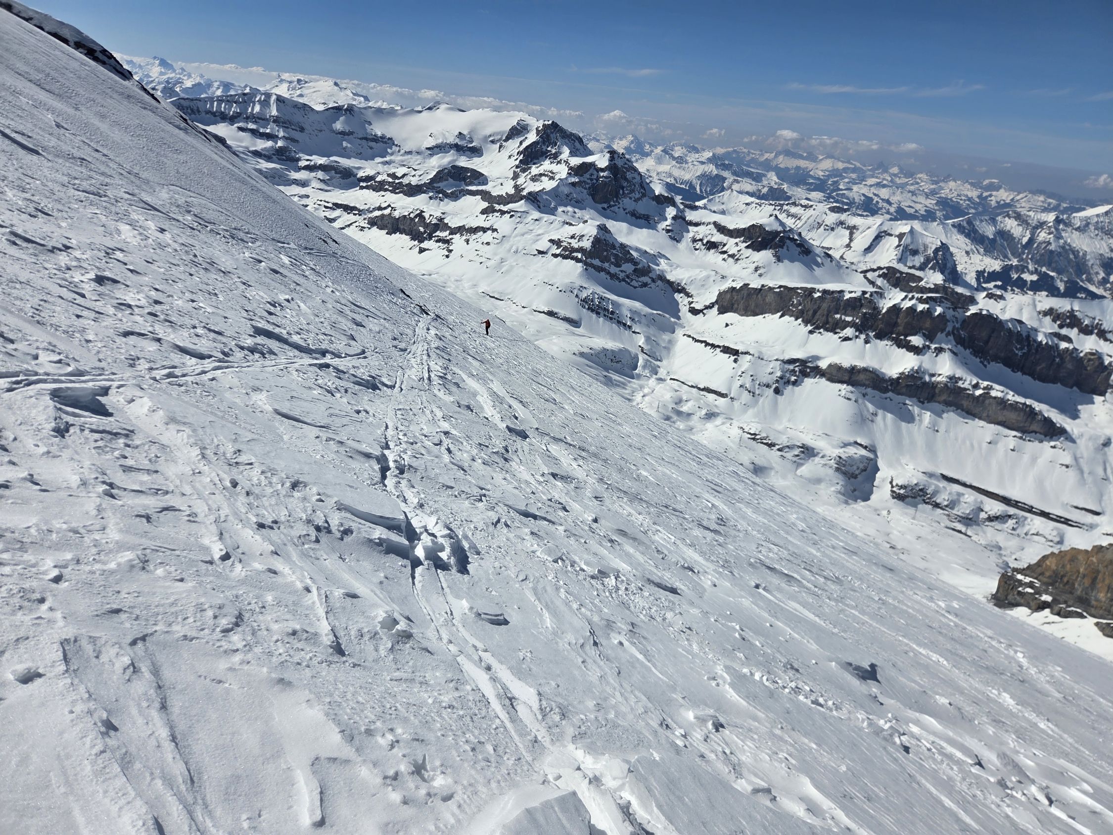 Der Schnee war sehr stark windbearbeitet und darum weder im Aufstieg als in der Abfahrt richtig gut. Wir konnten bis zum Skidepot unterhalb des Gipfels alles auf den Skis aufsteigen. Bereits im Aufstieg zum Rindersattel haben wir Harscheisen montiert, weil die Spur sehr rutschig war. Es war nirgends eisig, ober doch teilweise ziemlich hart. Ab dem Rindersattel war der Aufstieg anstregend, weil man immer aufpassen musste, dass man nicht wegrutscht (auch mit Harscheisen). In der Abfahrt sind wir wegen dem mühsamen Schnee wieder zum Rindersattel gequert, aber die Südhänge waren schon sehr nass.