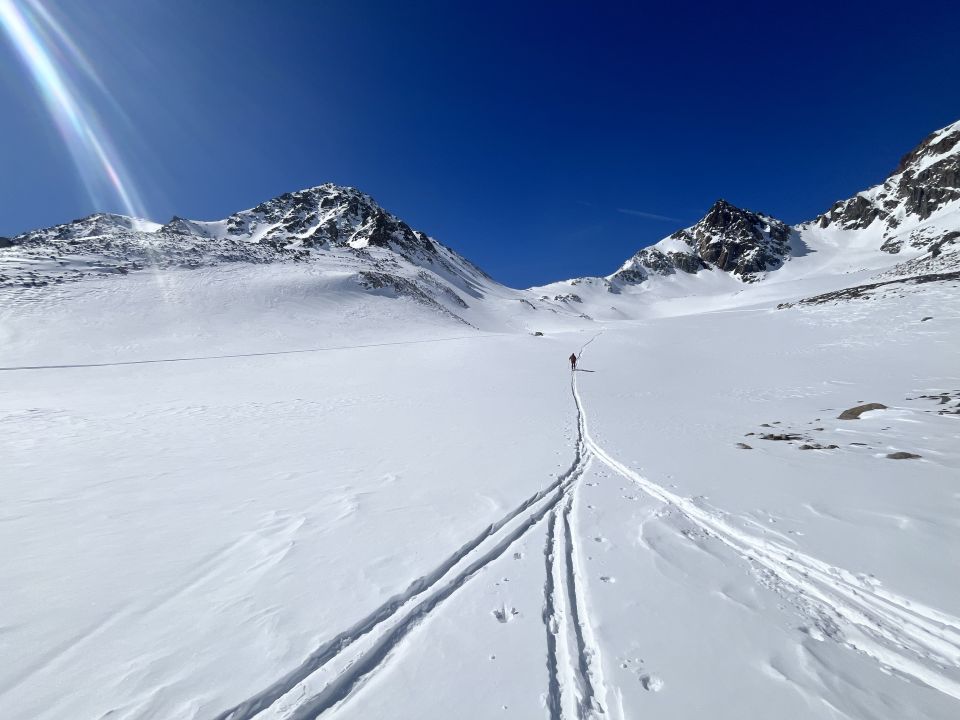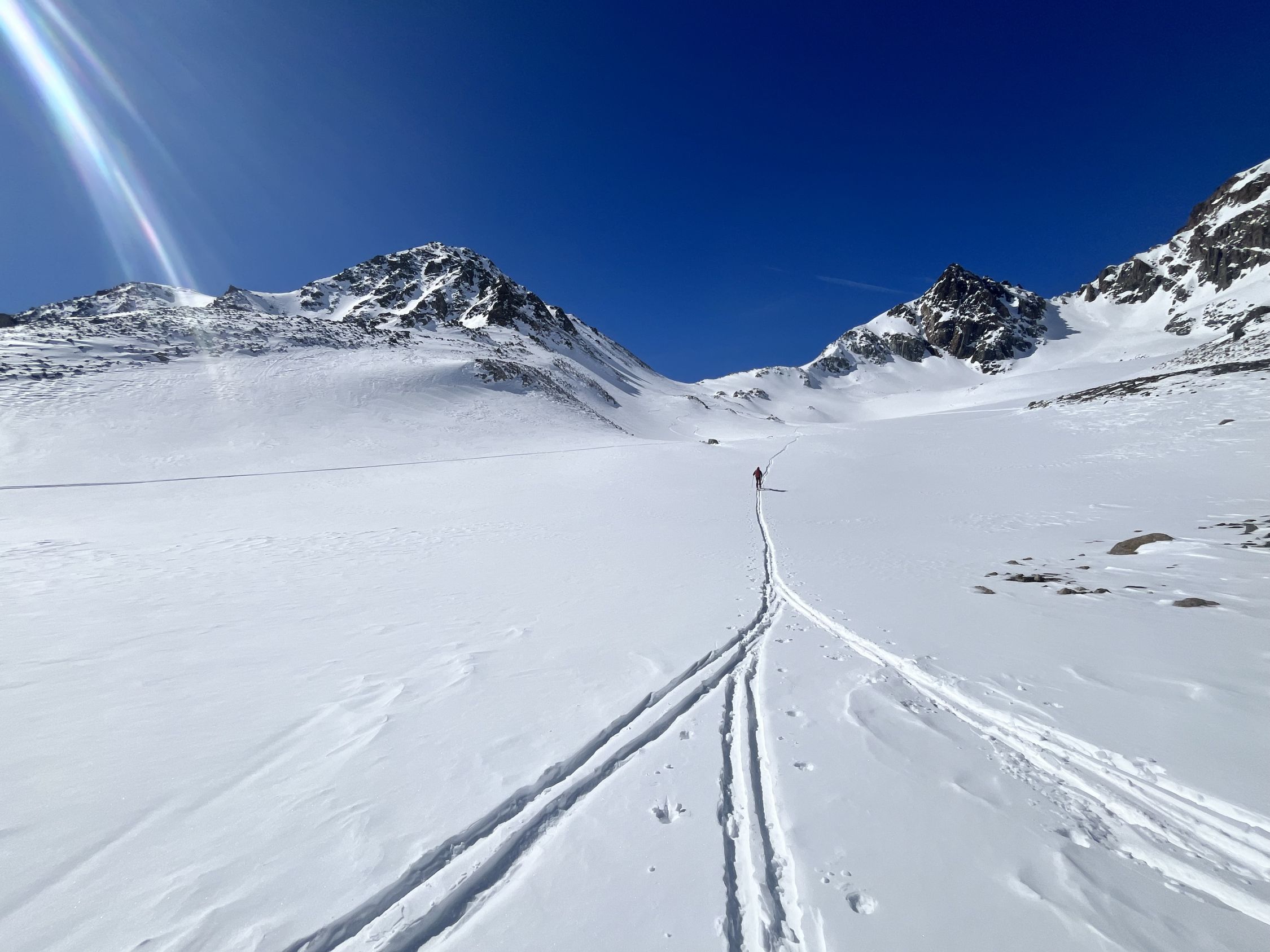 Gestern waren wir auf den Pizzet vom Skigebiet Zuos ( geschlossen). Wummgeräusch am Gipfelhang. Windharschdeckel in den oberen Hängen, unten sulzige Piste.