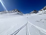 Oben Pulver, teils mit Windeckel, unten Firn und Sulz, der sich aber gut fahren ließ bis zur Kapelle von Brail. Kurze Tragestellen am Eingang ins VAL Punt Ota. Die Lawinen im unteren Bereich des Tals sind entladen.