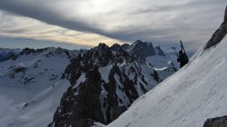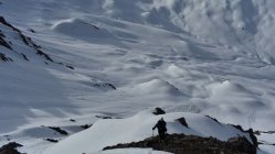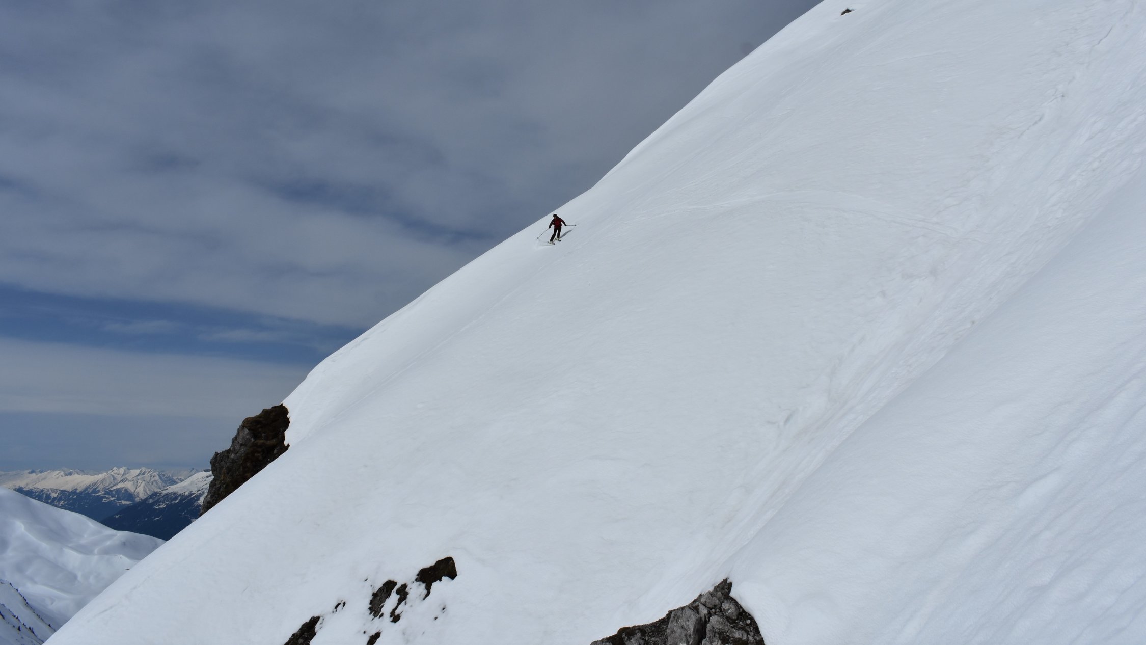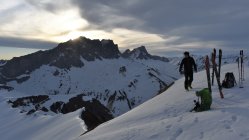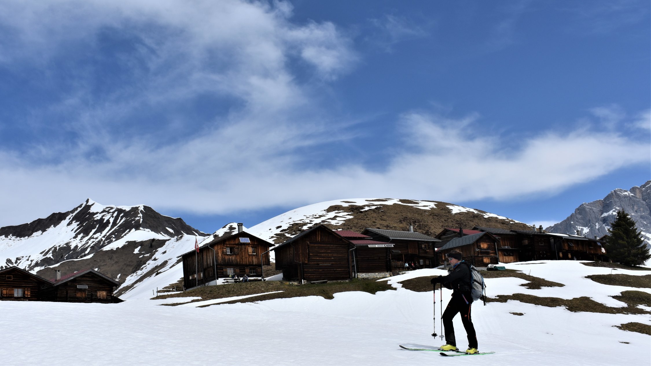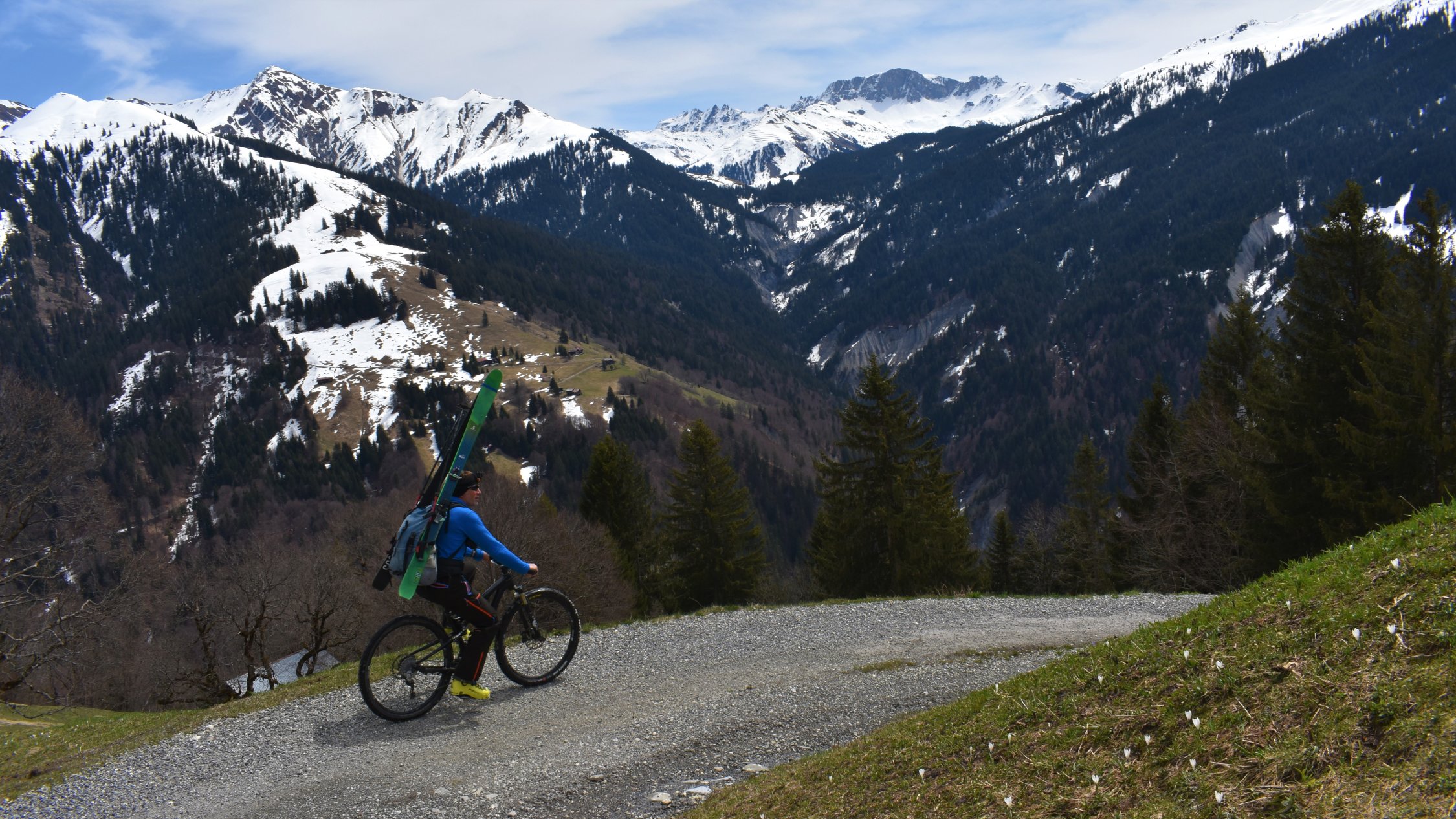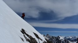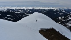 Schon der Anfahrtsweg von Schiers nach Schuders über die Salginatobelbrücke ( 7. 4 km ) ist steil und eng. Ab Schuders 1270 müM mit dem Bike ca. 2 km nach Cauis 1580 müM. Nun auf harter Schneedecke über den 3 km langen Grat zum Höchstelli. Ebenfals noch auf Hartschnee zum Einstieg Gamsluggen, ab 2150 müM mit Steigeisen (auf 200 Hm 35 - 40°)