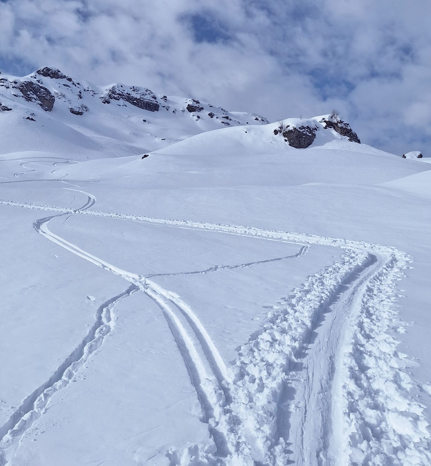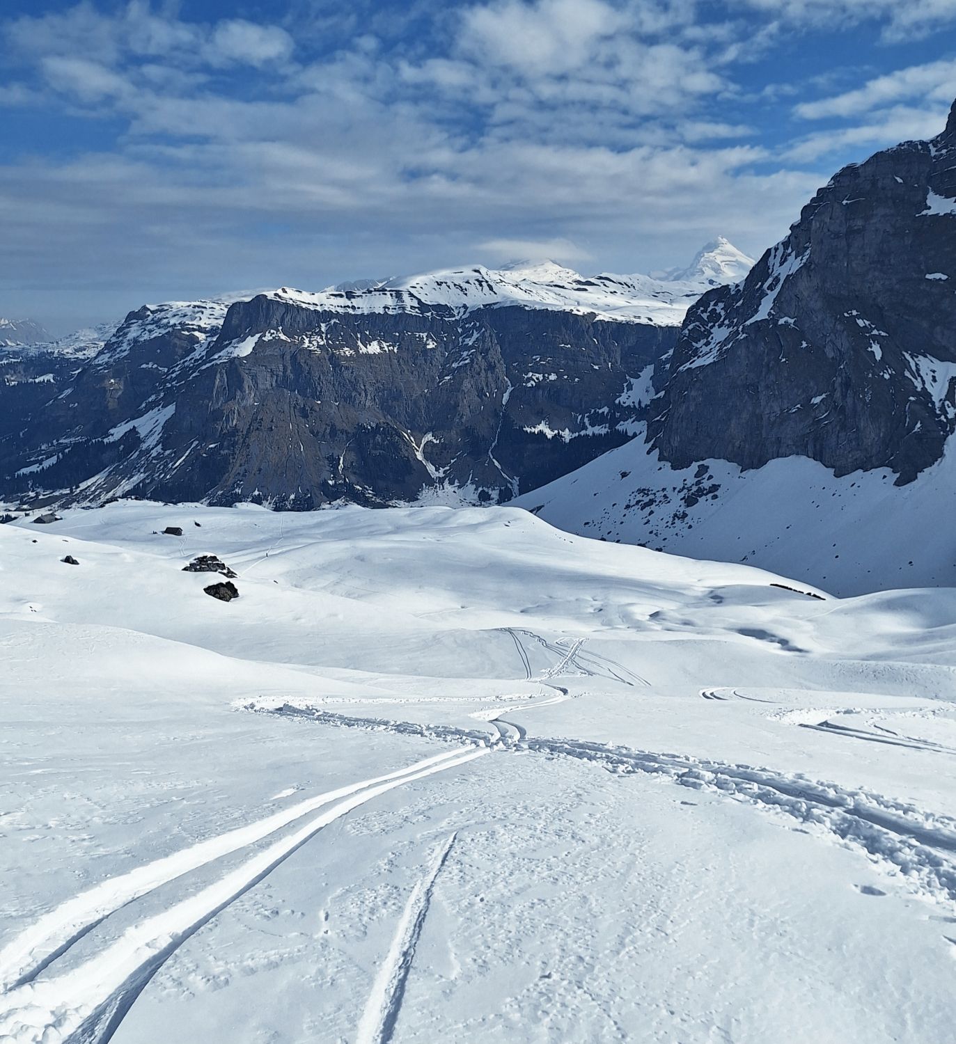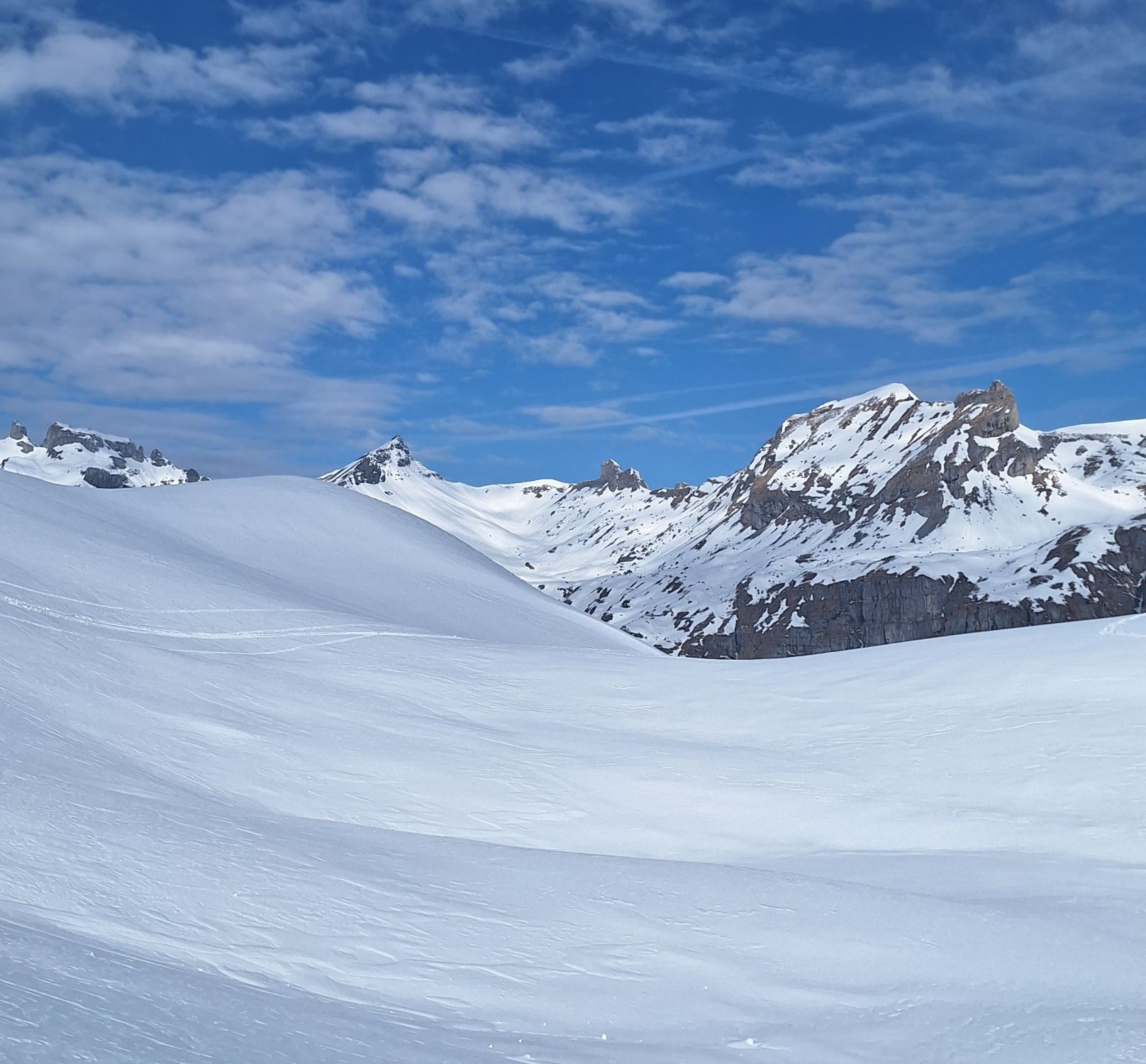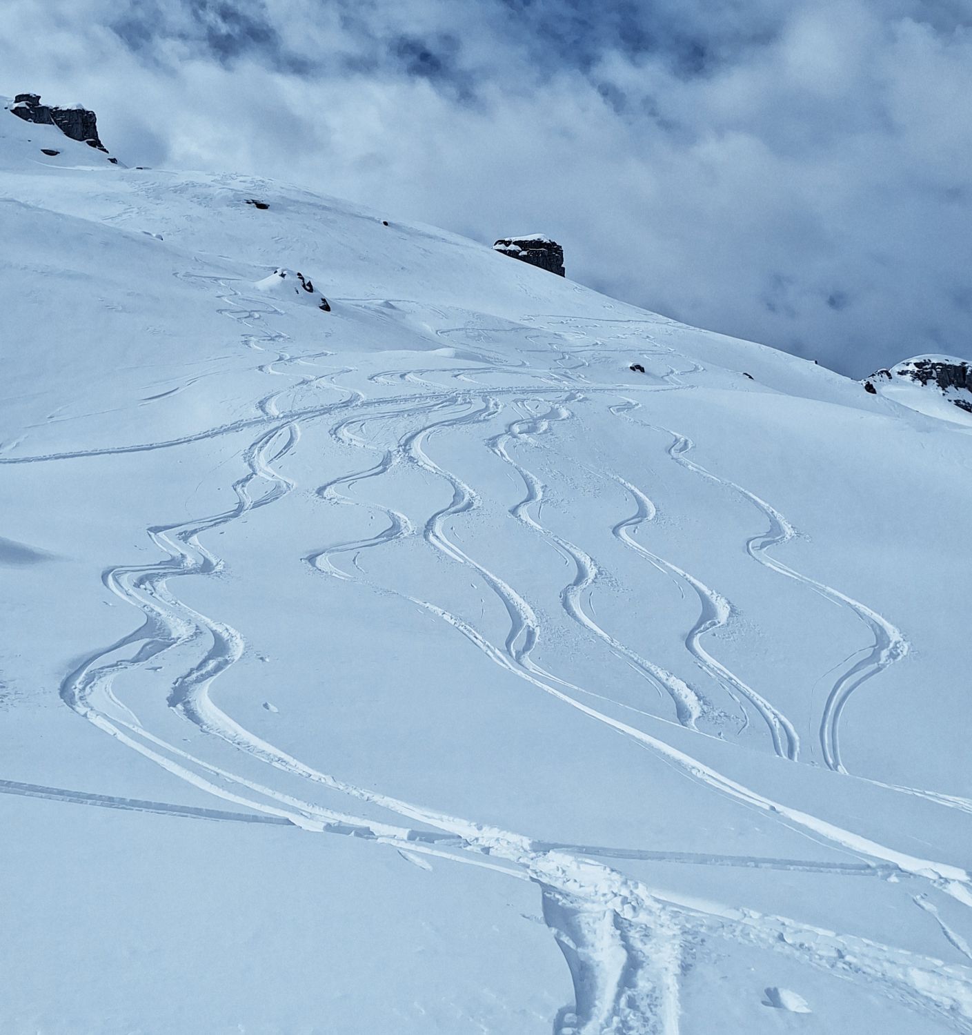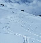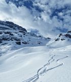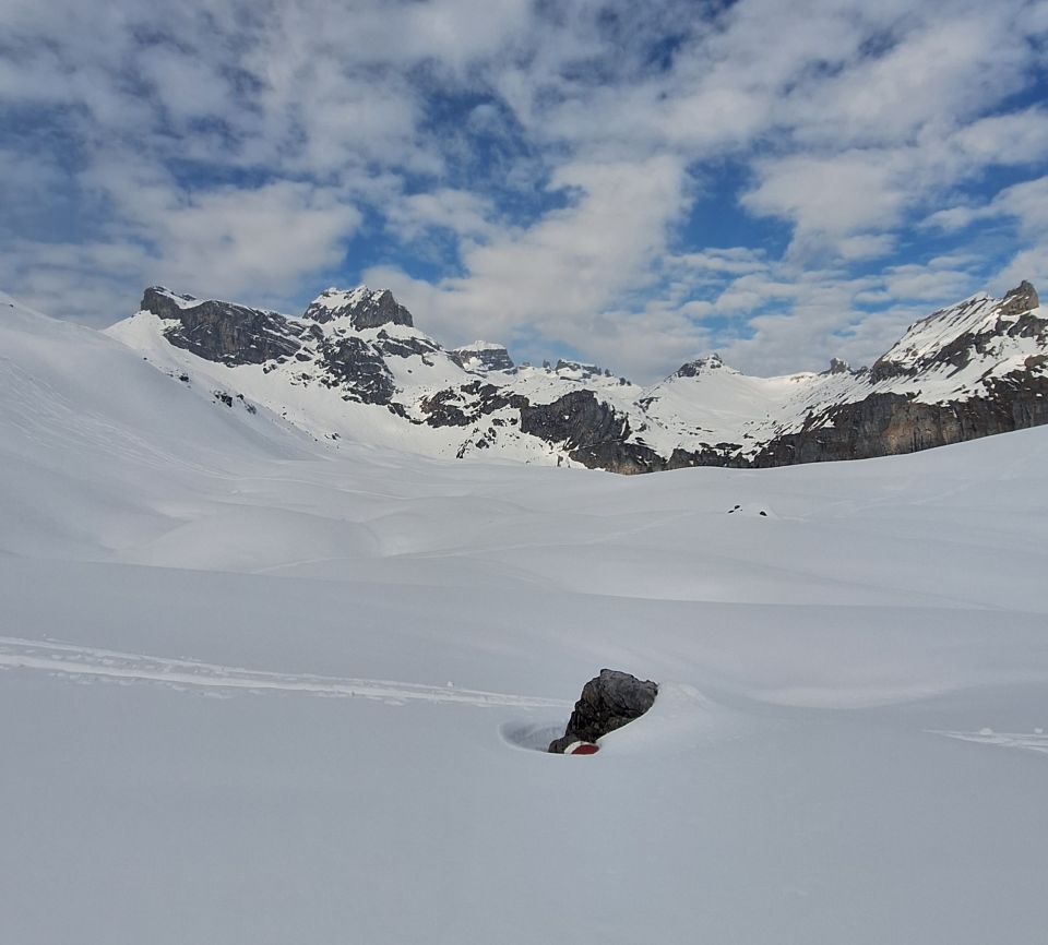 Super Pulver vom Gipfel bis fast zur Station Sahli Alp hinunter. Aufstieg über Girschboden Pkt. 1744, danach über Chli Glatten auf den Glatten 2505. Abfahrt gleich wie Aufstieg alles Pulverschnee.