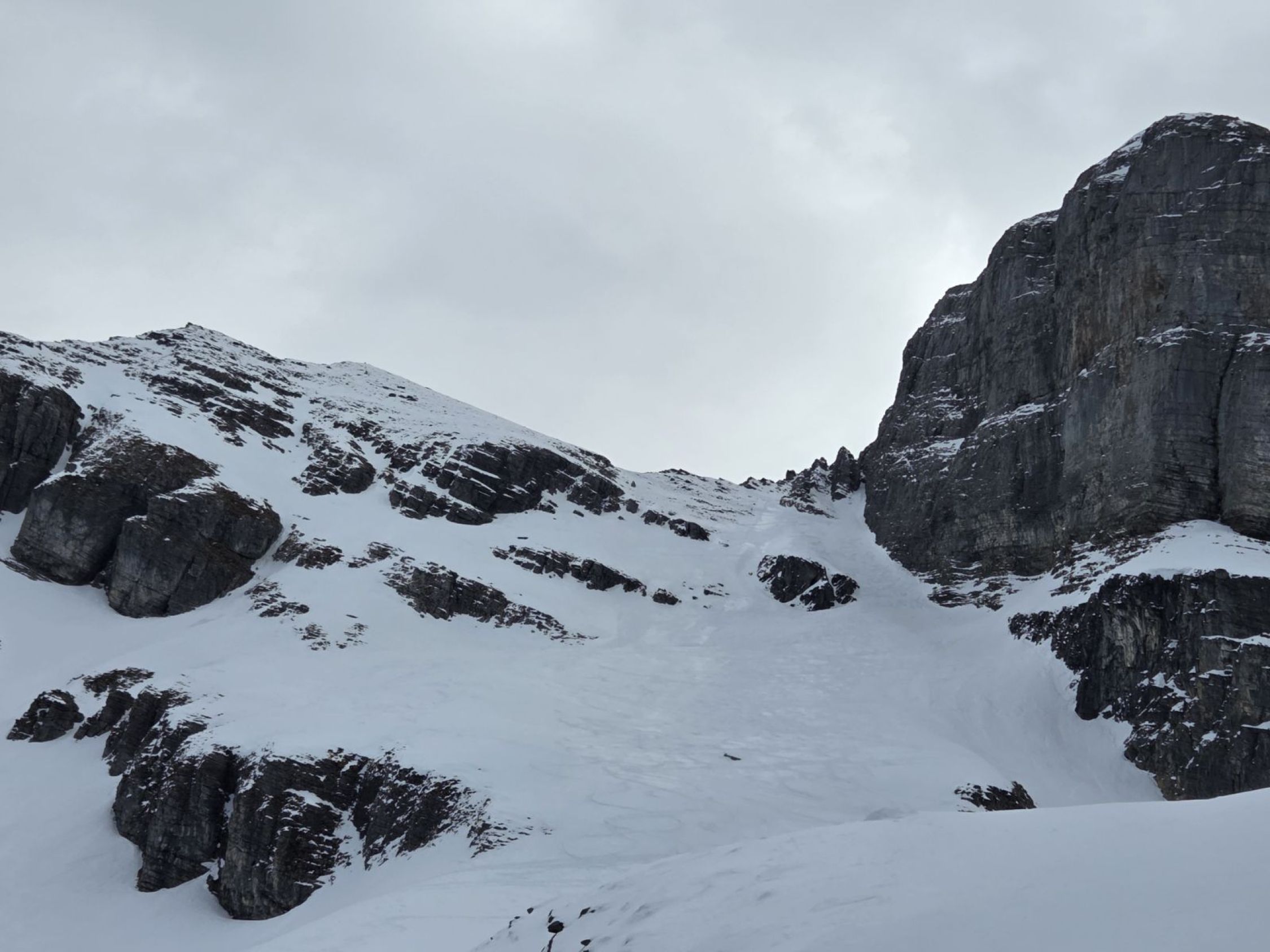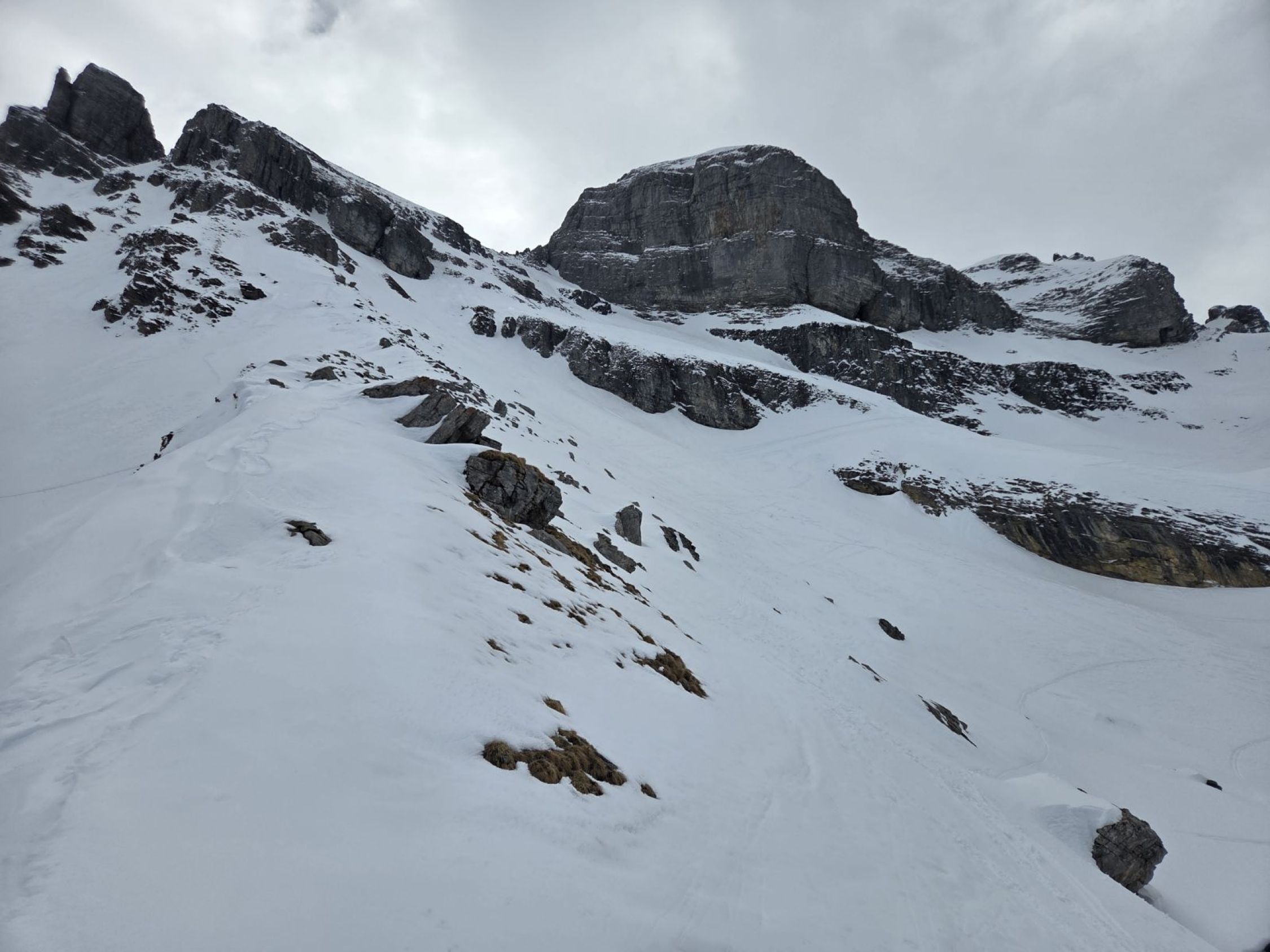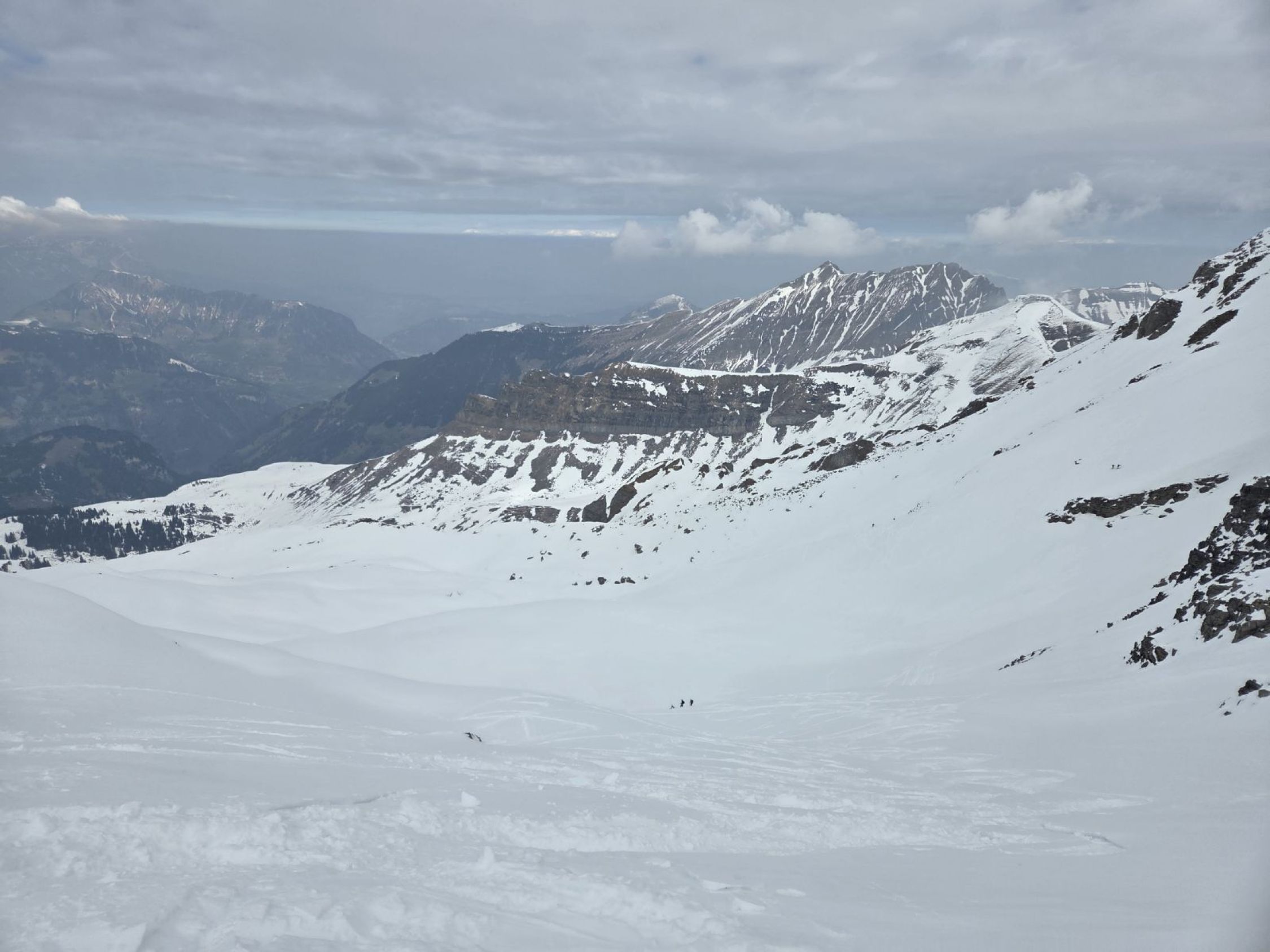 Der Gipfelhang war sehr gut eingeschneit und hatte 30-40cm Pulver. Die Querung zurück zum Firlegi dann etwas mühsam und eisig.
