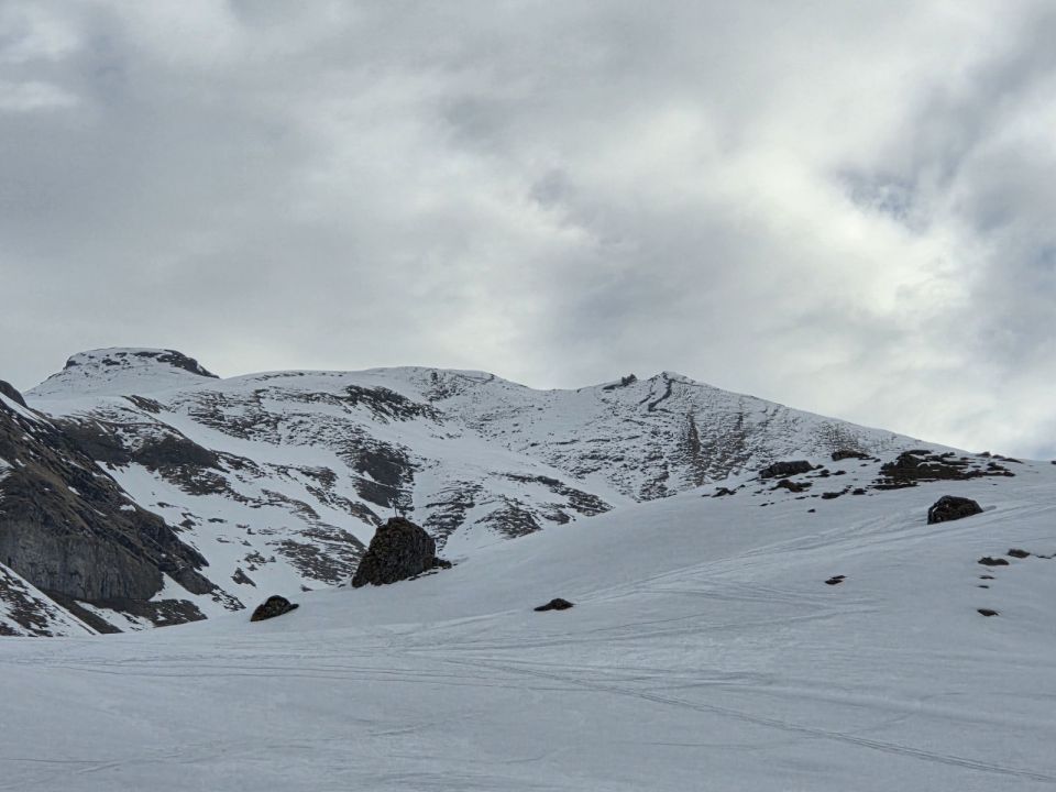 Auch der Gipfelhang ist fast aper. Man muss sich über die weissen Flecken durchzirkeln beim Aufstieg und Abfahrt.