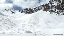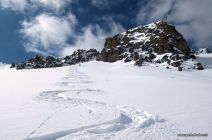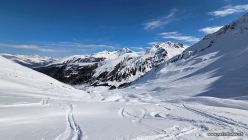 Abfahrt: Bis auf zirka 2200 m hinunter traumhafter Pulverschnee in den Hängen bei Uf de Riser mit nur wenigen alten Spuren drin. Dann bis zum Waldanfang recht verfahren, trotzdem fahrbar. Der Waldweg war schon leicht aufgesulzt, sodass wir kraftschonend nach Monstein kamen.