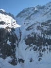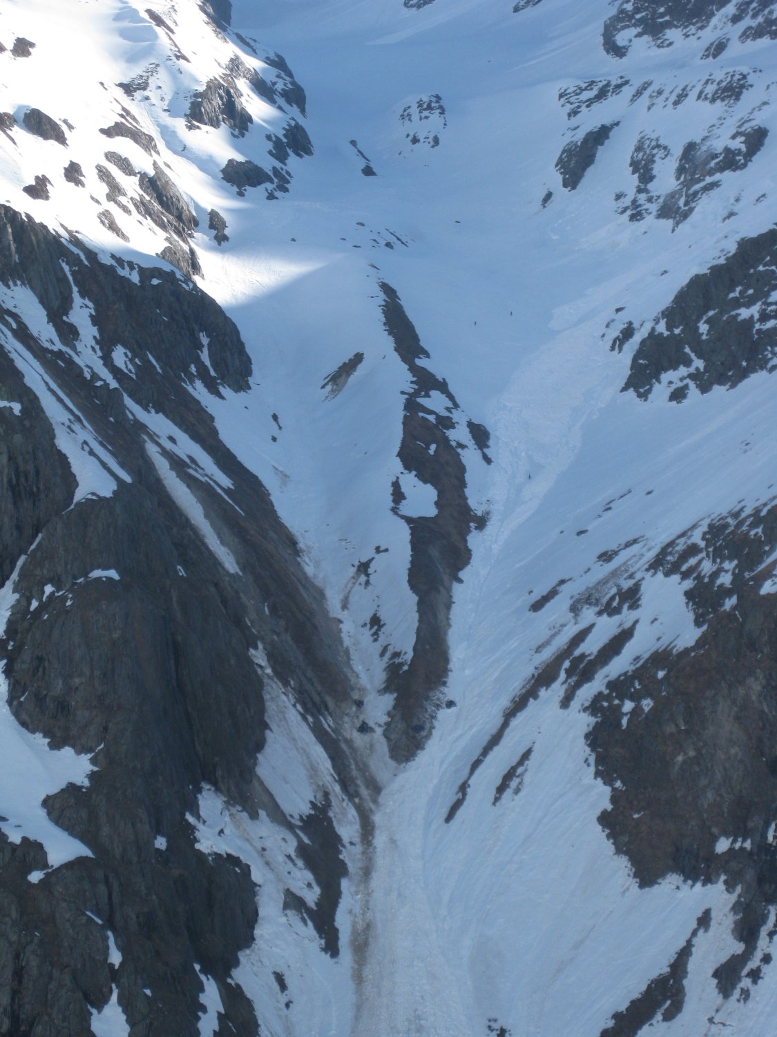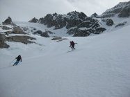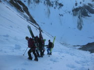 Tierberglücke: Die Lawine ist unten. Es empfiehlt sich über den Kegel mit Steigeisen abzusteigen. Der Gegenaufstieg zum Punkt 2660m ist ( wer will ) noch mit Ski möglich. Wir sind mit Steigeisen rauf.