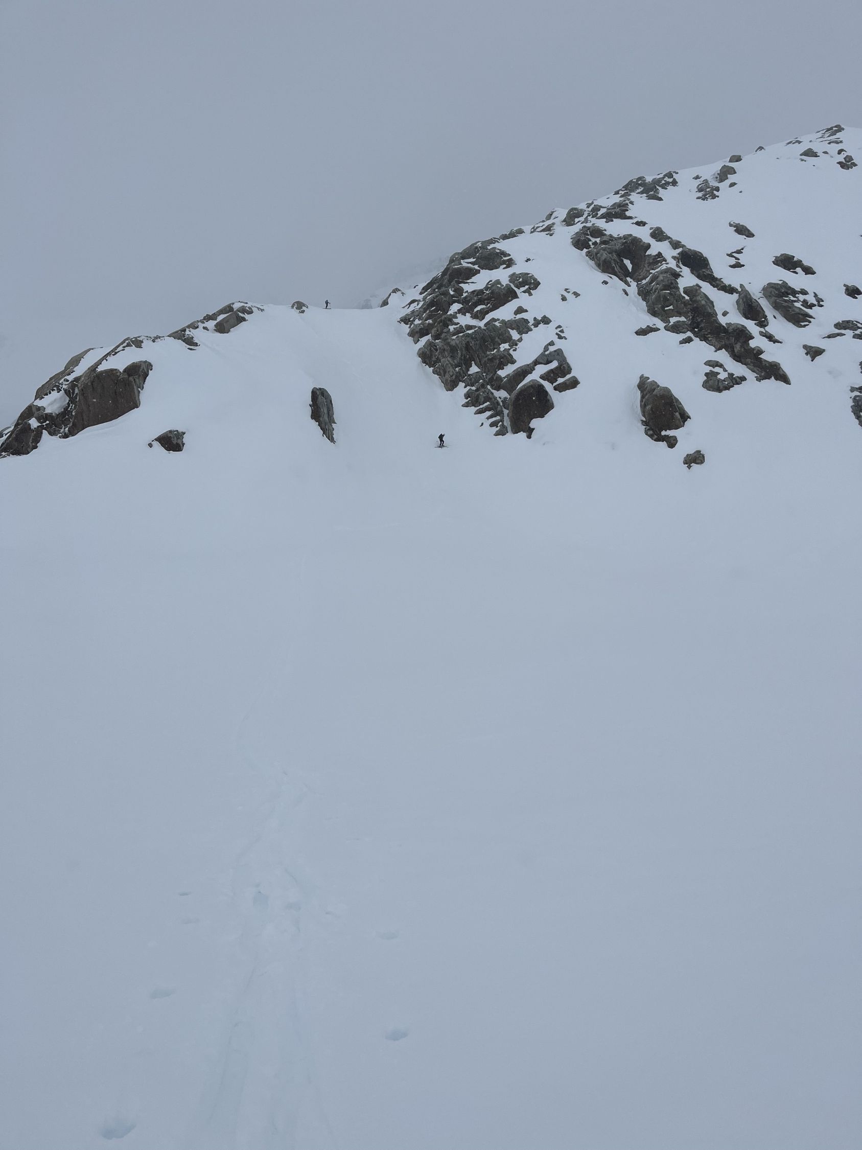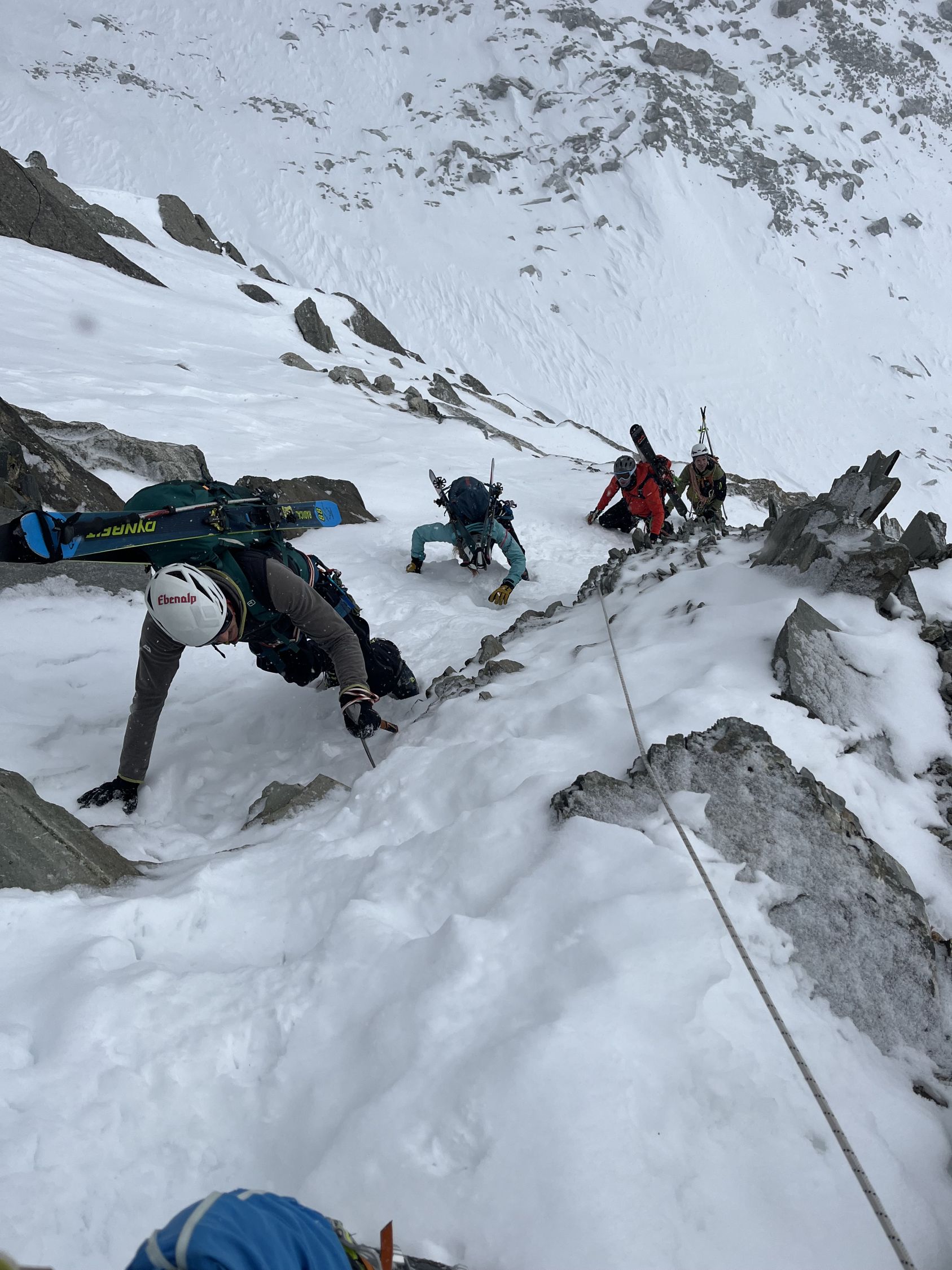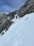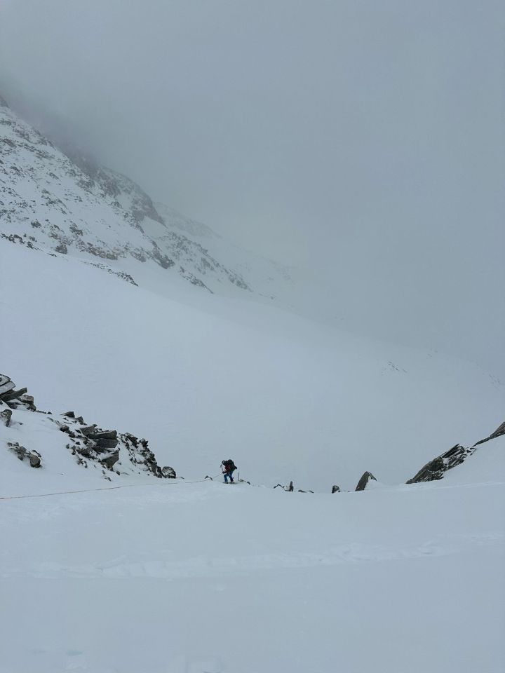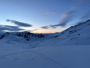 Aufstieg top, harte Schneeverhältnisse erlaubten zügiges vorankommen, forderte tw. aber auch Gebrauch von Harscheisen. Im Abseil-Couloir SW des nördlichen Tiefensattel hat es kaum noch Schnee, weshalb wir abseilten, statt abzuklettern. Die Sicht war aufgrund Schneegestöber begrenzt und der Neu- und Triebschnee auf dem Gletscher forderte viel Schieben statt Fahren. Die letzten Kilometer auf den Bahngleisen, waren durch schneefreie Lücken von >100m unterbrochen, weshalb dort auch einiges getragen werden musste.