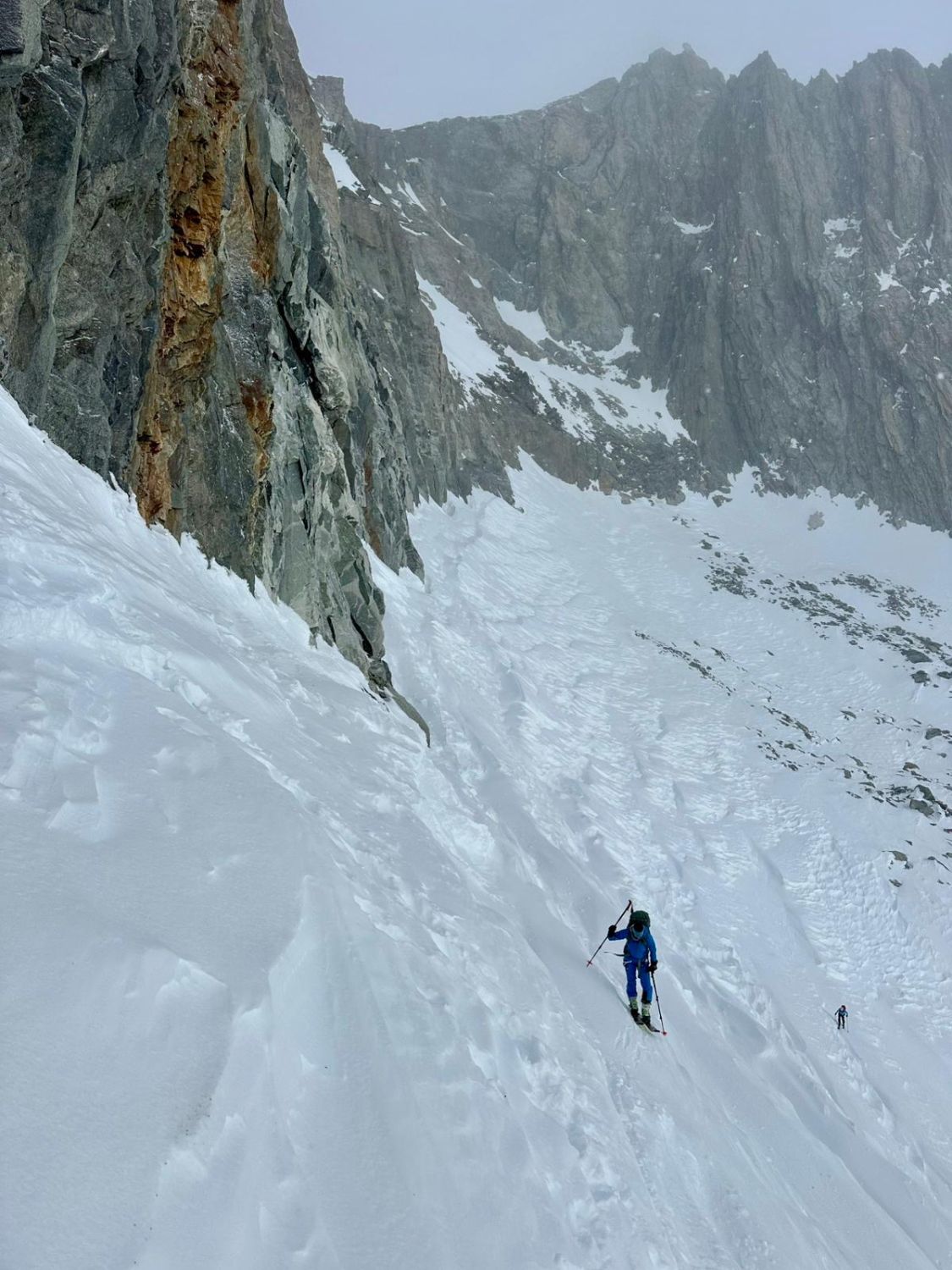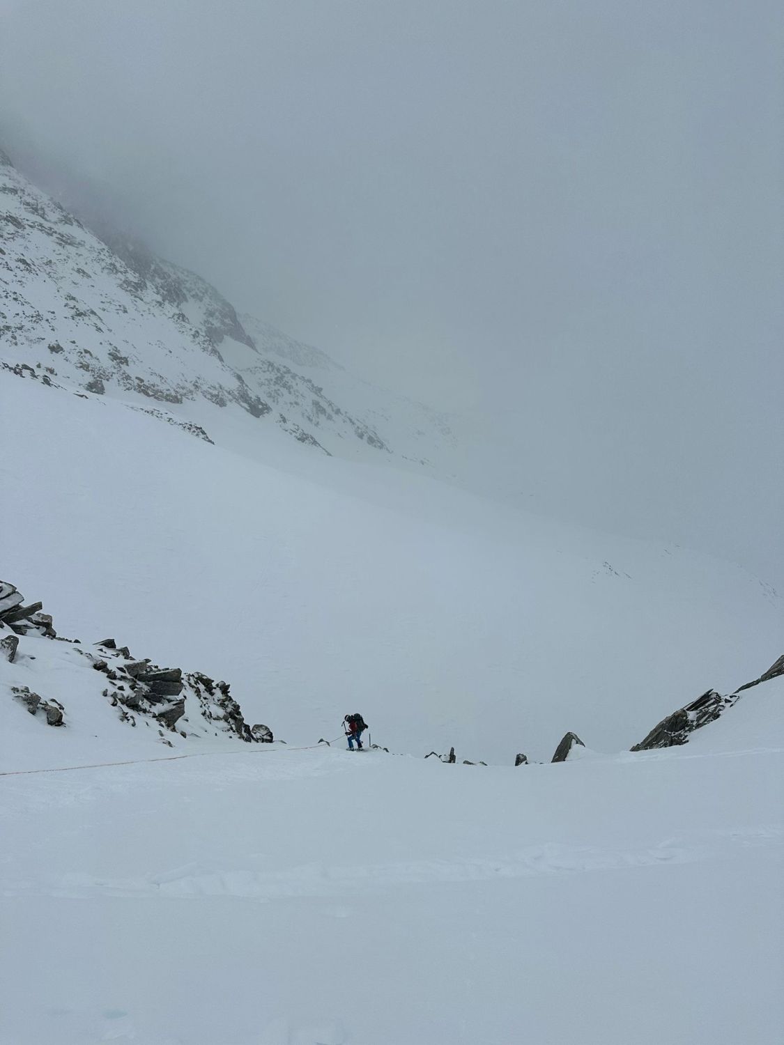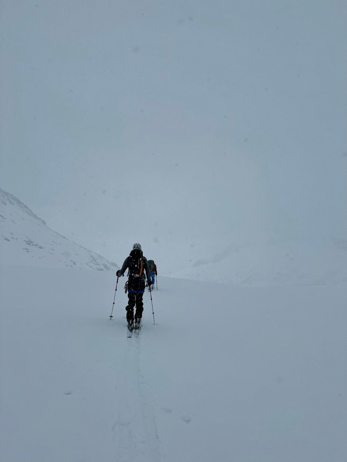 Aufstieg top, harte Schneeverhältnisse erlaubten zügiges vorankommen, forderte tw. aber auch Gebrauch von Harscheisen. Im Abseil-Couloir SW des nördlichen Tiefensattel hat es kaum noch Schnee, weshalb wir abseilten, statt abzuklettern. Die Sicht war aufgrund Schneegestöber begrenzt und der Neu- und Triebschnee auf dem Gletscher forderte viel Schieben statt Fahren. Die letzten Kilometer auf den Bahngleisen, waren durch schneefreie Lücken von >100m unterbrochen, weshalb dort auch einiges getragen werden musste.