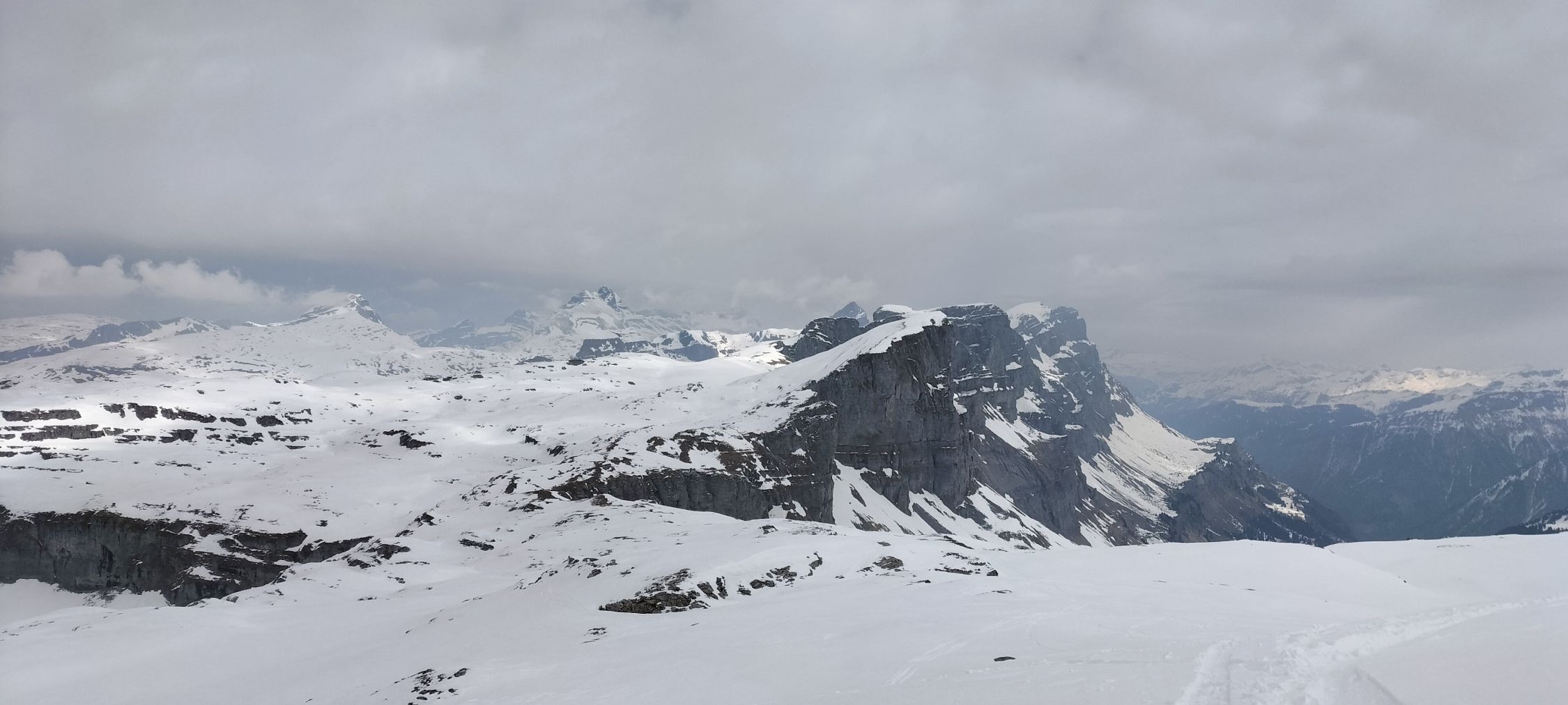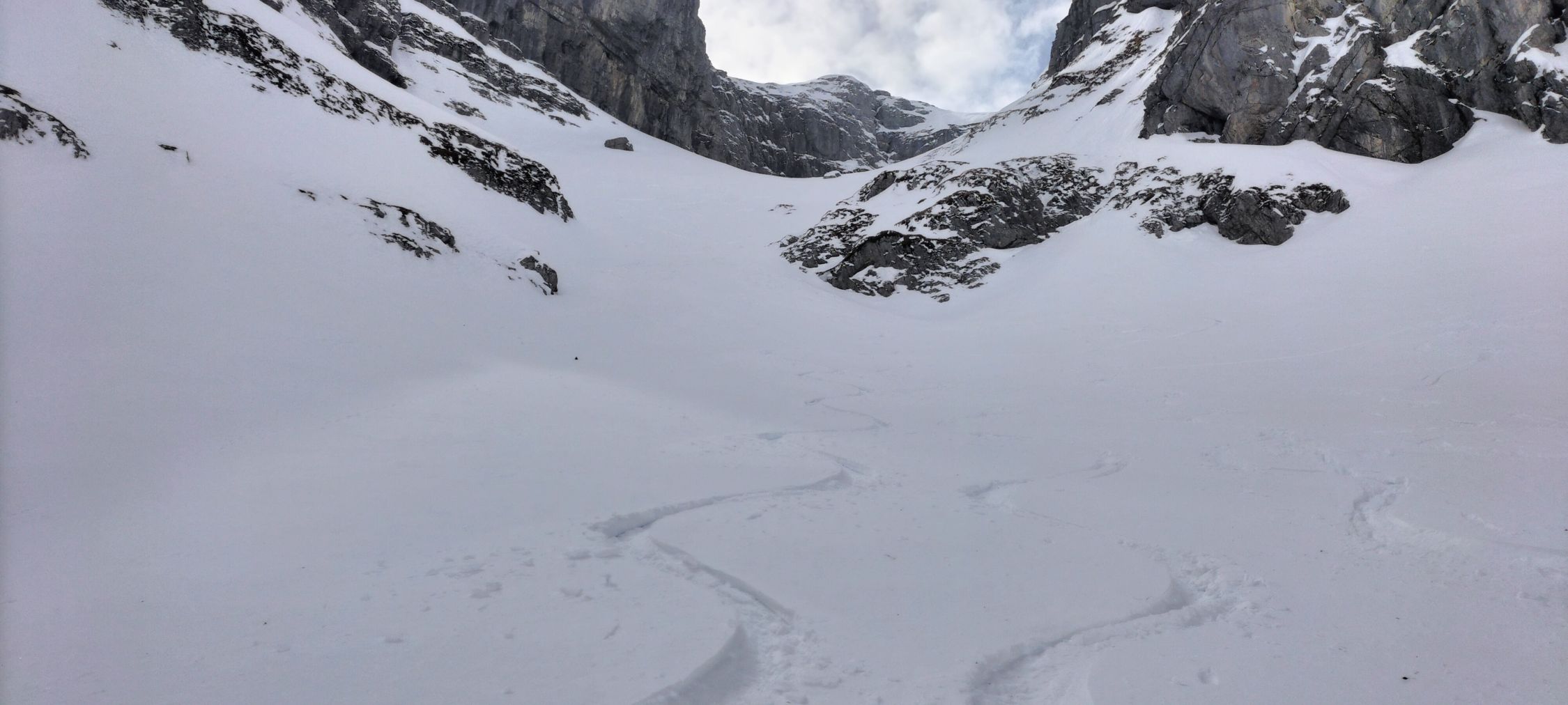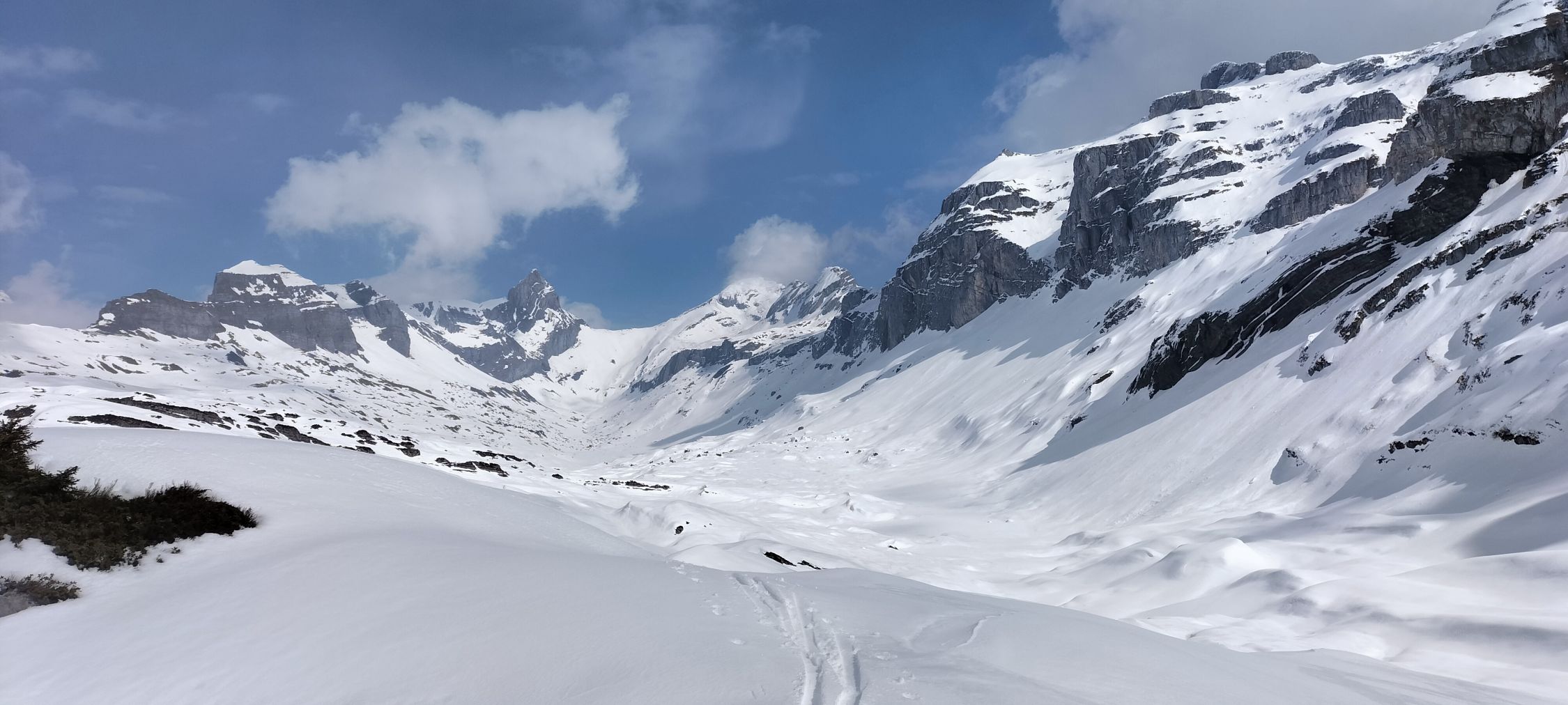 Start der Tour beim der Barriere Schwandboden, Aufstieg überWaldi nach Ruosalp bis zum Glatten, das Wetter heute nur wenig Sonne, nach kurzer Pause Abfahrt zum Firnerloch, weiter gings hoch zum Läckistock, nach kurzer Abfahrt , Querung zum Mären Nord, die Einfahrt zur Inner Brüelchälen war dann die Schlüsselstelle der Tour, mit Steiler Abfahrt in Richtung Glattalp, durch ein Couloir nach Mütschen , bei recht guten Pulverschnee , beim Märenbrunnen dann Lawinenschnee, zuletzt noch Sulzschnee bis Sahli.