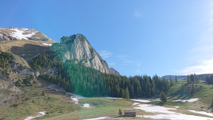 Allerdings liegt noch viel Schnee in der Rinne am Einstieg sowie auch in einer kurzen aber steilen Rinne, im Abstieg auf dem Wanderweg. Ein Pickel oder gutes Schuhwerk oder beides sind sehr hilfreich. Die hochaufgelösten 360° Webcams in der Umgebung sind sehr aufschlussreich (https://www.wildhaus.ch/winter/aktuell/webcams.html). Aber die Lawinenkegel in der Südwestflanke des Schafberges sind darauf nur schwer zu erkennen, weil sie mit Dreck überdeckt sind.