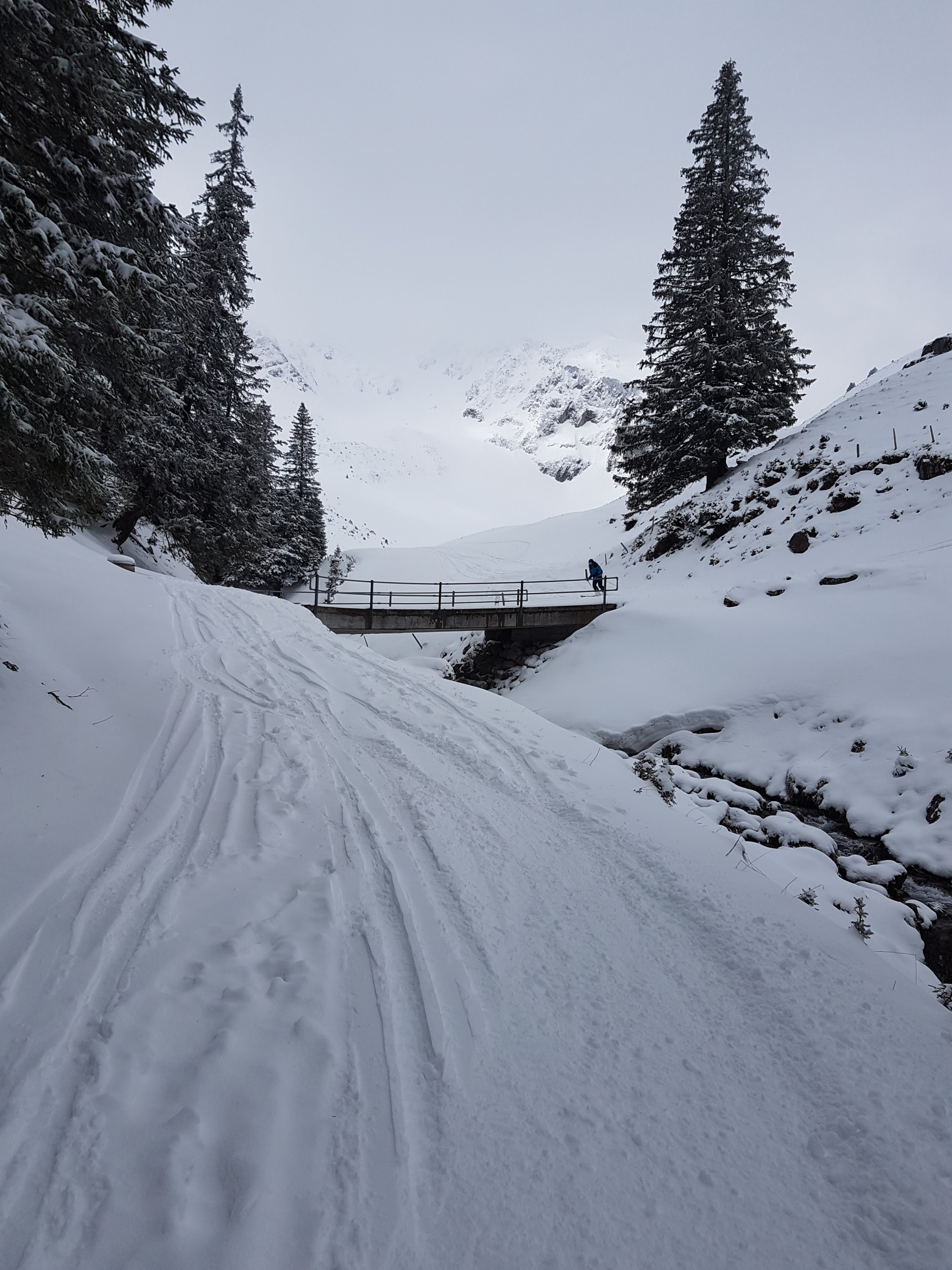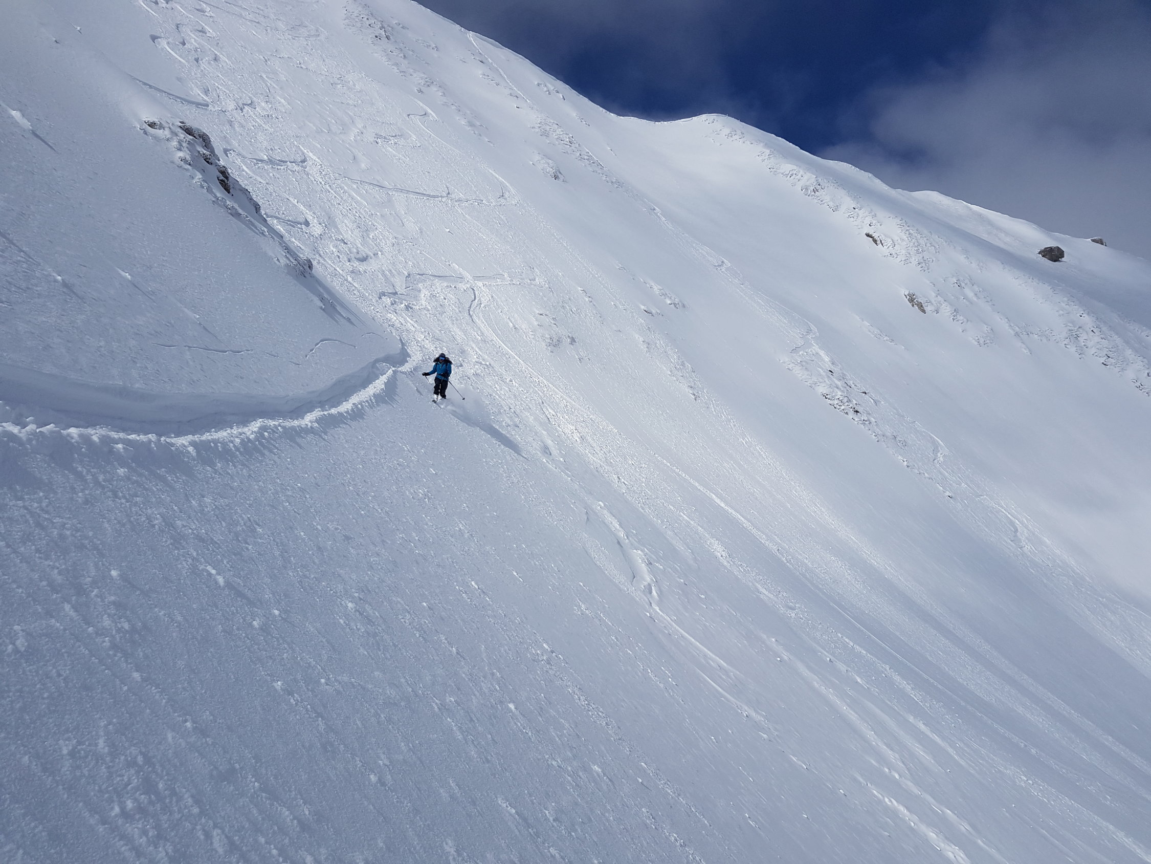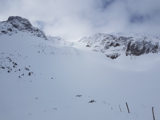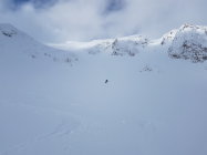 Abfahrt um 10.30 bei teilweise Sonnenschein durch Nordflanke. Sehr schön zu fahrender Pulver bis zum Parkplatz.