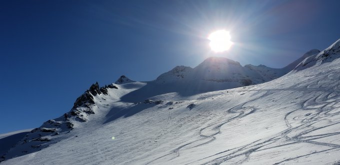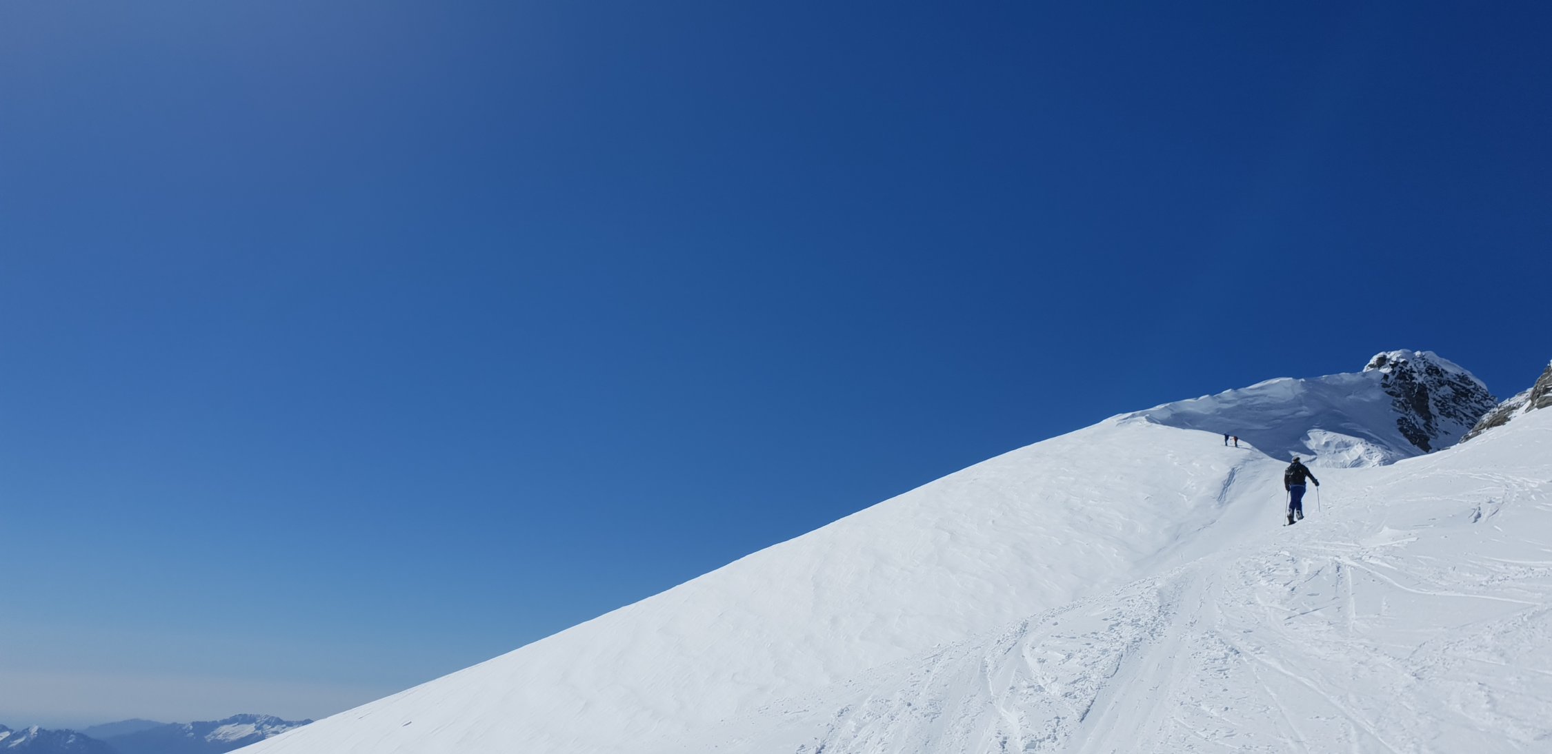 Traverse unterm Hübschhorn noch hübsch pulvrig, sonst gepresster pulver/unten gefrorener Hartschnee. Harscheisen nicht notwendig, könnte morgen ändern.