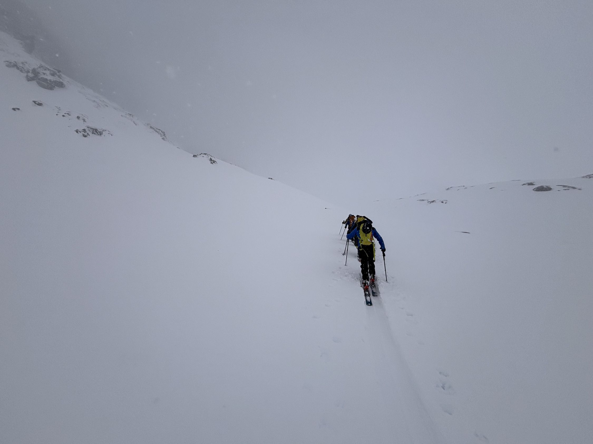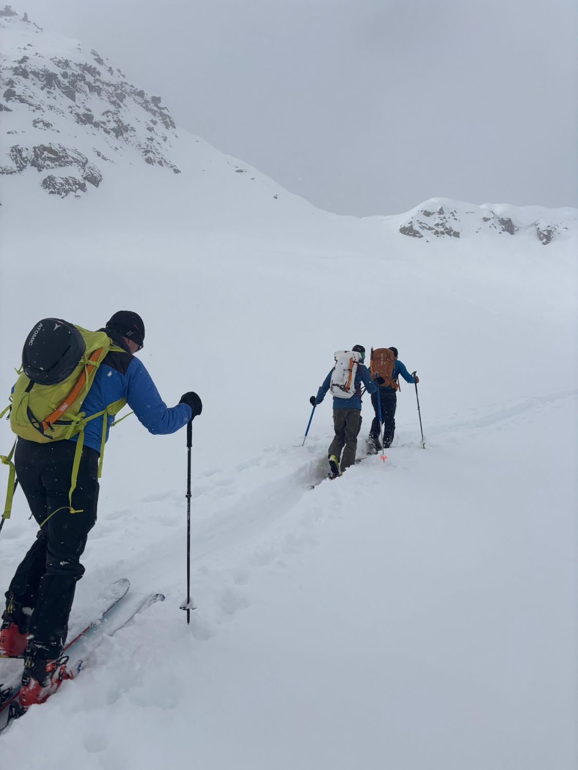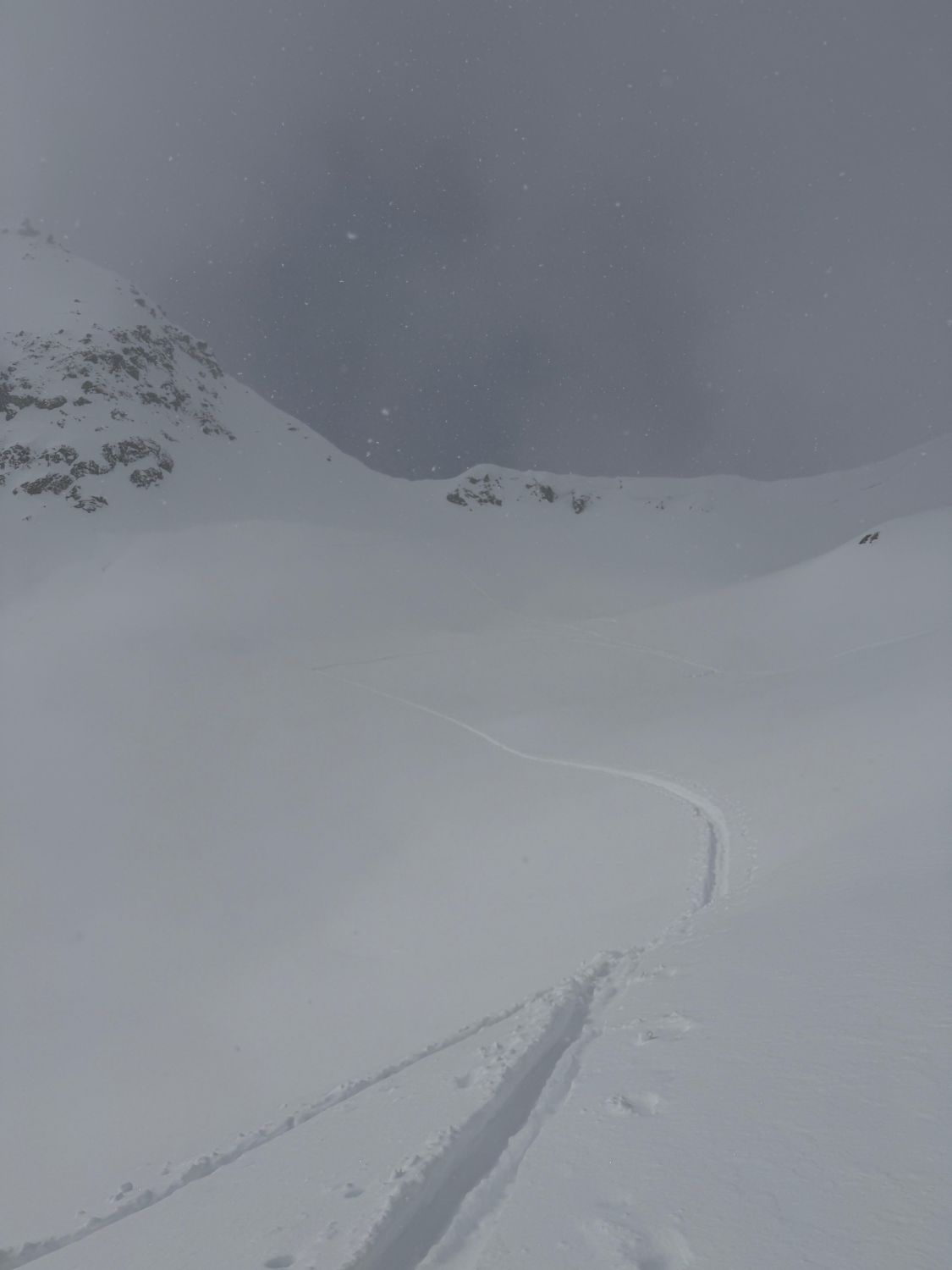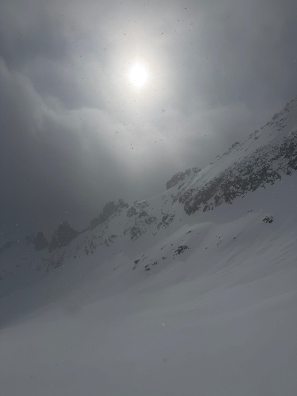 Schneeverhältnisse wären top gewesen. Je nach Wind 10-40 cm Neuschnee. Sehr starker Wind und Wolken welche vom Süden drückten. Zum Teil leichter Niederschlag. Auf ca. 2700 abgebrochen, aufgrund des vielen Triebschnee in den Hängen und dem sehr starken Wind am Grat. Abfahrt sehr Überschiinig und ab ca. 2000 viel Feuchtigkeit im Schnee.