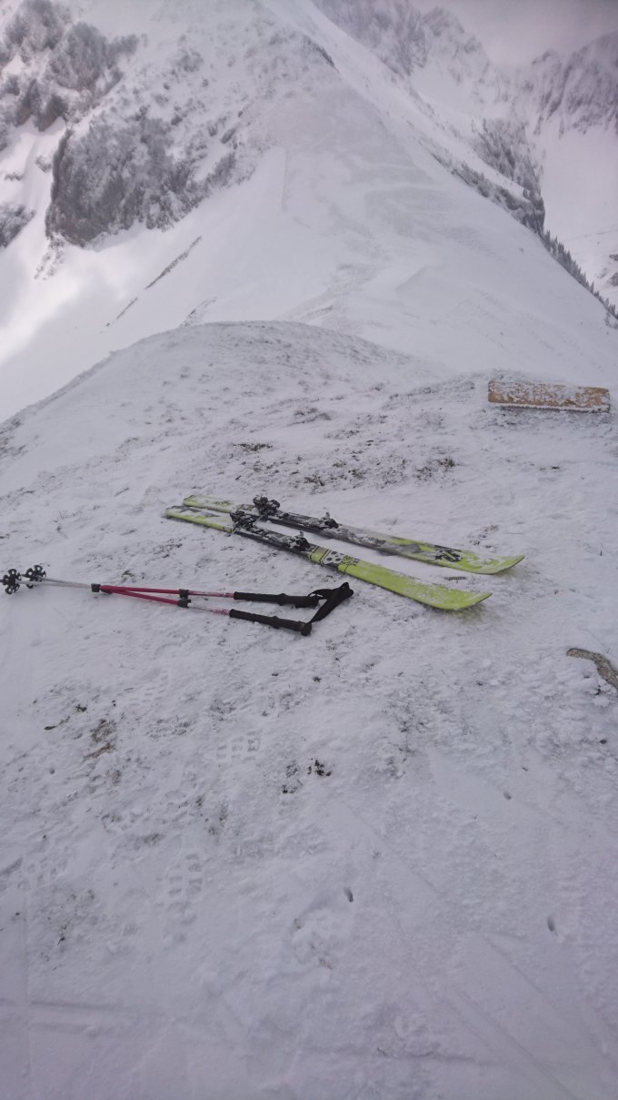 Gut eineschneit, oben abgeblasen und windig. Daher nur kurz gerastet. Abfahrt war eigentlich ganz gut aber ich war eine Stunde zu spät dran daher schon schwerer Schnee. Das gibt es wenn man im Unruhestand ist.