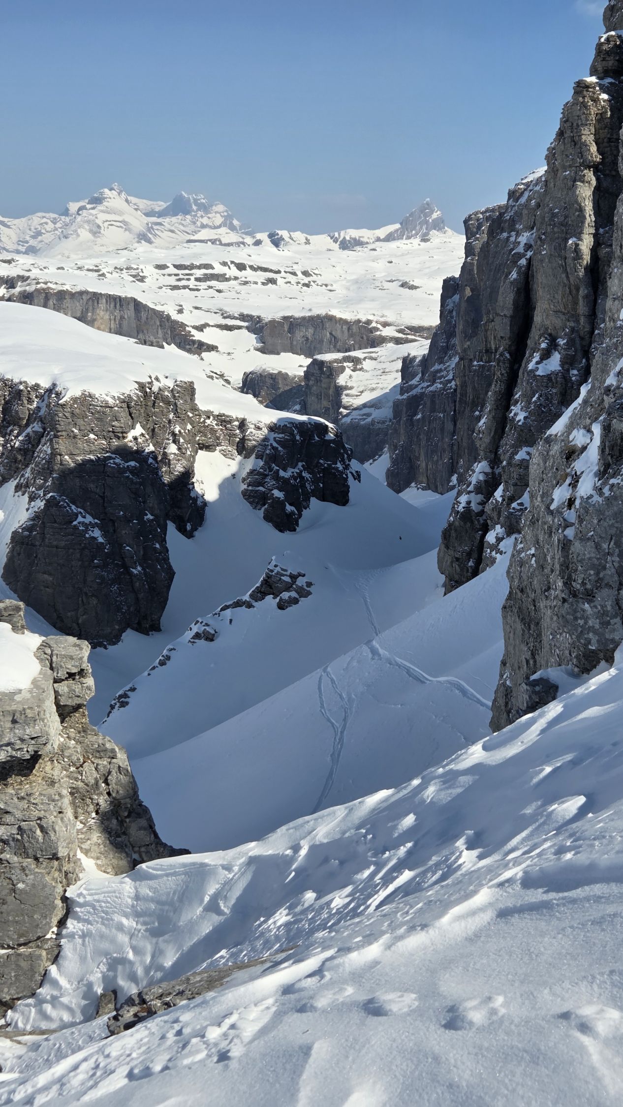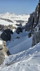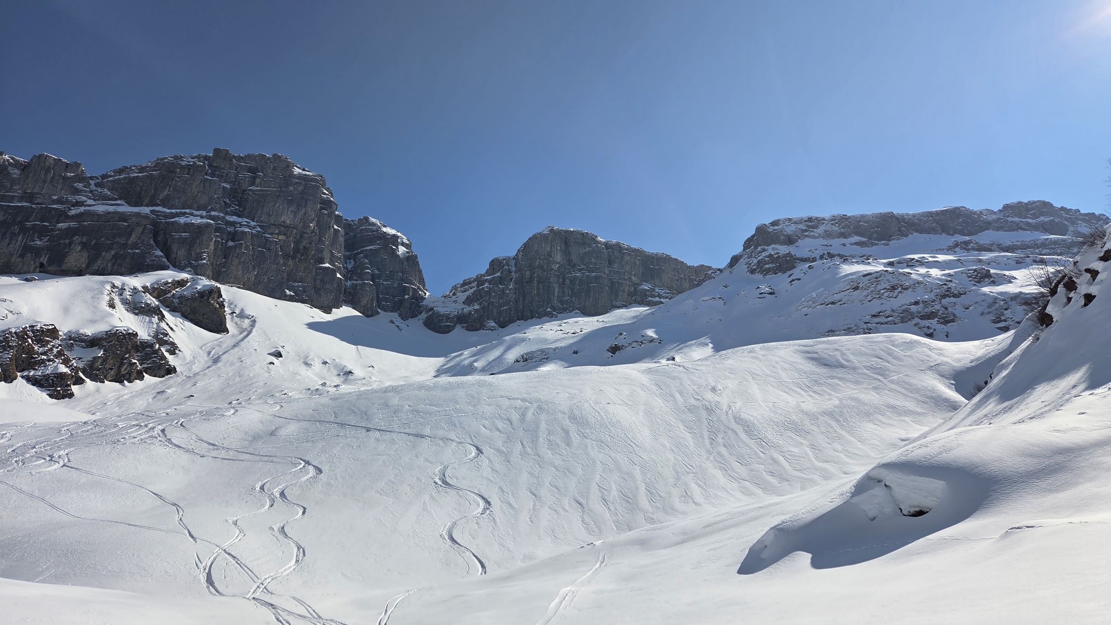 In der Nordabfahrt hinter dem Chl Glatten fanden wir meist schön drehenden Presspulver, wobei es auch Flächen mit Windharst gab, denen man aber einfach ausweichen konnte, wenn man das Auge dafür hat. Unten heraus dann etwas feuchter Schnee, aber immer schön drehend, bis zur Strasse nach Sahli. Die Abfahrt machte Spass.