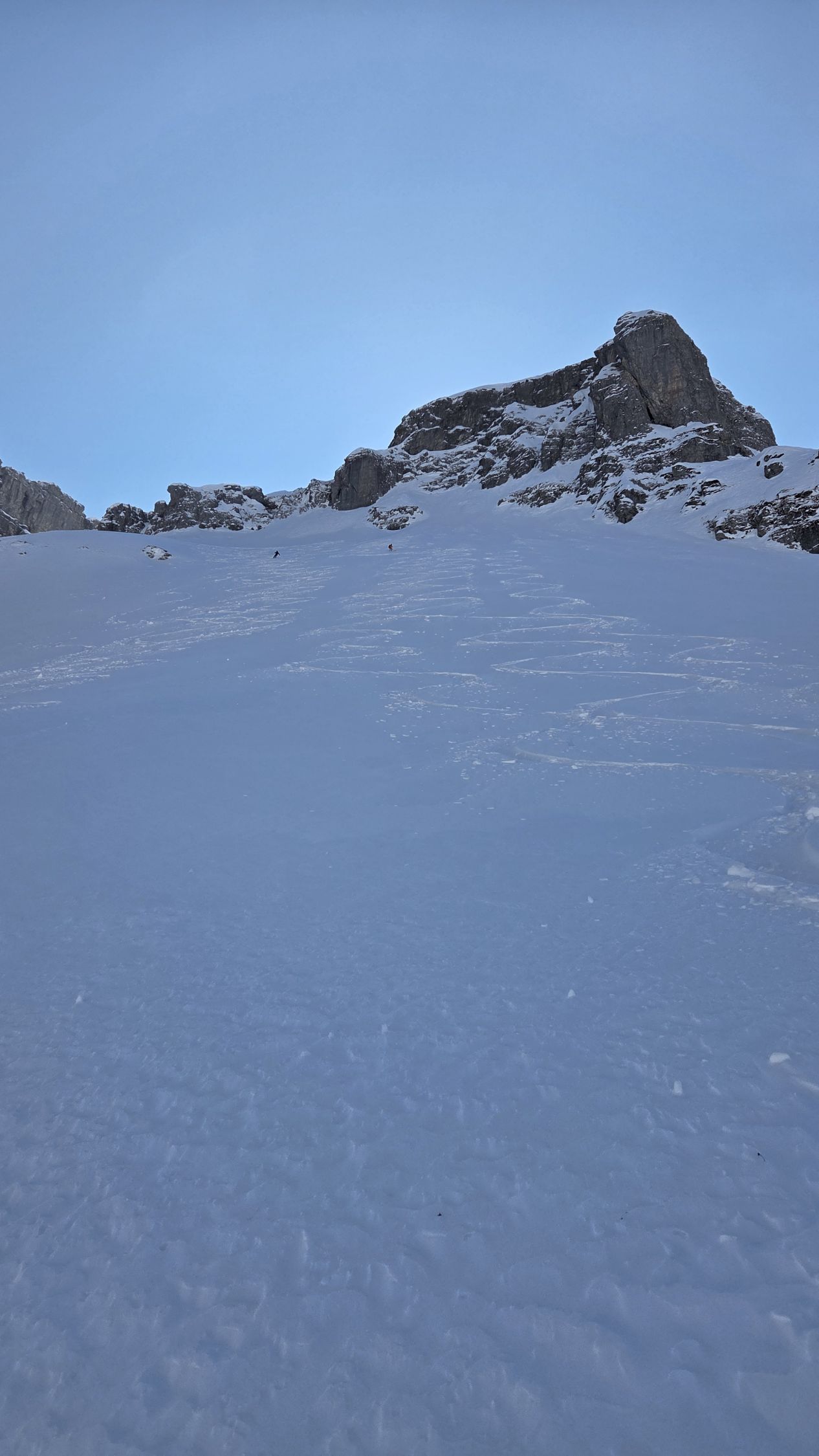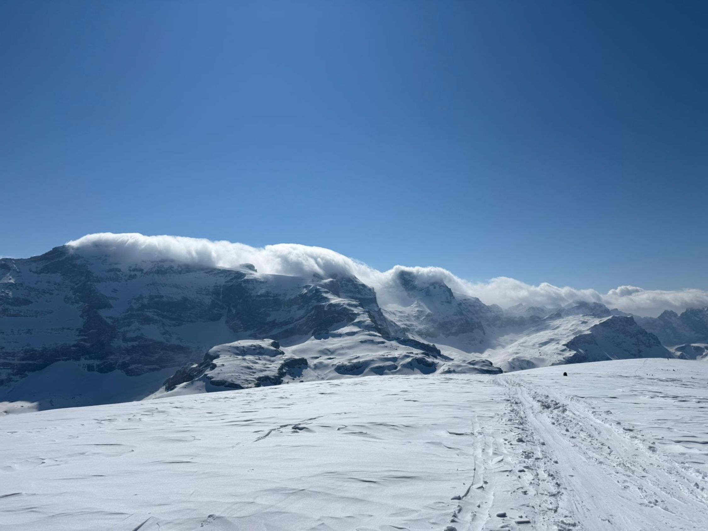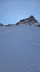 Wenige Grad über Null beim Start an der Barriere, aberer bereits klarer Himmel um7.45h. Schnee hat's sobald der nach links Wanderweg abzweigt. Sehr gute Spur hoch. Ab ca. Gross Gade gelegentlich etwas Wind (Föhn), aber nie stark, und häufig auch windstill. Erst auf dem Gipfel blies der Föhn stetig, wenn auch höchstens mässig. Die Föhnwalze am Clariden war aber schön zu sehen. Um dem Wind auszuweichen verschoben wir die Gipfelrast unter die kurze Steilstufe auf 2400m. Da war es nahezu perfekt. Ein Genuss.