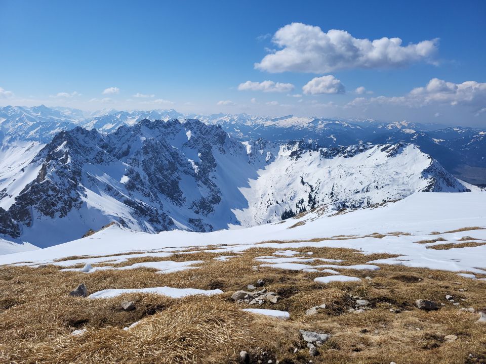 Schnee ab Käseralpe. Im Aufstieg ziemlich warm. Gute Spur zum Gipfel. Die Gipfelradt war dann kurz, da der Wind aufgefrischt hat und eine Wolkenfront ankam.