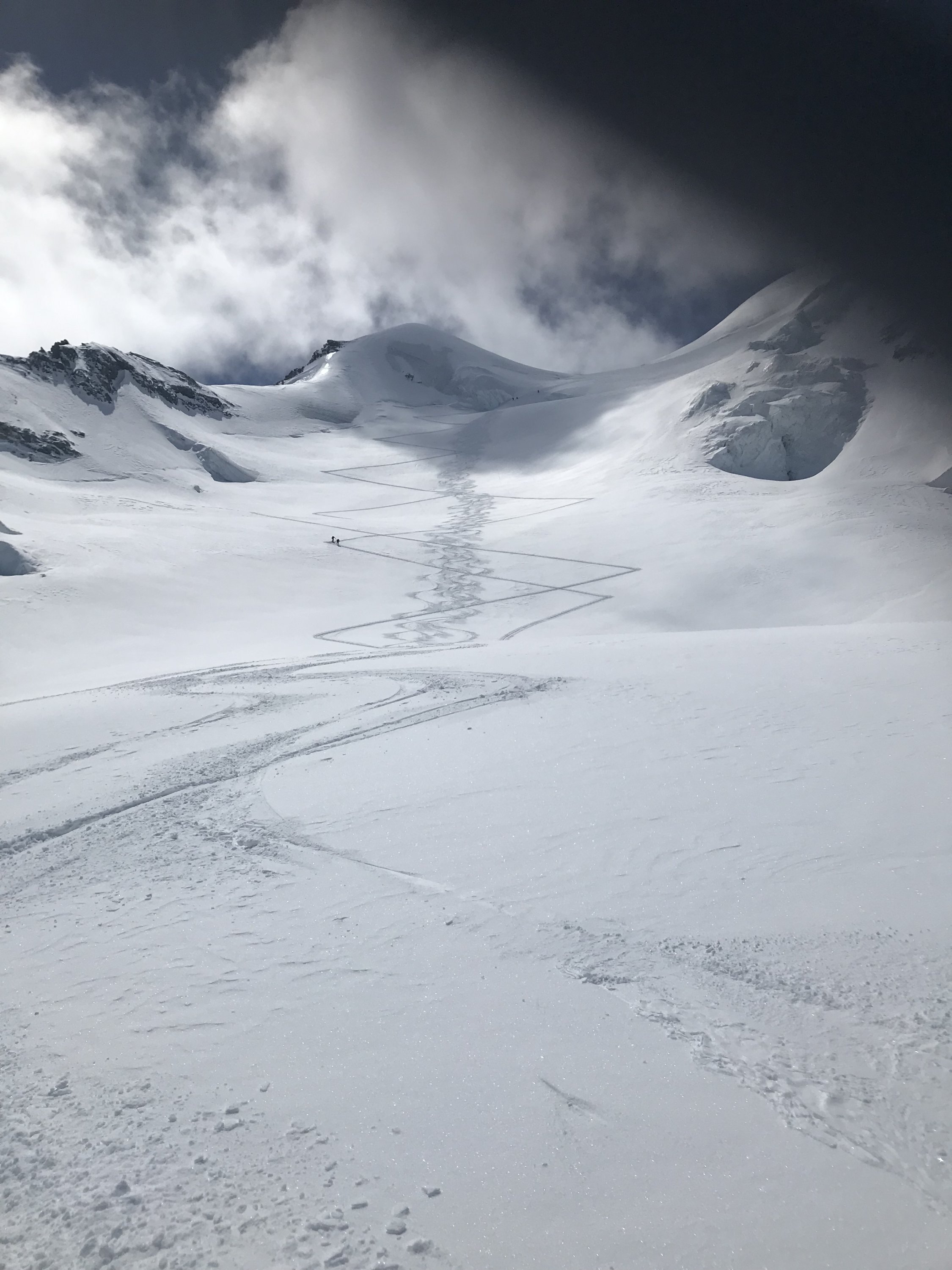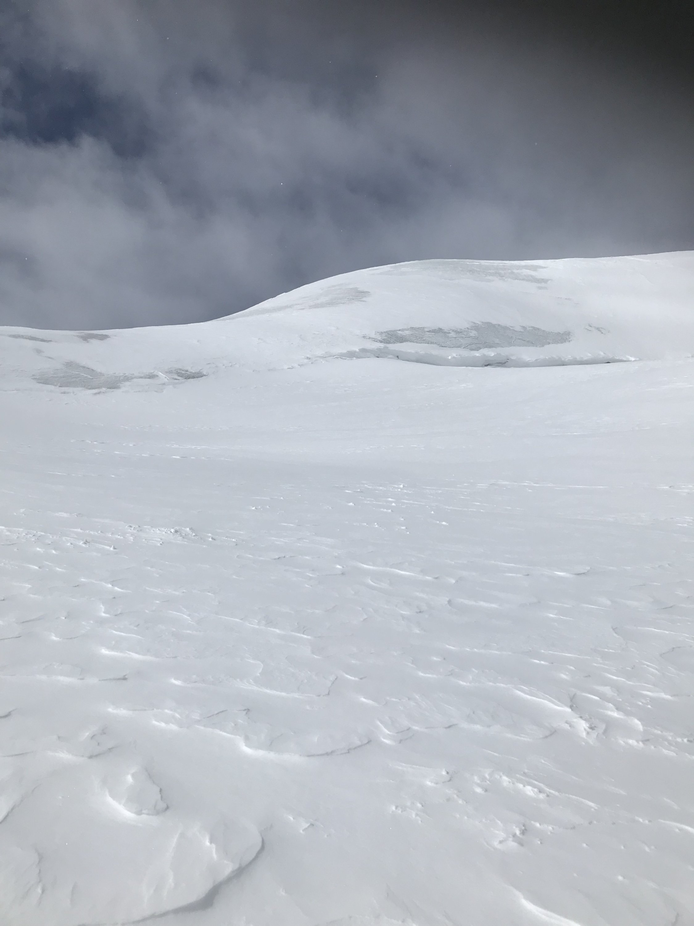Gletscher noch gut eingeschneit, am Hang zum Ostgipfel hatte es guten Trittschnee. Grat zum Hauptgipfel sehr Luftig. Die Verhältnisse müssen nach der Schlechtwetterfront neu beurteilt werden