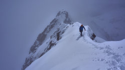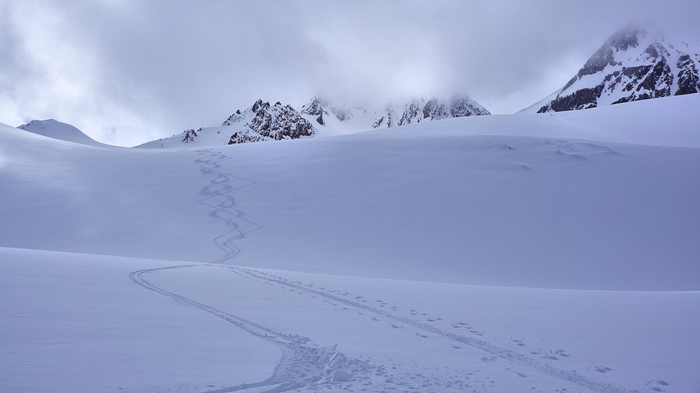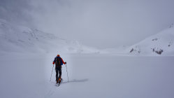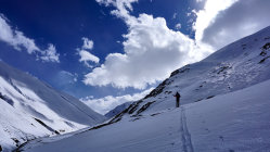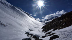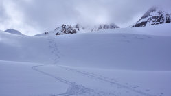 Ca. 6 KM ab Start Skitragen. Gletscher in gutem Zustand. Gipfelhang (35°+) eingeblasen. Alles unverspurt gewesen.