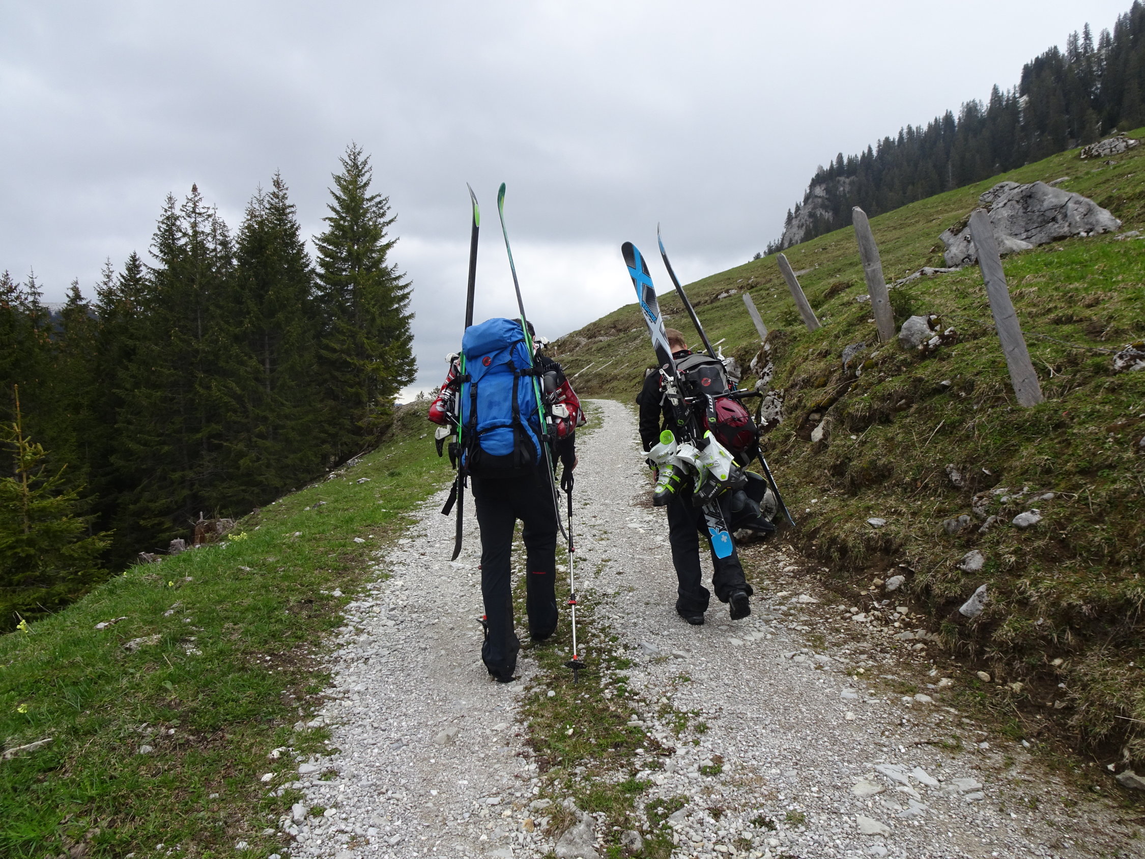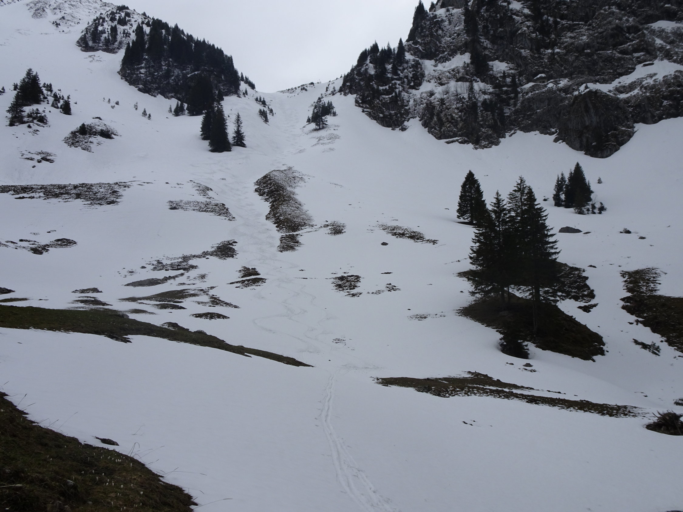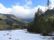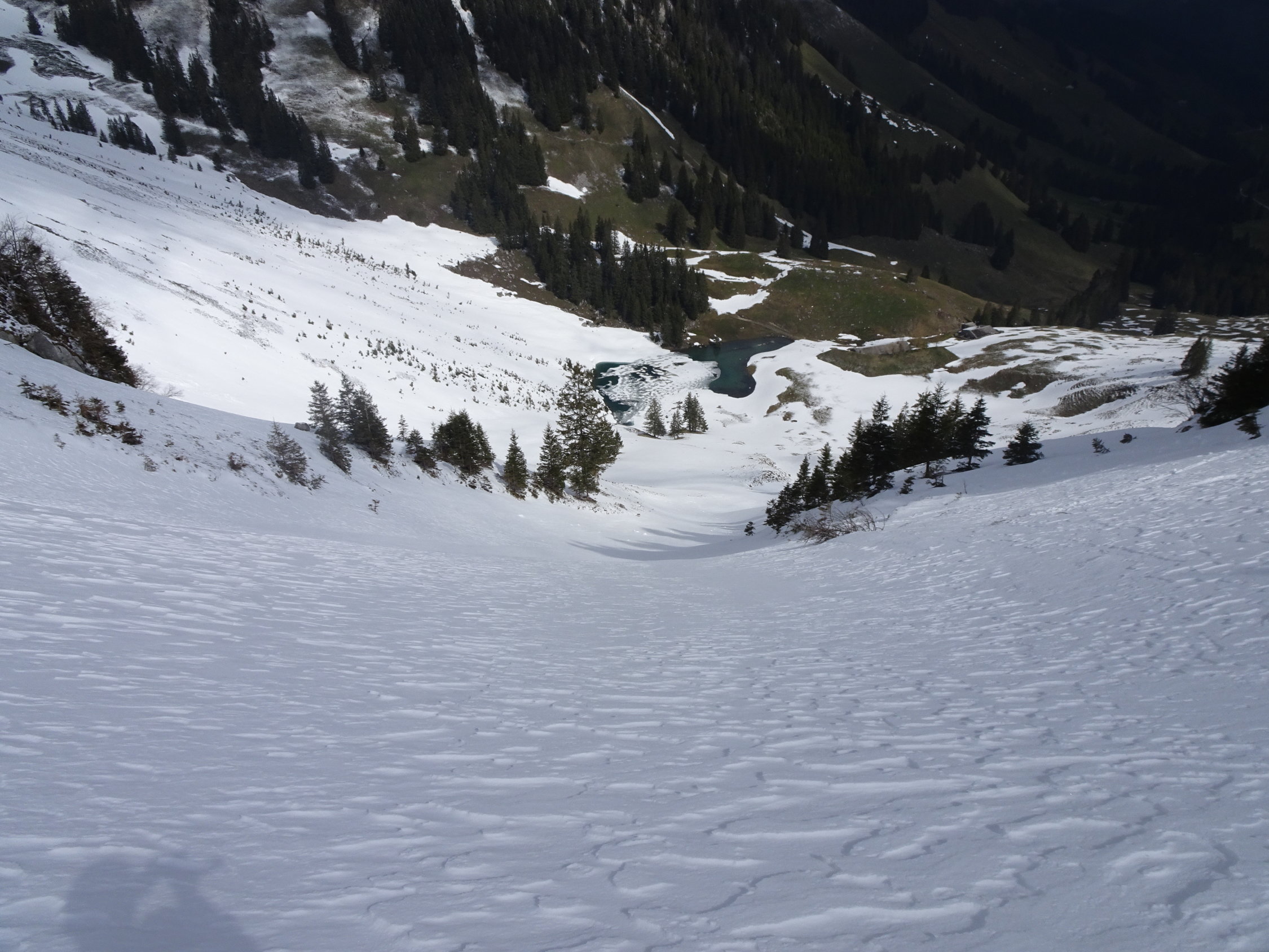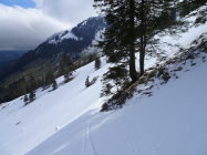 Da einer noch unbändigen Drang verspürte am Abend noch Arbeiten zu gehen, wählten wir ein nicht allzu fernes Ziel. Bei der Hengstkurve mit Blick in den Hengstschlund sahs aber mit dem Schnee düster aus. Es sollte sich aber lohnen. Wir fuhren bis zum Fahrverbot ca.1360m. Kurzes Skitragen dem Strässchen entlang bis ca.1450m(vor Alp Seeberg). Danach eine tolle Sache!