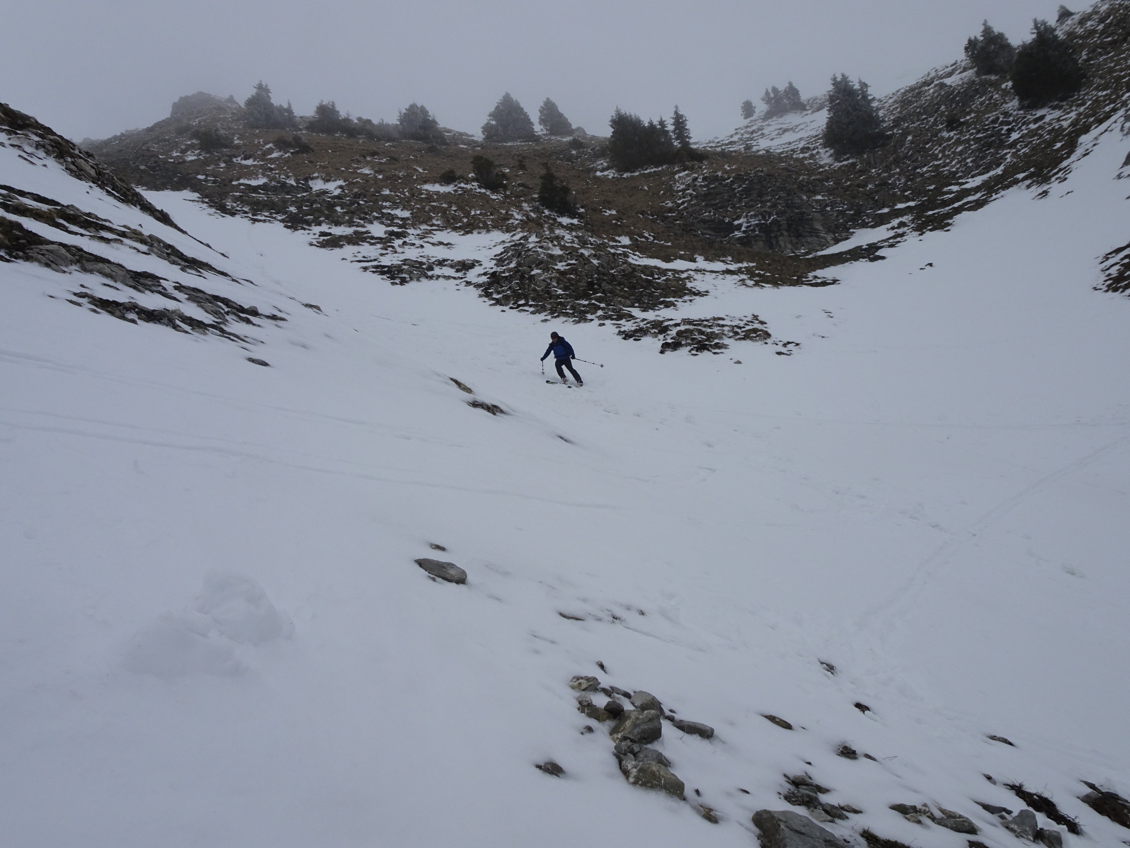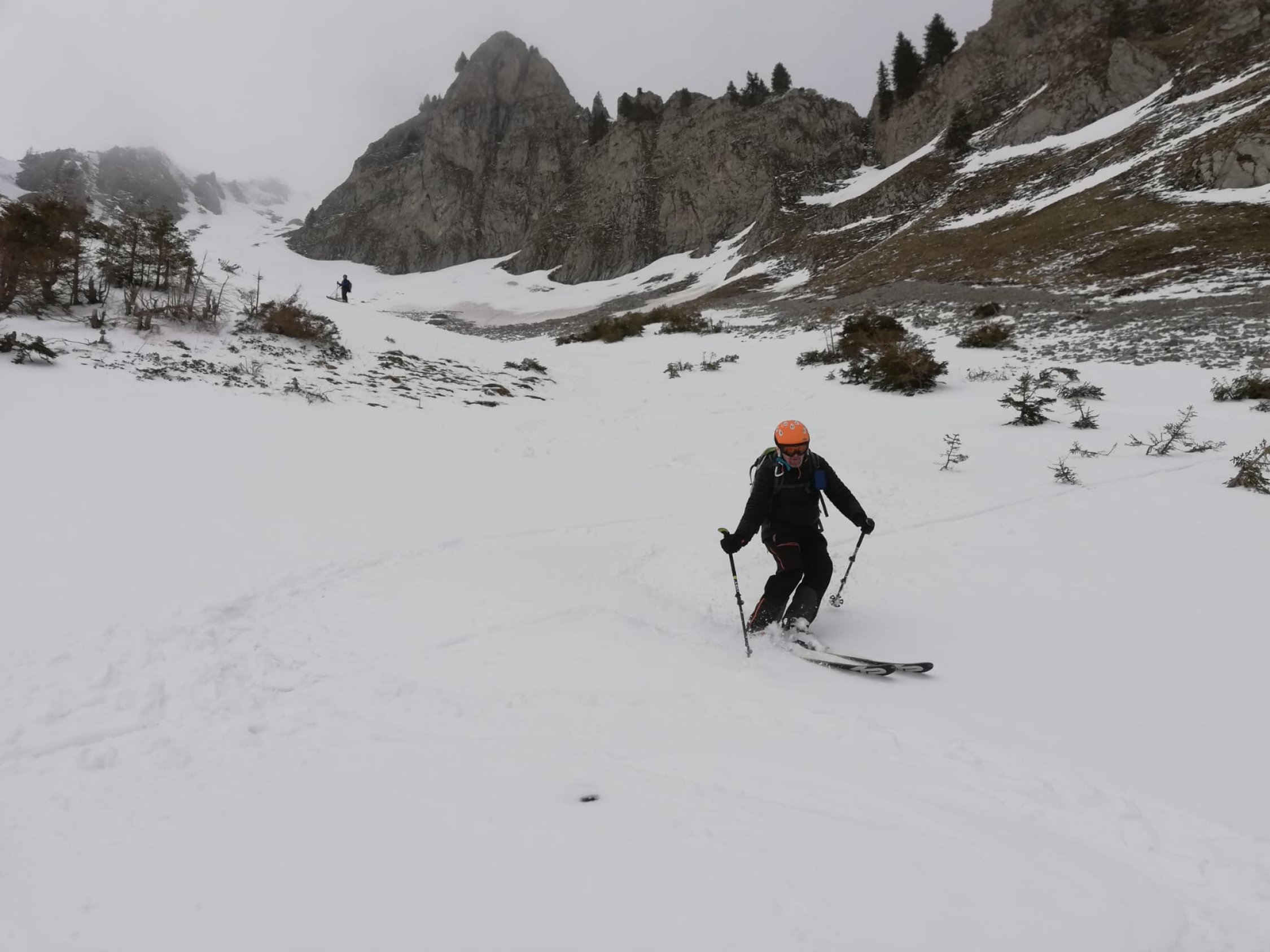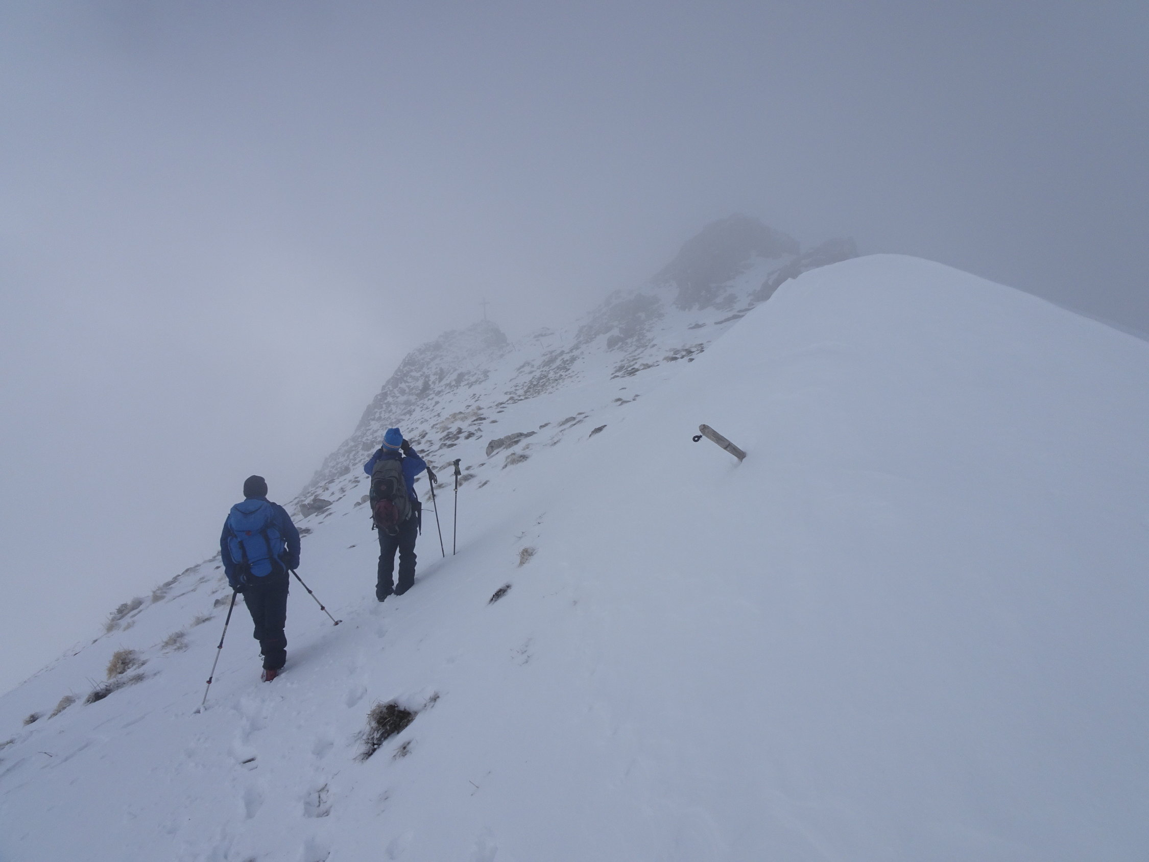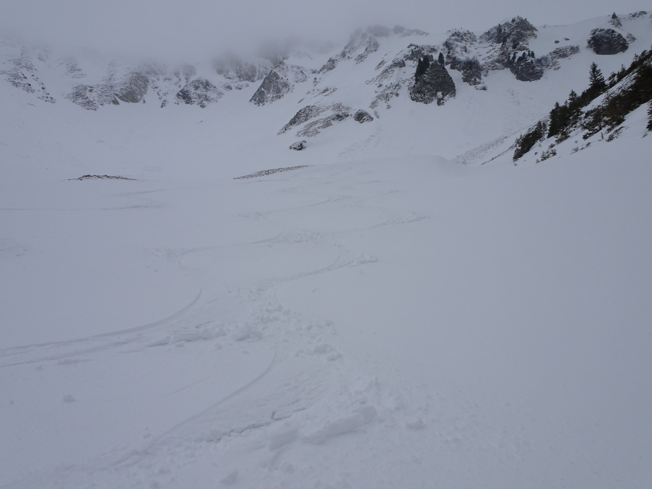 Wetter: aufgrund der starken Bise waren die vorderen Gipfel im Gurnigelgebiet(Chrummfadenflue, Gantrisch, Bürglen und Ochsen) allesammt in Wolken verhüllt. Nur an der Märe schien zeitweise die Sonne und wegen dem Aufstiegsverlauf aus dem Hengstschlund, waren wir mehrheitlich windgeschützt. Am Gipfel jedoch trübte es rasch ein und der hohe Nebel blieb leider auch während der Abfahrt.