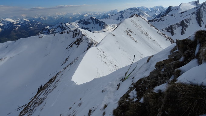 Ich bin heute durch das 2.couli links vom Schibespitz aufgestiegen und über den noch immer schneebedeckte Südseite dem Wanderweg nach zum Skidepot auf 2100m