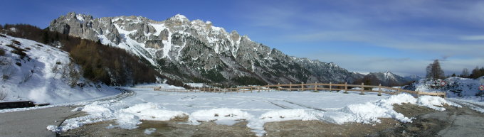 Bei Tourenbeginn am Passo di Campogrosso startete ein Skitourengeher mit Hund Richtung Monte Obante im Westen. Rifugio Campogrosso war bereits geöffnet. An der Forcella del Cornetto traf ich auf 2 Italiener, welche gerade vom Mte. Cornetto abgestiegen sind und deren Fußspuren im Schnee ich nutzen konnte. Sie stiegen vom Parkplatz am Pasubio-Monument auf und gingen den Sentiero del Sengio Alto in umgekehrter Richtung an. Ursprünglich wollte ich über die Westseite (Klettersteig Nr. 176, Malga Boffetal, Fernwanderweg 05) zurücklaufen. Wegen der Schneemengen dort disponierte ich jedoch um und es entstand die hier beschriebene Route über den Sentiero Peruffo Bruno zurück über die Ostseite.