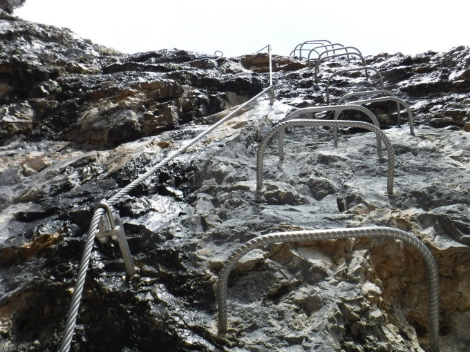 Bei Nässe sind die Querpassagen ohne Eisenbügel in der Ferrata Ezio Ferrari etwas schwieriger.