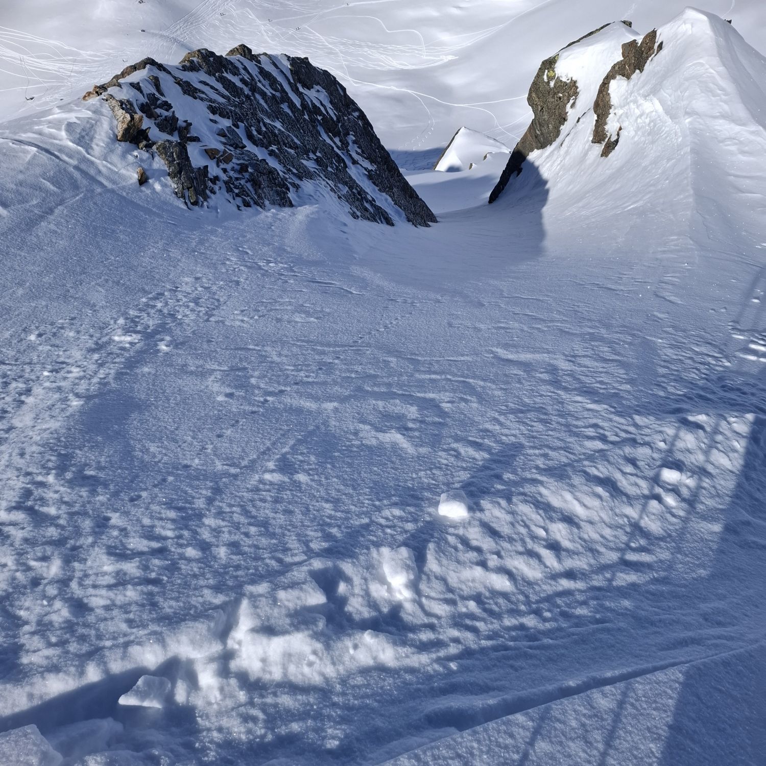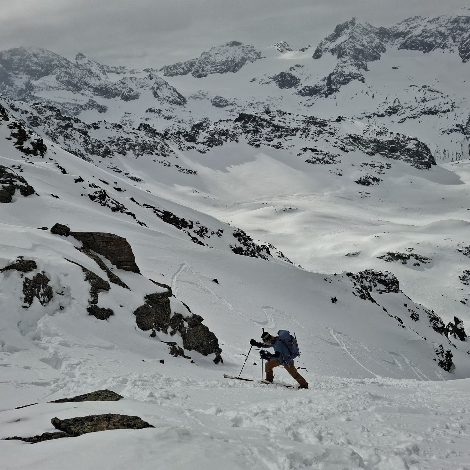 Abfahrt in ausgezeichnetem Pulver bis in die Fläche. Das Wetter hatte sich mittlererweile verschlechtert, Nebel kam auf und es schneite leicht. Anstieg zum Rauhkopfgletscher und dann Abfahrt zur Wiesbadener Hütte.
