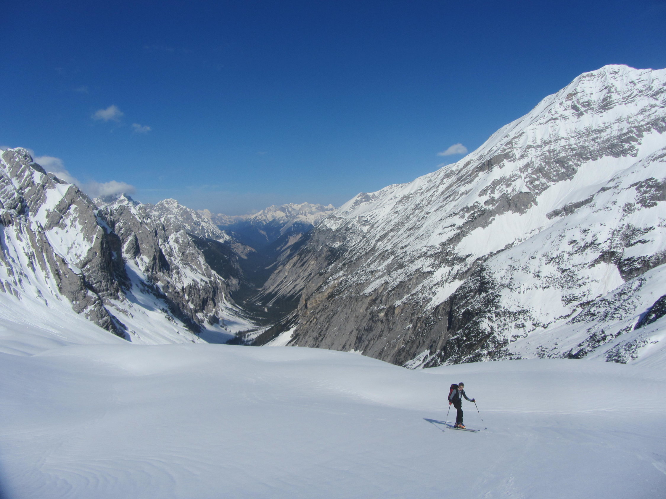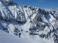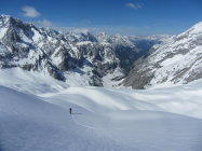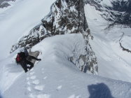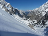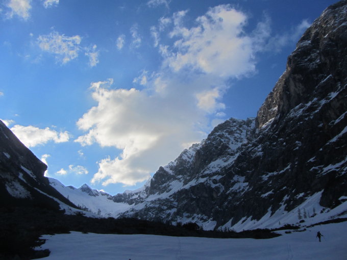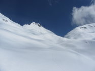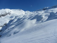 Der letzte Neuschnee hatte sich noch nicht in Firn umgewandelt. Im Aufstieg unten weich, dann z.T. tragfähiger Deckel mit gesetztem Schnee darunter, z.T. mehrere Zentimeter eingesunken. In der Abfahrt um 11 Uhr ca.10cm weicher Pflotsch, der sich einigermaßen fahren ließ.
