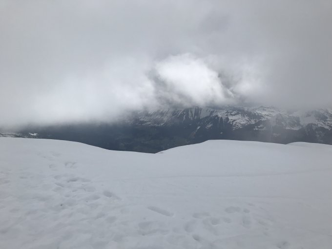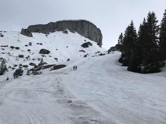 Schneebeschaffenheit: ca. 20 bis 30 cm relativ grundloser weicher nicht allzu alter Schnee, darunter jedoch schon recht kompakter Schnee (wahrscheinlich auf Grund der Wärme im April). Daher aus unserer Sicht Ifen heute gut vertretbar.