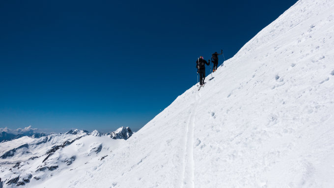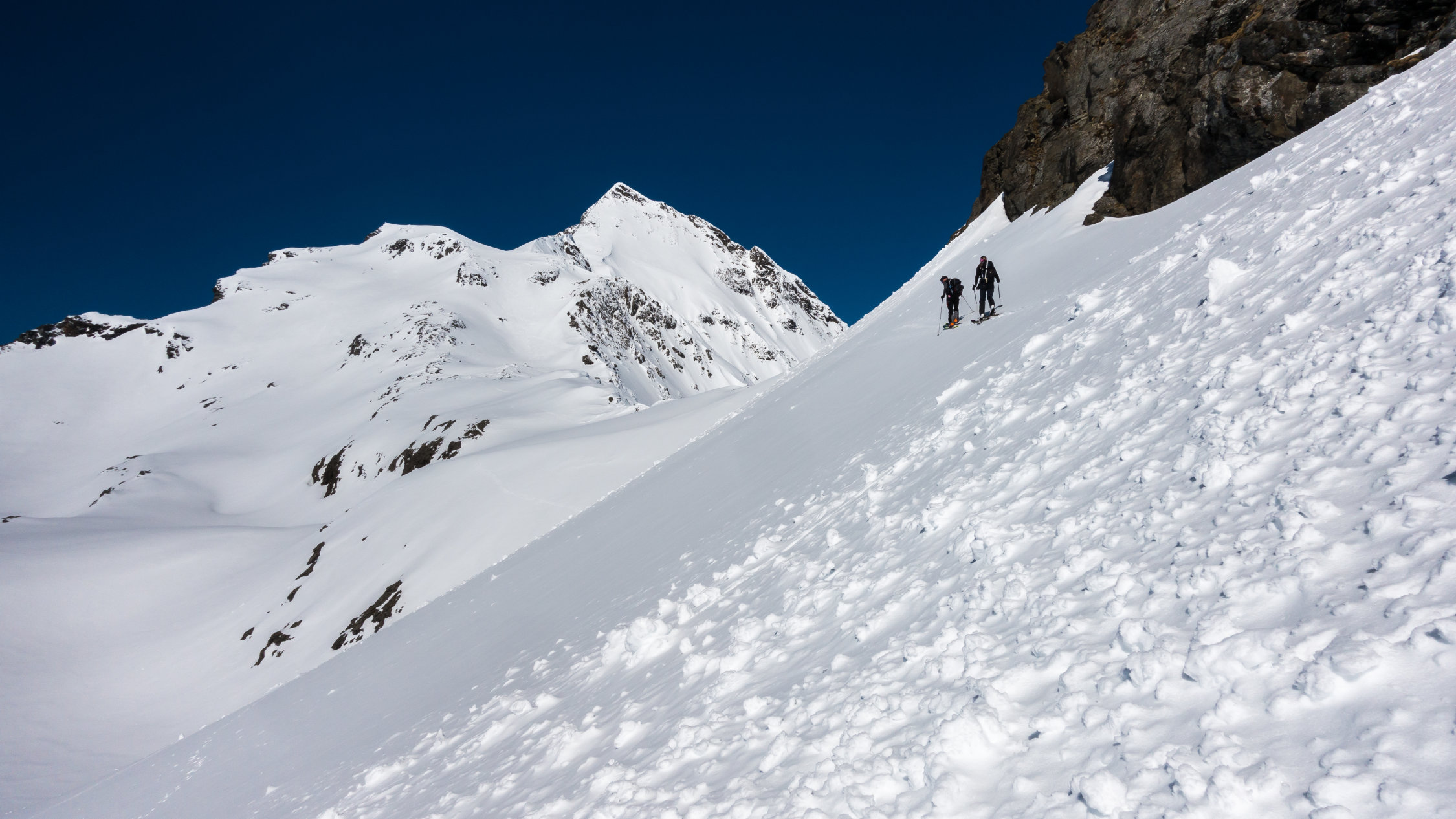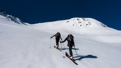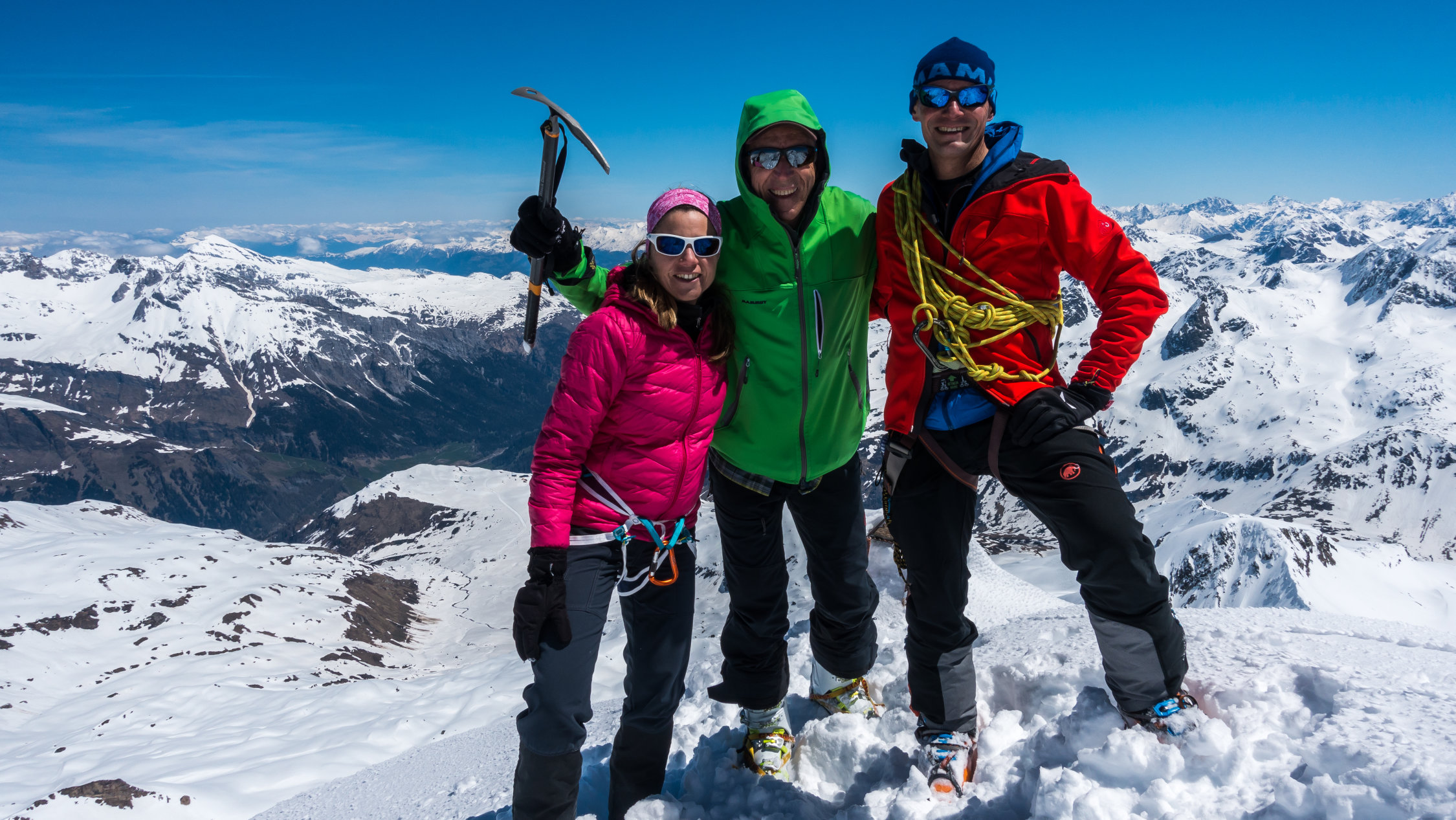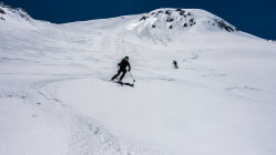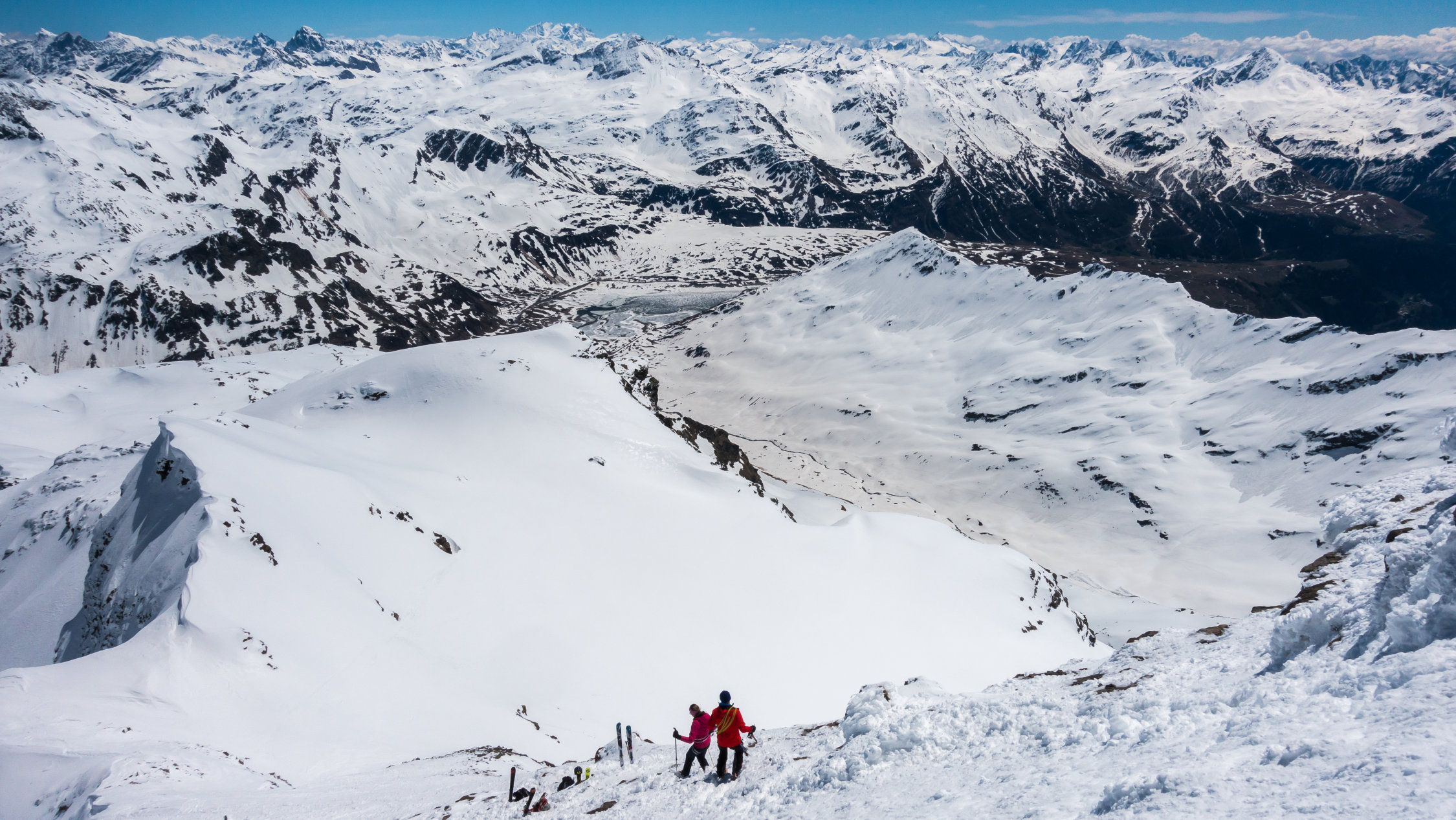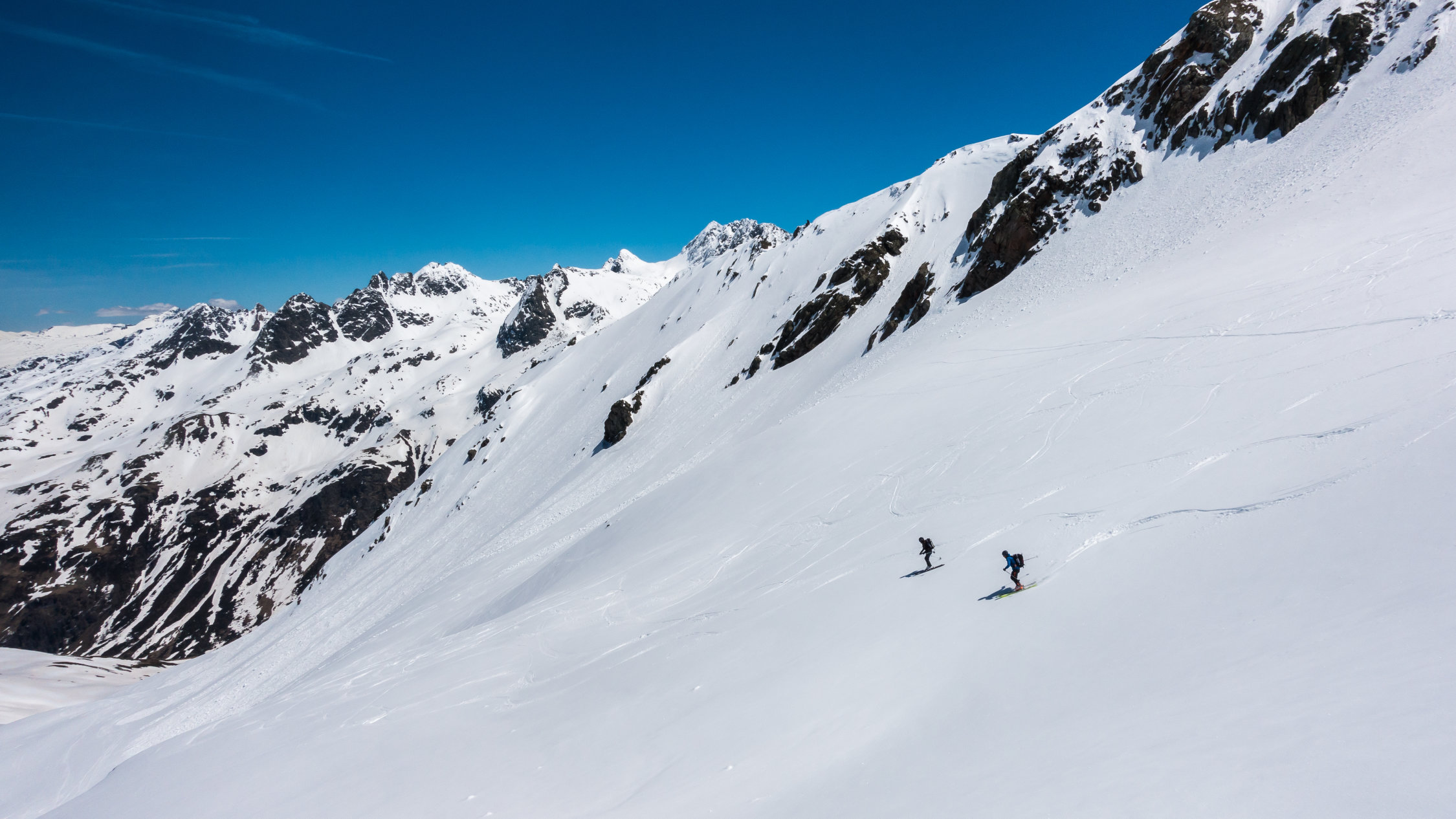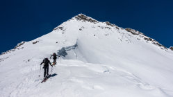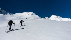 Start beim Berghaus an der Passstrasse um 7 Uhr bei 0°, Schneedecke pickelhart gefroren, wolkenlos, windstill. Noch massenweise Schnee wie im tiefen Winter. Herrlicher Aufstieg, beim Sattel unterhalb des Lattenhorns sehr rutschig, hier Ski über gute, steile Tritte ca. 50 Hm kurz getragen. Die lange Traverse entlang des Lattenhorns hat nun eine gute Spur. Skidepot heute weit oben auf knapp 3200m, ab dort mit Steigeisen und Pickel auf weichem Trittschnee zum Gipfel. 1-2 Passagen ziemlich exponiert, aber mit der nötigen Vorsicht gut machbar. Da es glücklicherweise in der Gegend keinen Neuschnee gegeben hat, herrschen auf der Abfahrt super Sulzschnee-Verhältnisse. Wir waren auf der Abfahrt nach 12 Uhr leider etwas zu spät, sodass der Schnee teilweise schon ziemlich schwer war, aber immer noch gut zu fahren.