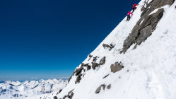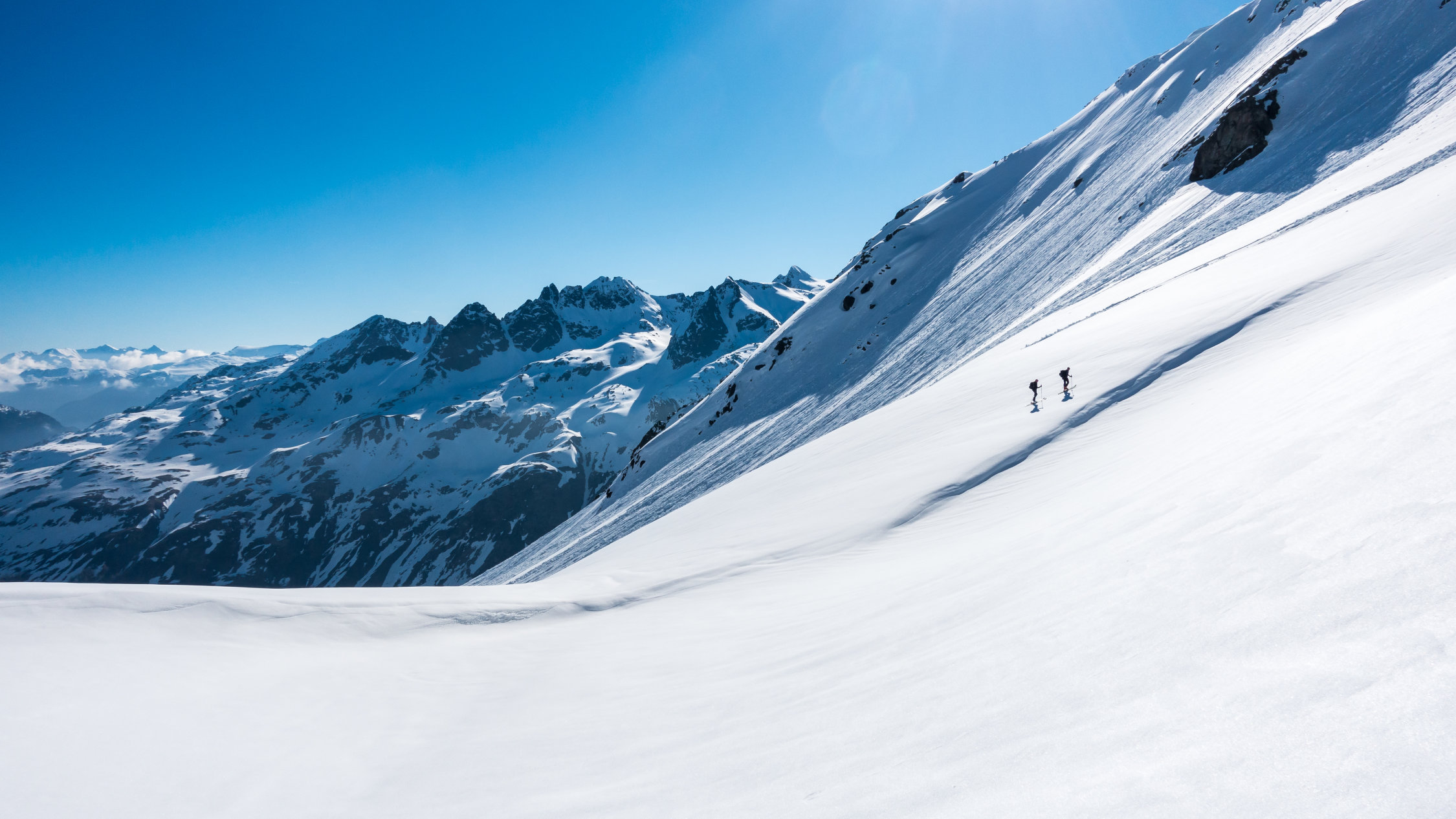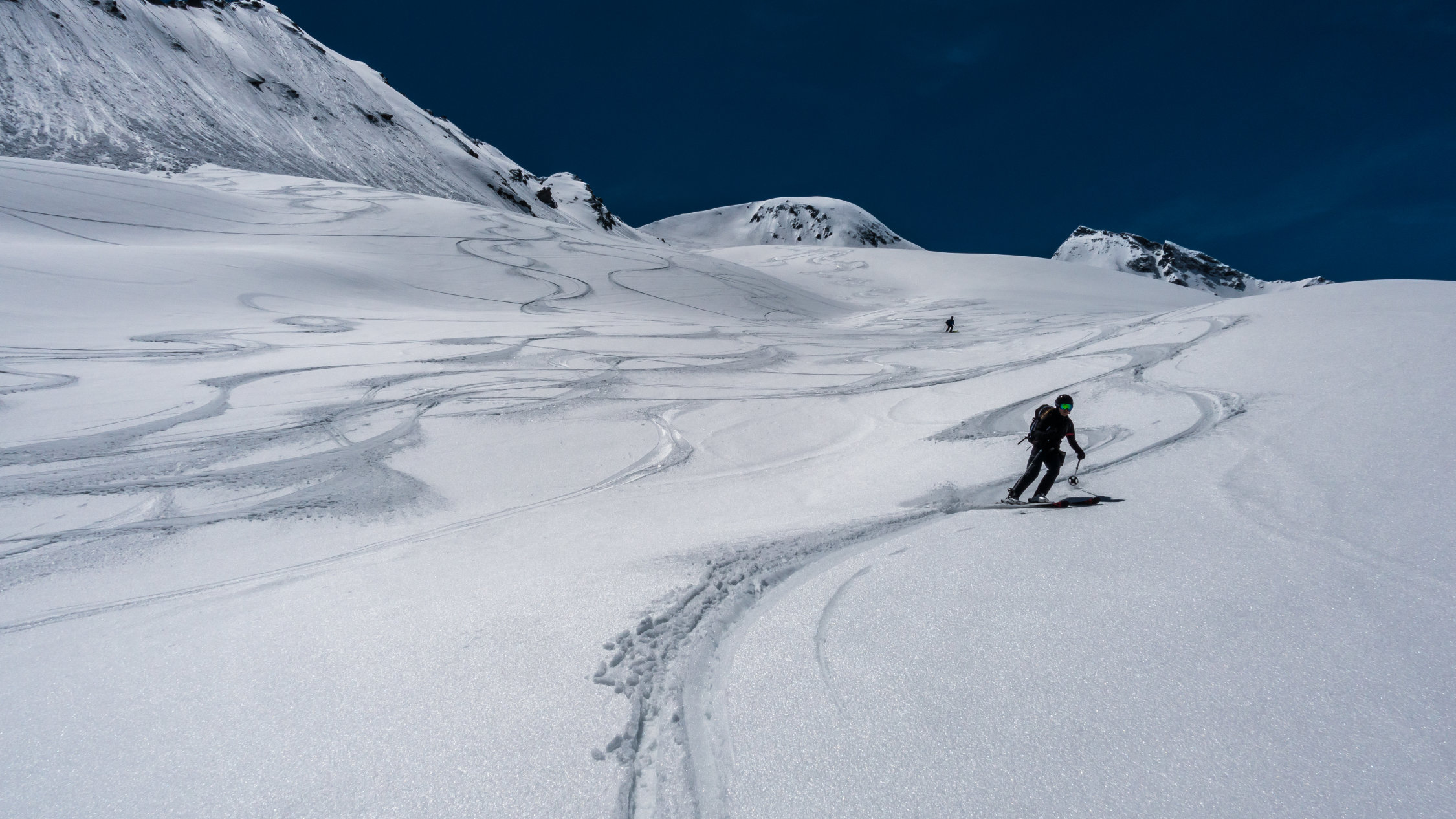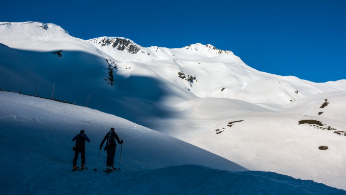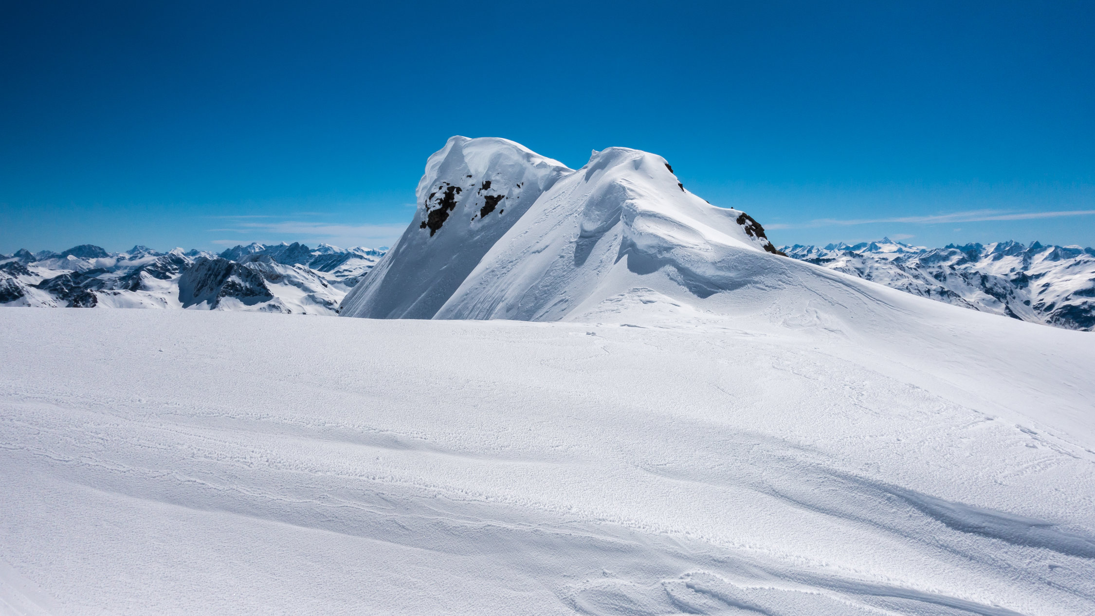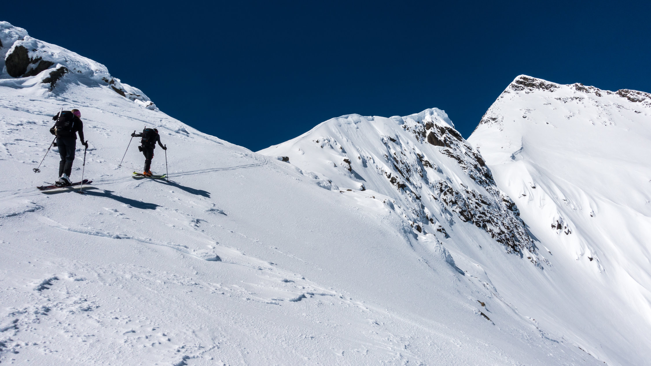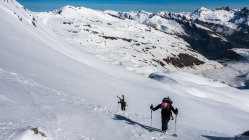 Start beim Berghaus an der Passstrasse um 7 Uhr bei 0°, Schneedecke pickelhart gefroren, wolkenlos, windstill. Noch massenweise Schnee wie im tiefen Winter. Herrlicher Aufstieg, beim Sattel unterhalb des Lattenhorns sehr rutschig, hier Ski über gute, steile Tritte ca. 50 Hm kurz getragen. Die lange Traverse entlang des Lattenhorns hat nun eine gute Spur. Skidepot heute weit oben auf knapp 3200m, ab dort mit Steigeisen und Pickel auf weichem Trittschnee zum Gipfel. 1-2 Passagen ziemlich exponiert, aber mit der nötigen Vorsicht gut machbar. Da es glücklicherweise in der Gegend keinen Neuschnee gegeben hat, herrschen auf der Abfahrt super Sulzschnee-Verhältnisse. Wir waren auf der Abfahrt nach 12 Uhr leider etwas zu spät, sodass der Schnee teilweise schon ziemlich schwer war, aber immer noch gut zu fahren.