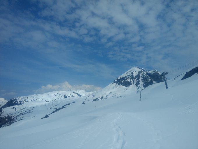 Es dürfte noch ein paar klare Nächte haben, unter ca 1900 bis 2000m kaum Neuschnee. Darüber ist er noch nicht ganz umgewandelt, es hat trotz klarer Nacht schon um 10 ziemlich aufgemacht.