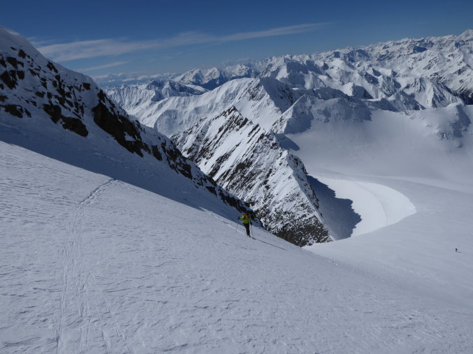 Wir fuhren über das Steinschlagtal ab, man sollte jedoch früh genug dran sein. So gegen 10-11 sonst wird es schnell zu weich bei den momentanen Temperaturen. Am Ende des Steinschlagtals rechts halten um zu der Piste zu gelangen, sonst muss man die Ski gut eine viertel Stunde bis zum Auto tragen