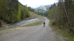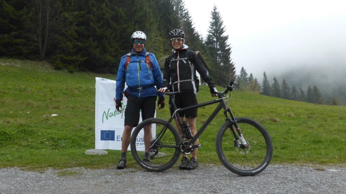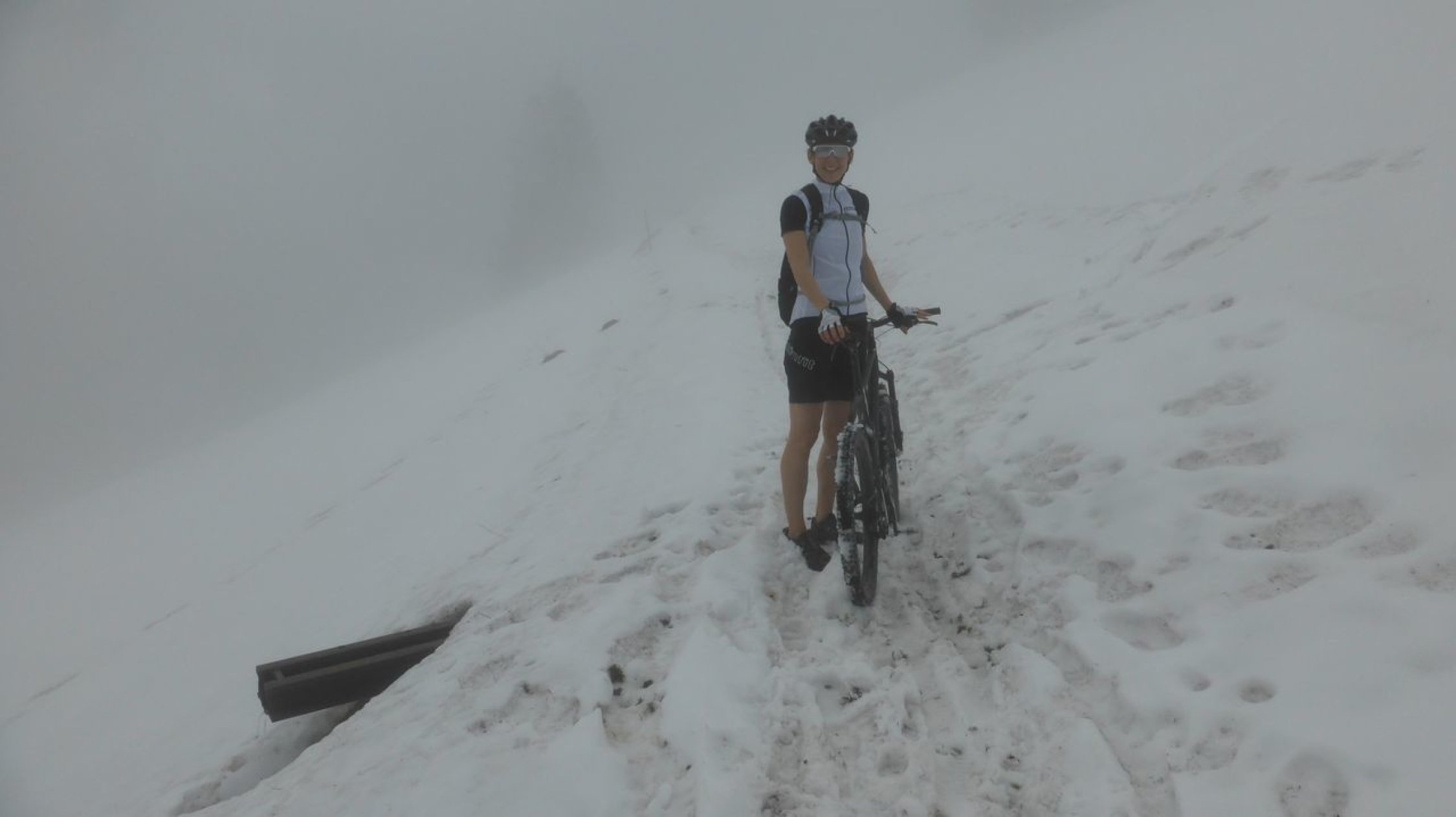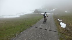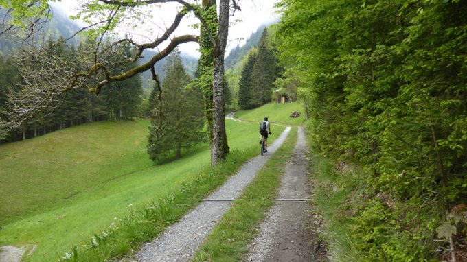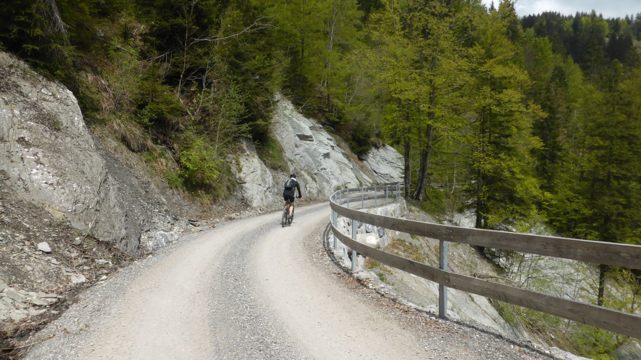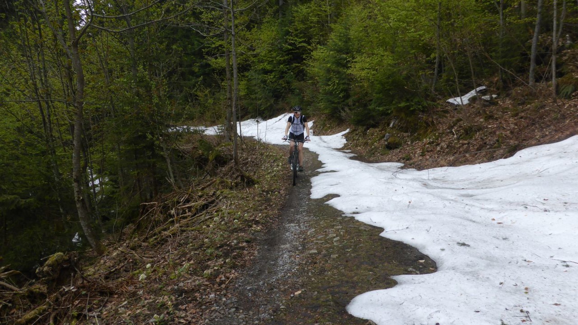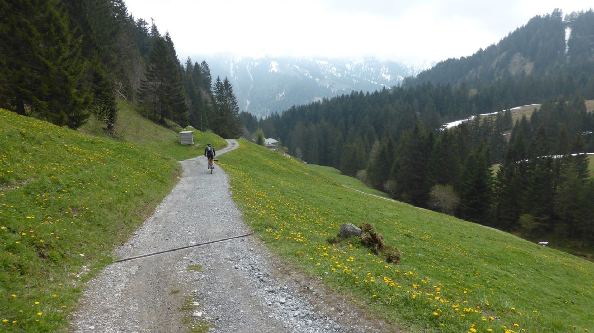 Nach der Hinterberg-Alpe mussten wir das Rad ca. 100m im Schnee schieben, ebenso etwas unterhalb der Alpe. Ansonsten ist alles bis auf die kurze Schiebepassage frei befahrbar, wenn man genug Kraft und Ausdauer beim Anstieg nach der Rappenlochbrücke hat. Im Bereich Schuttannen bis Fluhereck hatten wir Nebel mit entsprechend kühleren Temperaturen. Ansonsten waren diese angenehmen. Natürlich war es noch sehr feucht und das Rad benötigte eine ordentliche Reinigung.