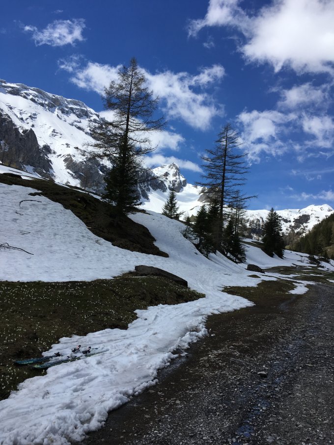 Ab Iffigenalp bis zur Brücke, ca 15 Minuten Ski getragen. Ab da, auf leicht gefrorener, fast durchgehender Schneedecke aufgestiegen. Bis zum See einige Lawinenkegeln umgangen. Seequerung heute problemlos.